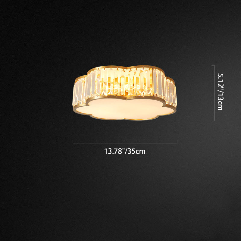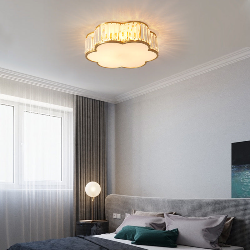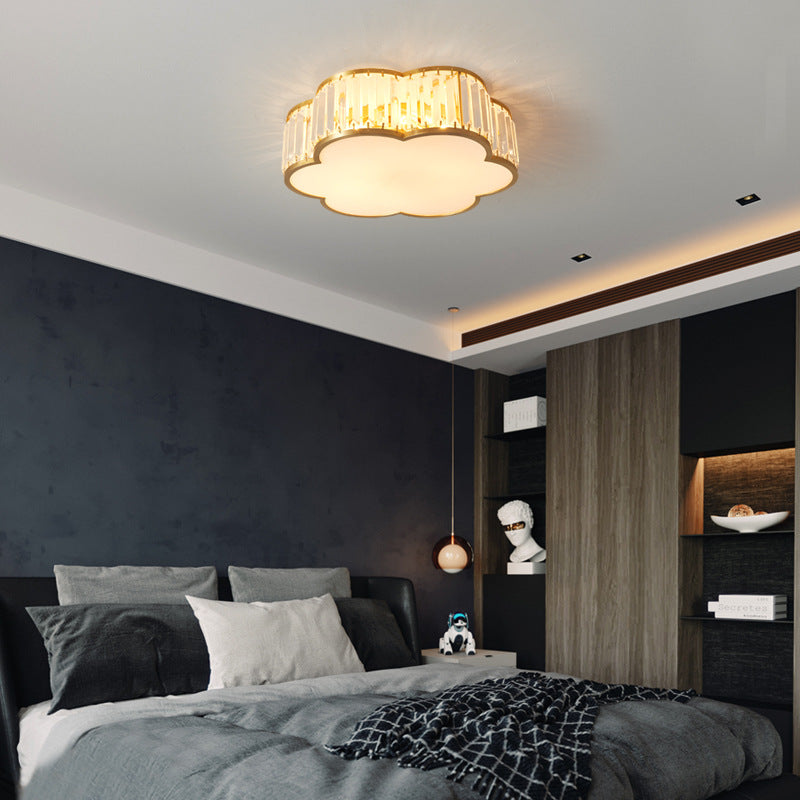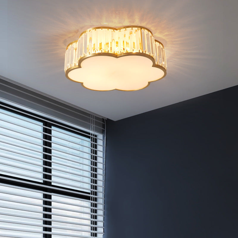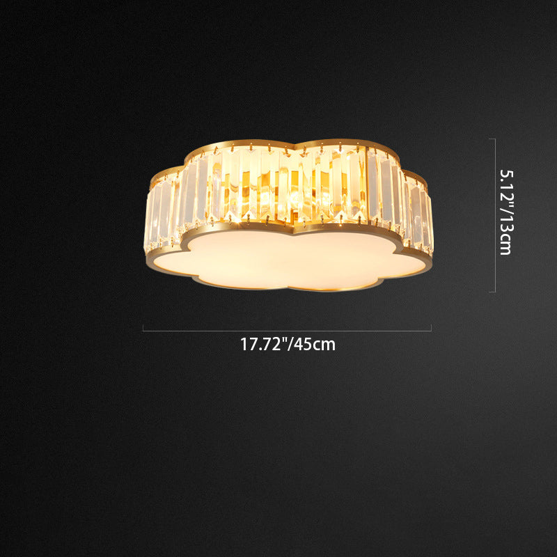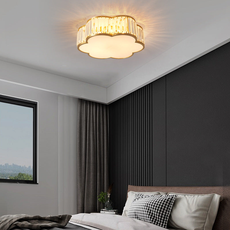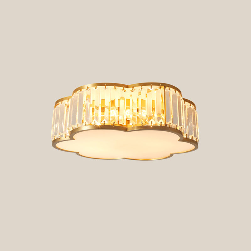 مصباح سقف فاخر معاصر بإطار نحاسي كامل مع غطاء زهرة كريستالية، 3/4 ضوء، مثبت بشكل مسطح لغرفة النوم
