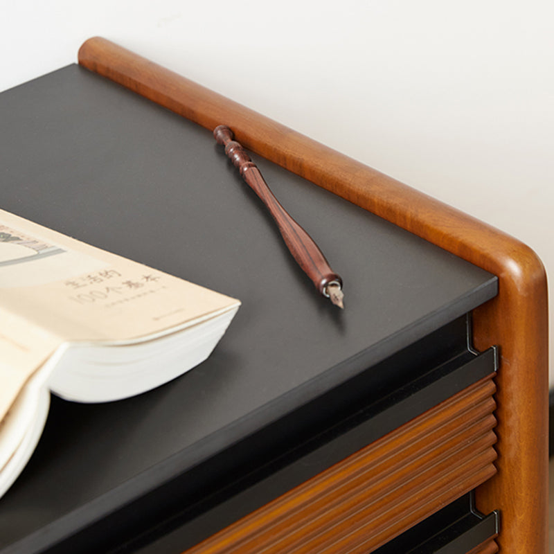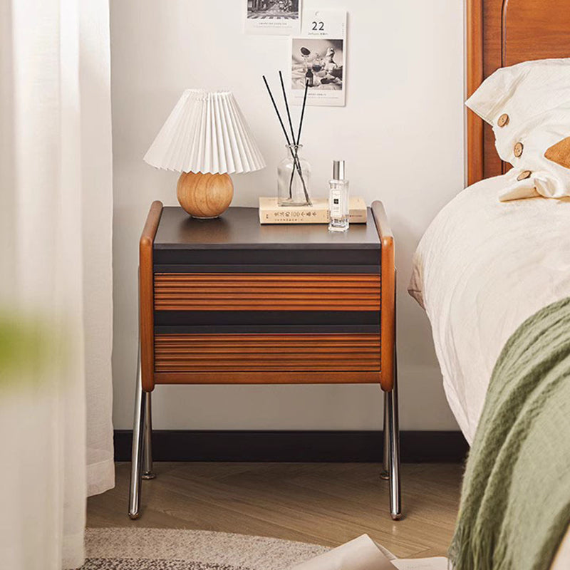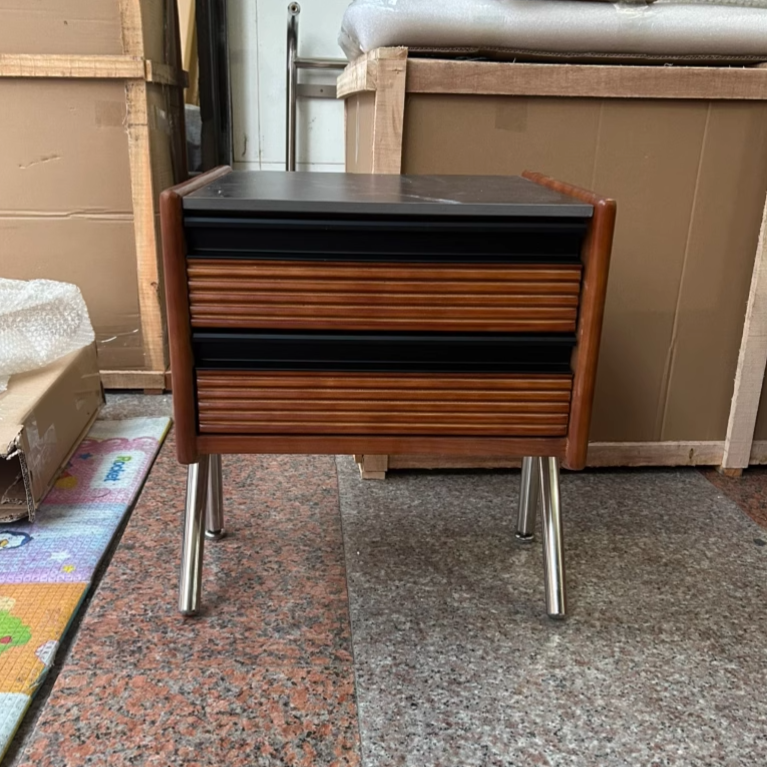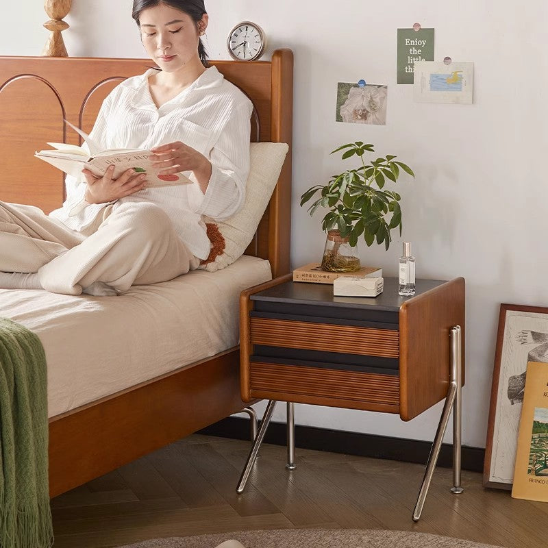Made from rock slab, pine, boxwood, and stainless steel, this Nordic-style nightstand features a modern square shape and two smooth-sliding drawers. The warm wood finish blends effortlessly with contemporary bedrooms or living rooms, offering both function and style.