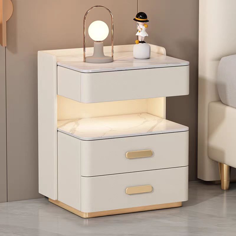 Contemporary Nordic Square Cube Solid Wood Leather Rock Board Sensor Light Safe Nightstand 3 - Drawer For Bedroom