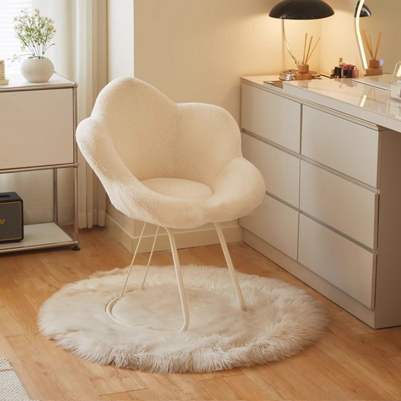 This Nordic-style vanity stool features a cozy lambswool finish and a charming petal-shaped design, complete with backrest and armrests for added comfort. The seat is available in both swivel and non-swivel options, offering flexibility to match your bedroom or dressing space perfectly—available in white, grey, and pink.