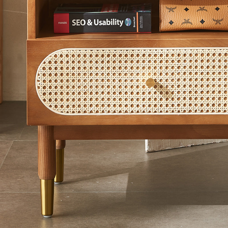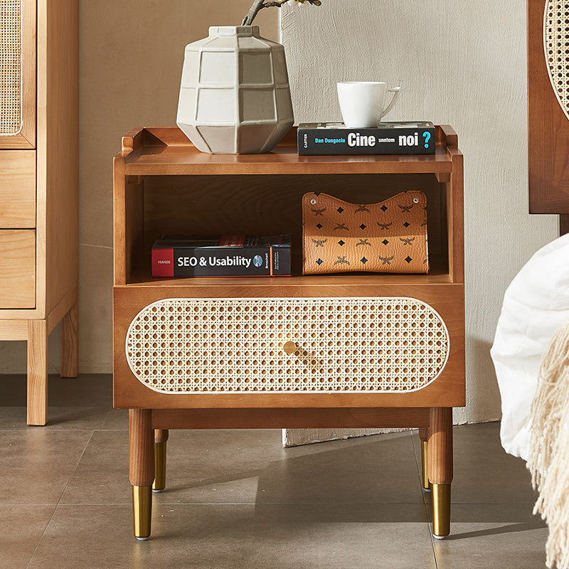 Contemporary Nordic Wood & Rattan Square Nightstand With 1-Drawer For Bedroom & Living Room