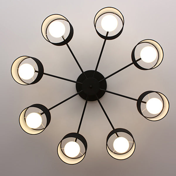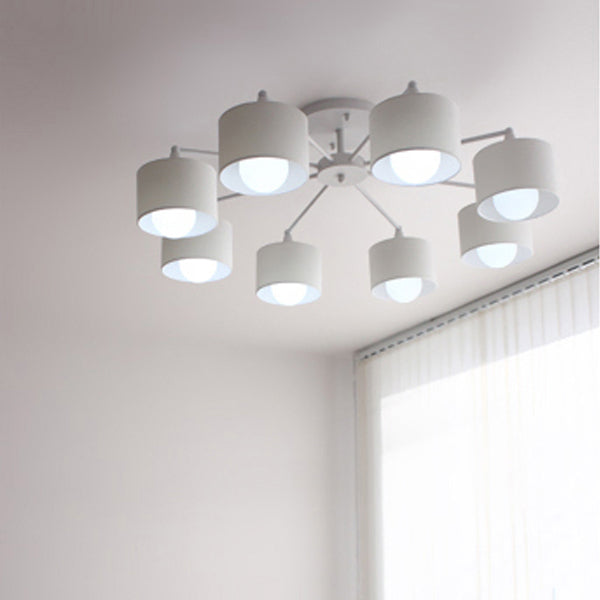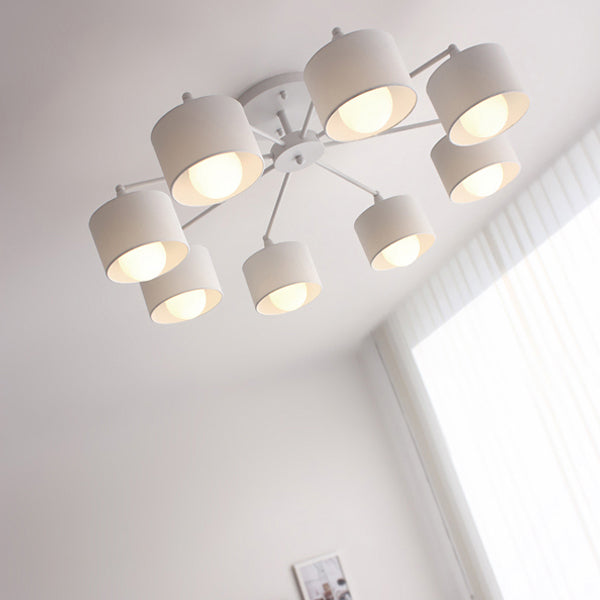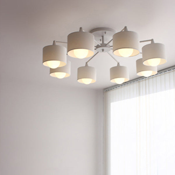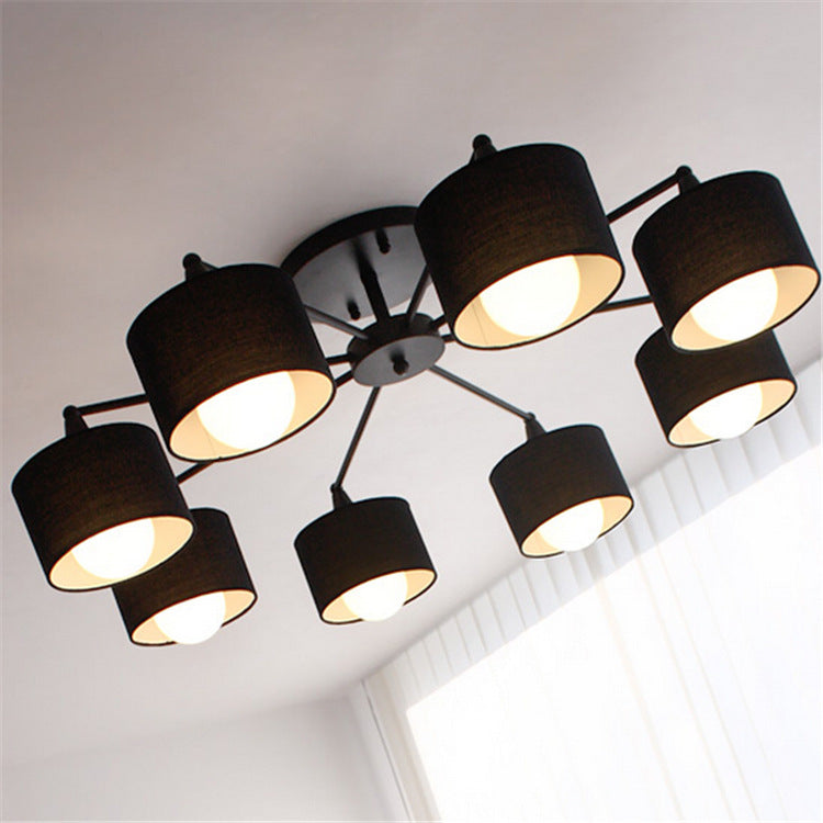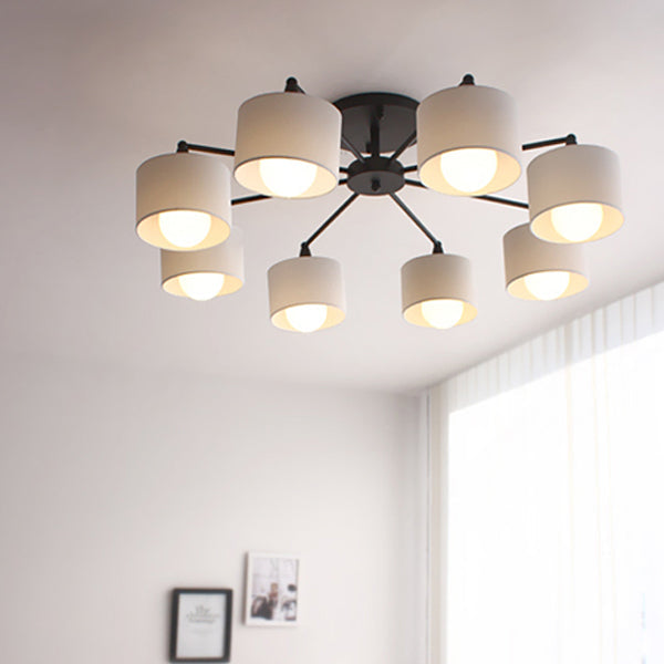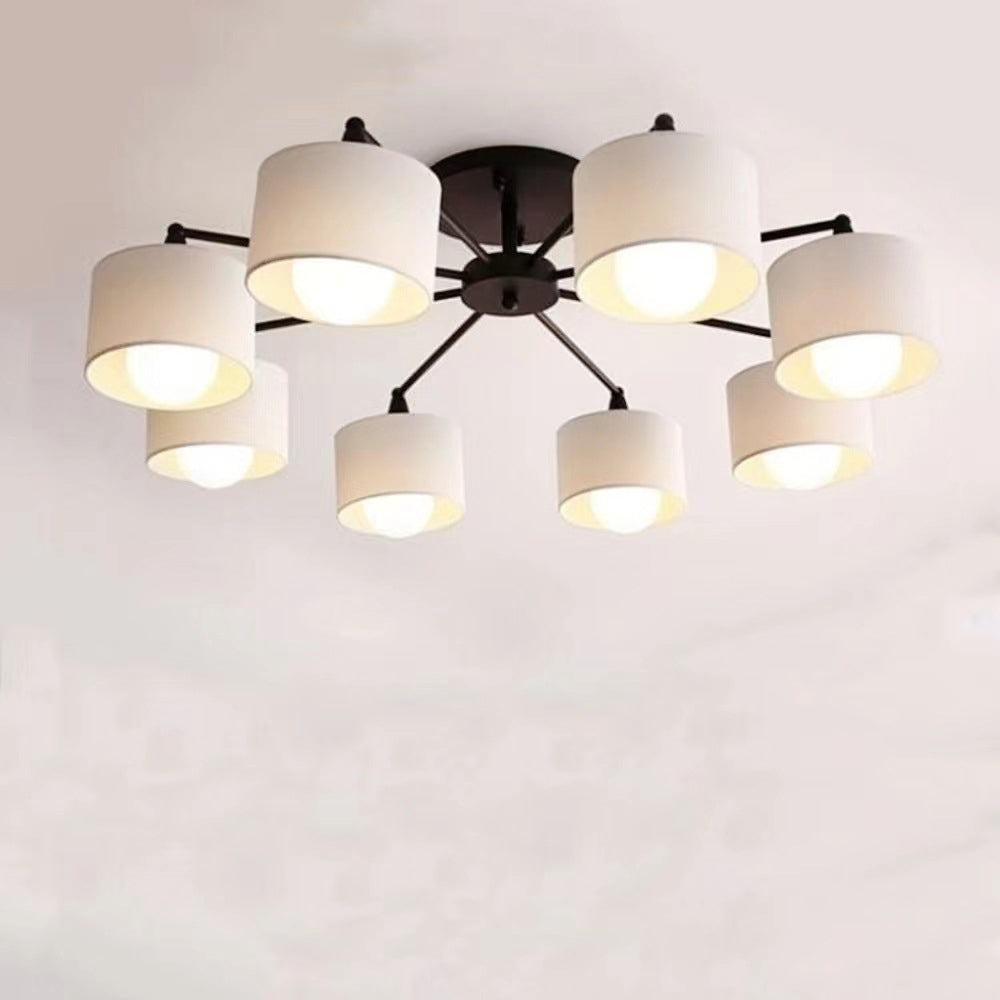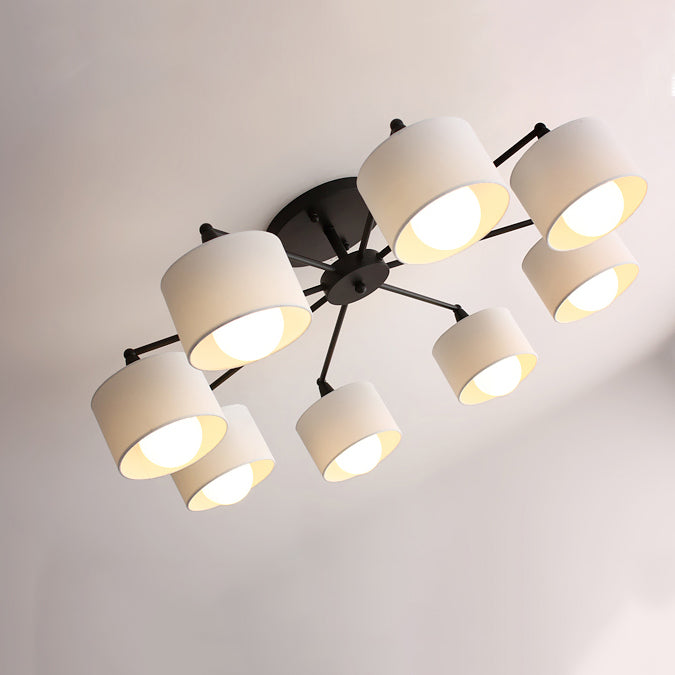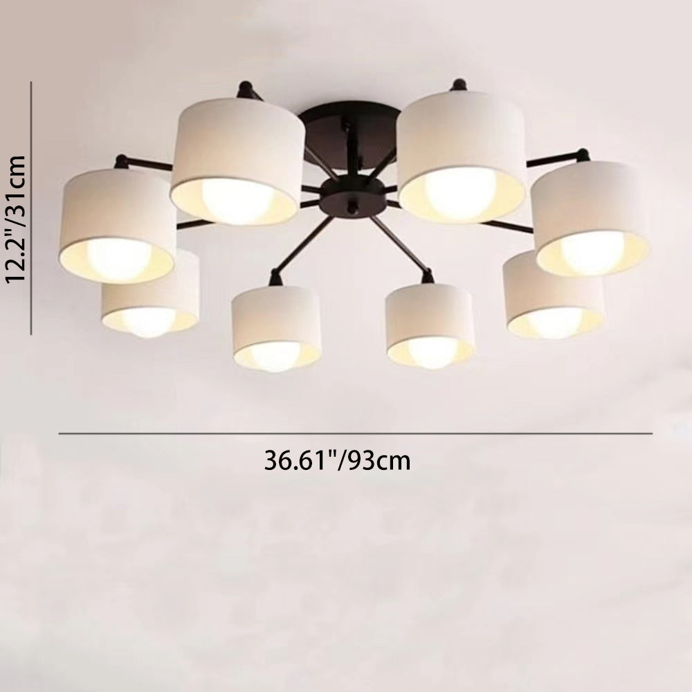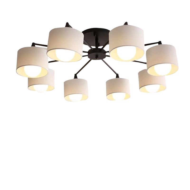 مصباح سقف اسكندنافي معاصر مصنوع من قماش حديدي أسطواني الشكل، مزود بثمانية مصابيح، ومثبت بشكل نصف مسطح، لغرفة المعيشة