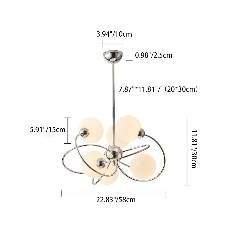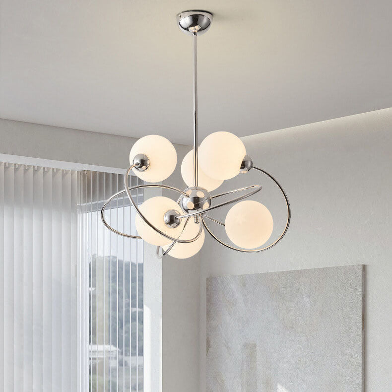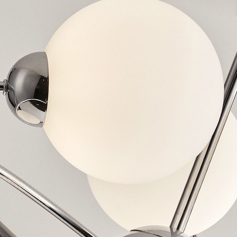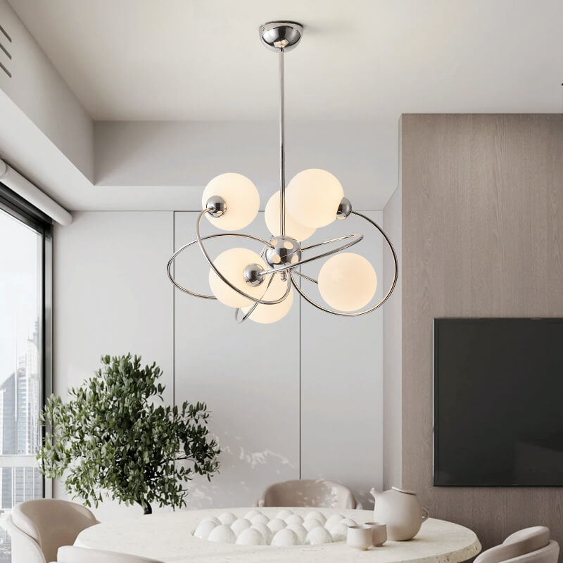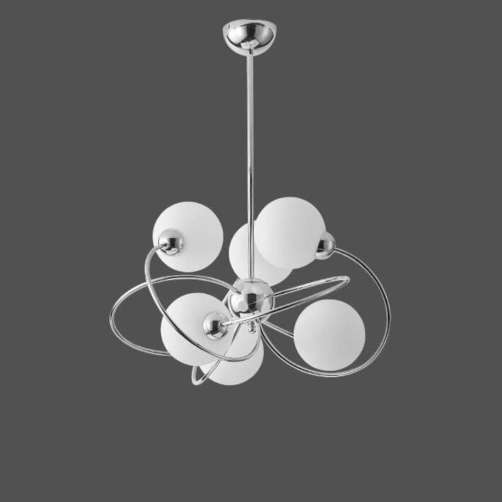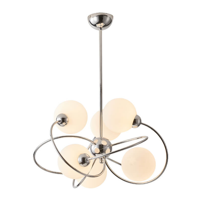 ثريا عصرية من منتصف القرن مصنوعة من الزجاج الأبيض الحليبي مع حلقة كروم بستة مصابيح لغرفة المعيشة