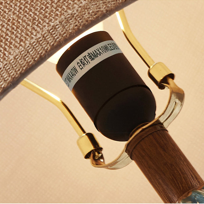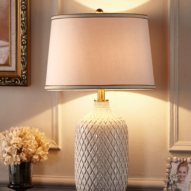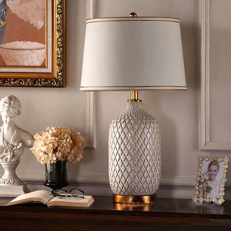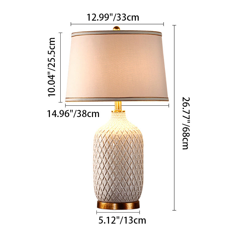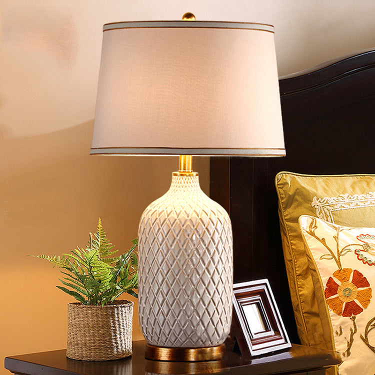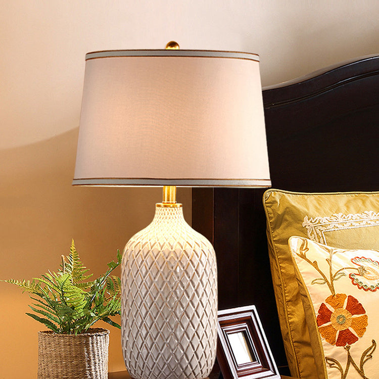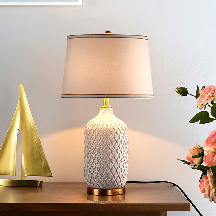 Modern Minimalist Checkered Vase Ceramic Base Cylinder Fabric Cover Metal 1-Light Table Lamp For Bedroom