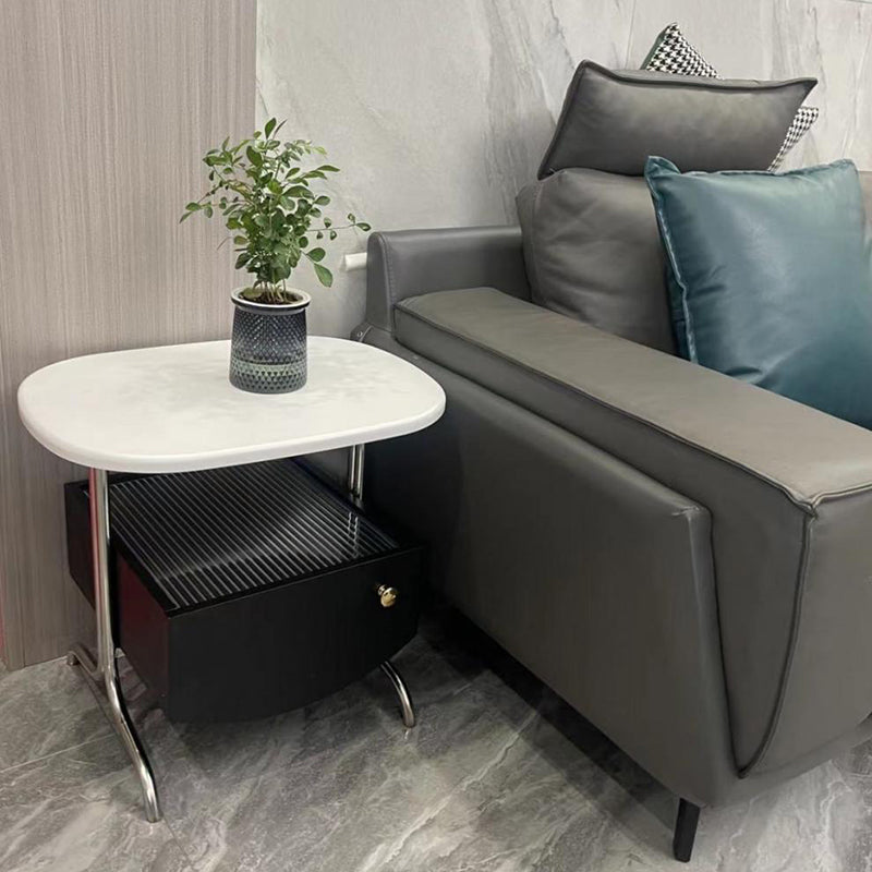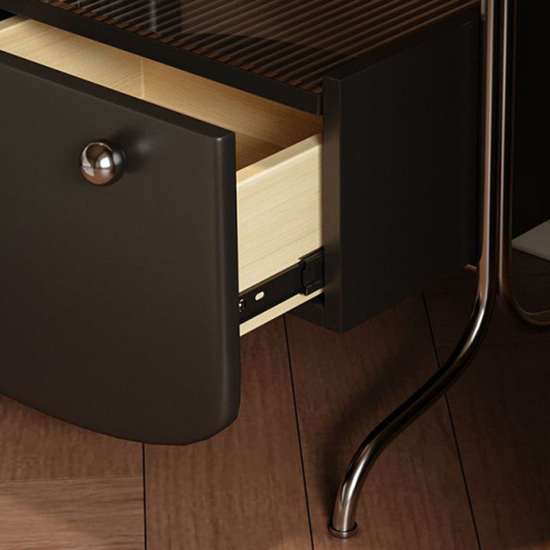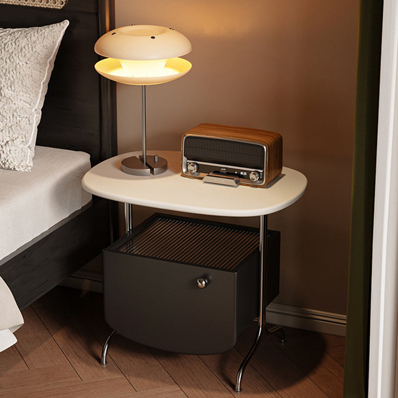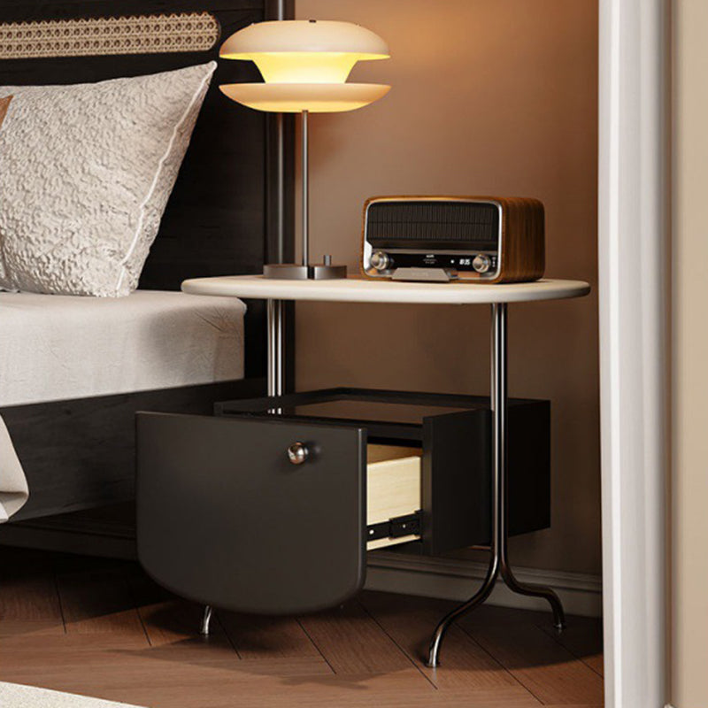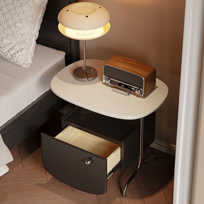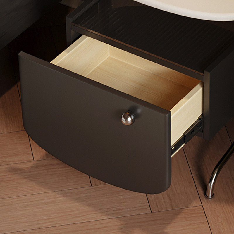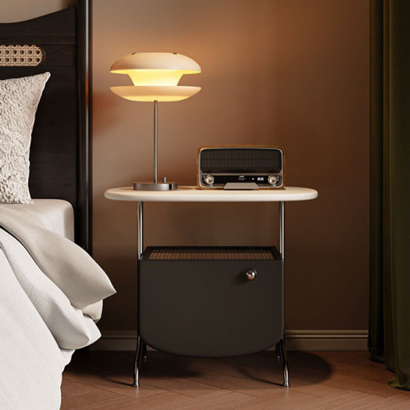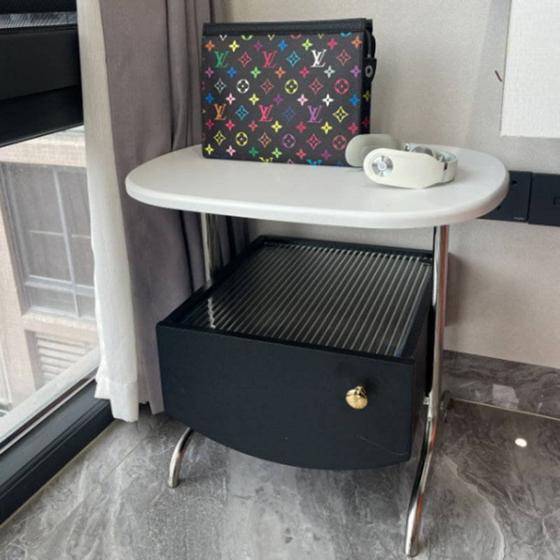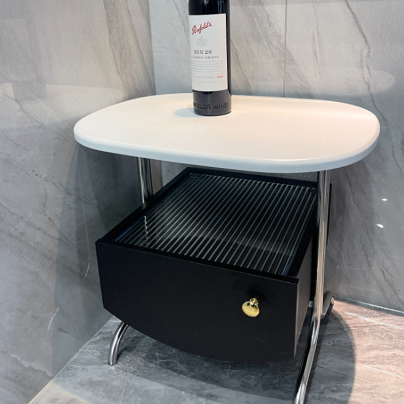 Modern Minimalist Oval Solid Wood Board Tabletop Glass Stainless Steel Nightstand 1-Drawer For Bedroom