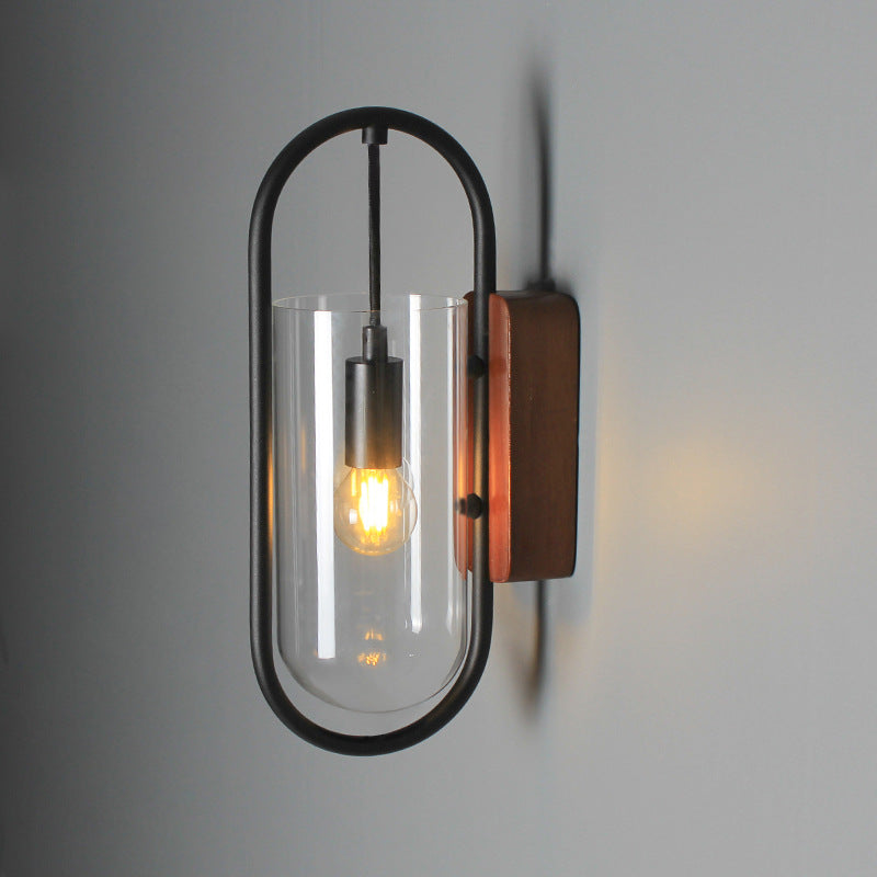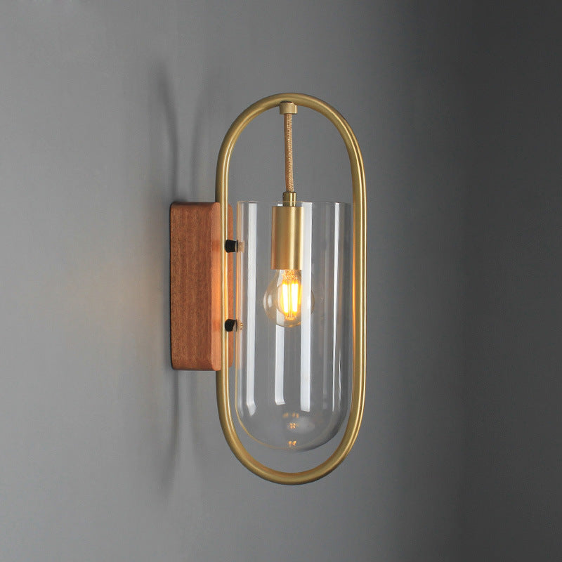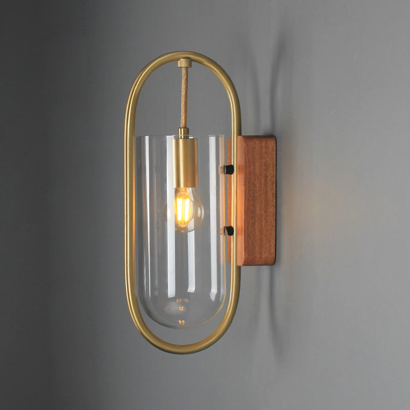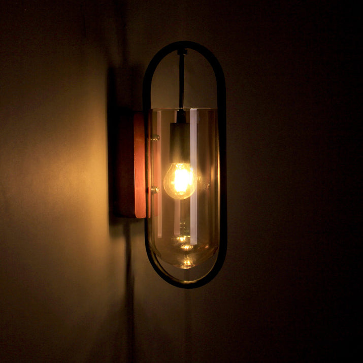 مصباح حائط بسيط حديث بيضاوي الشكل مصنوع من الزجاج والمعدن والخشب، مزود بمصباح واحد لغرفة النوم