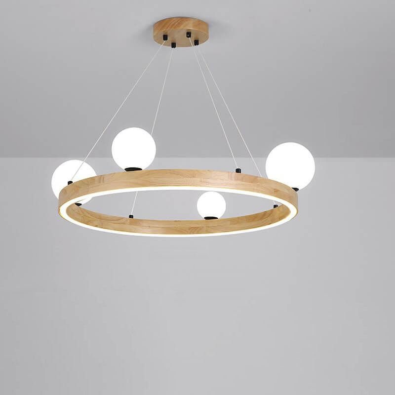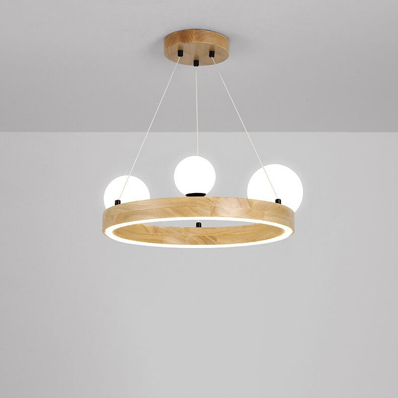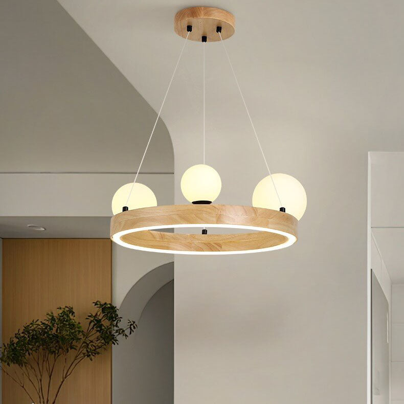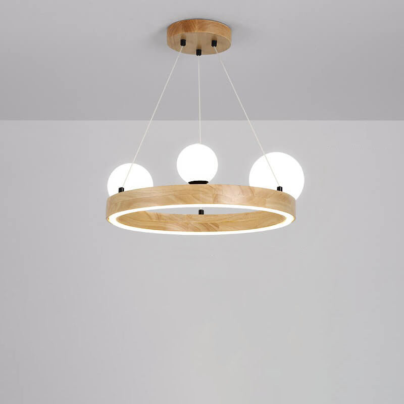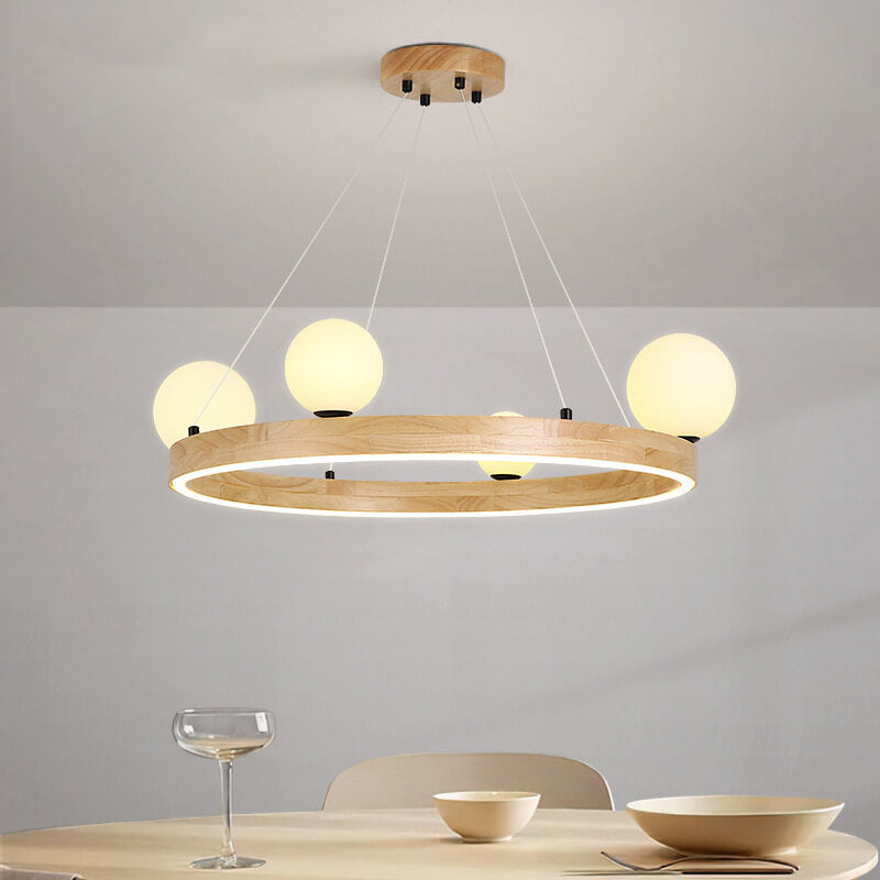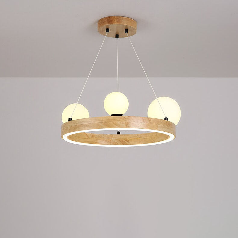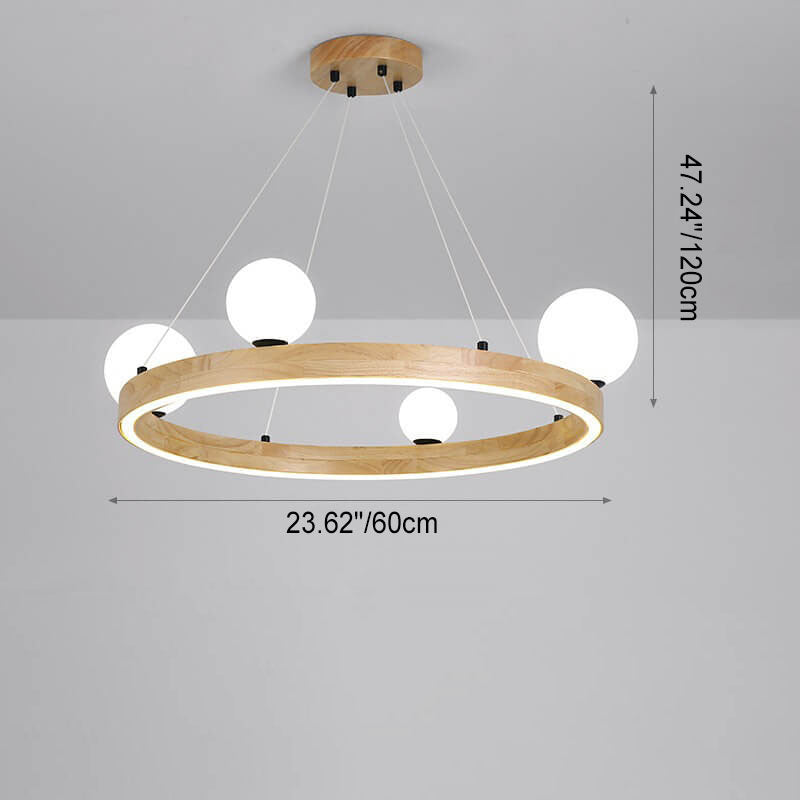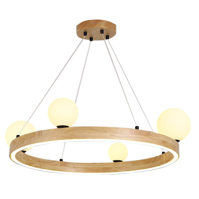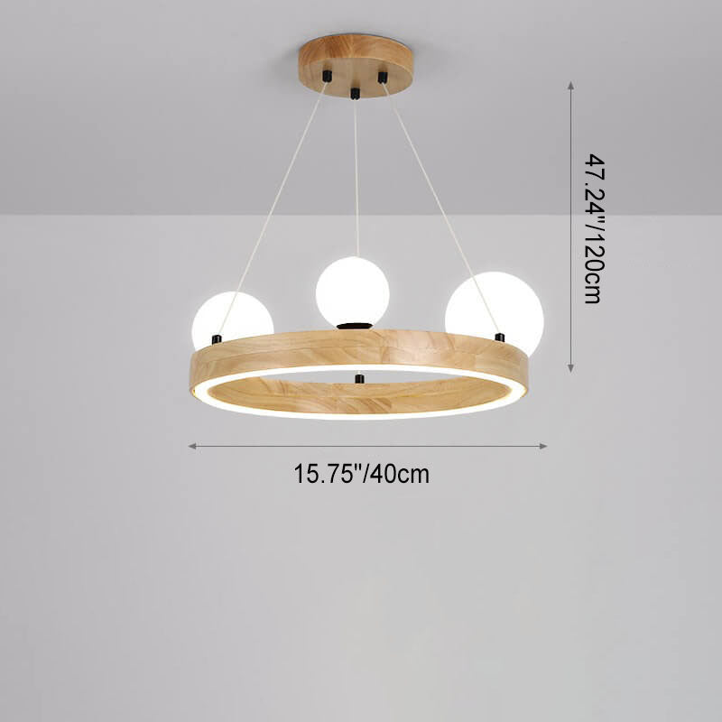 ثريا دائرية خشبية بتصميم بسيط على شكل كرة زجاجية، مزودة بثلاثة أرباع الضوء