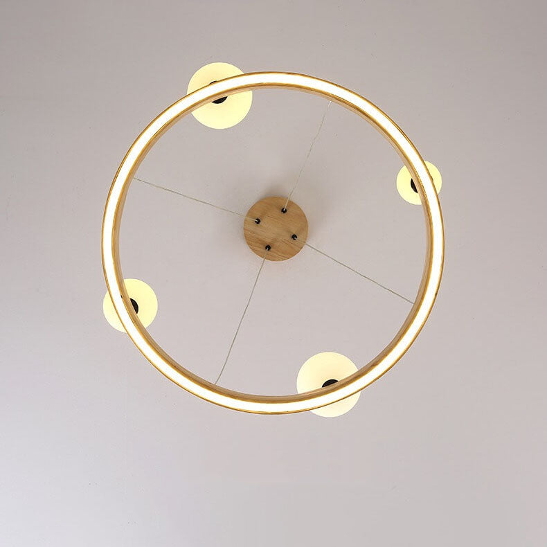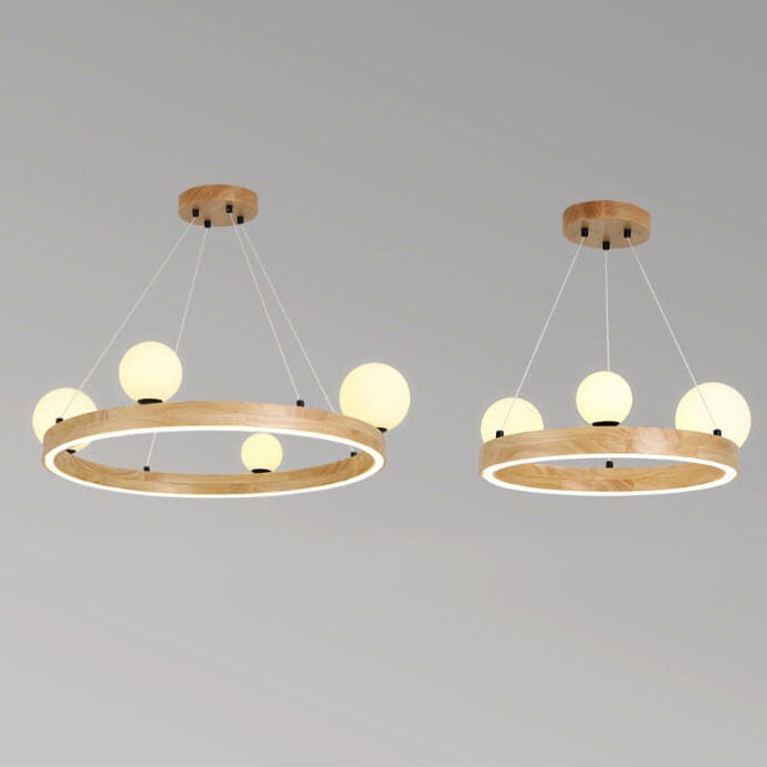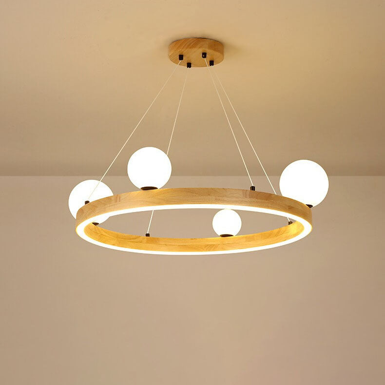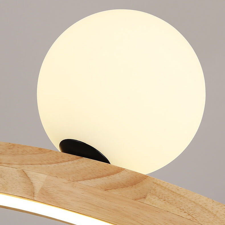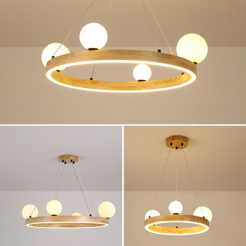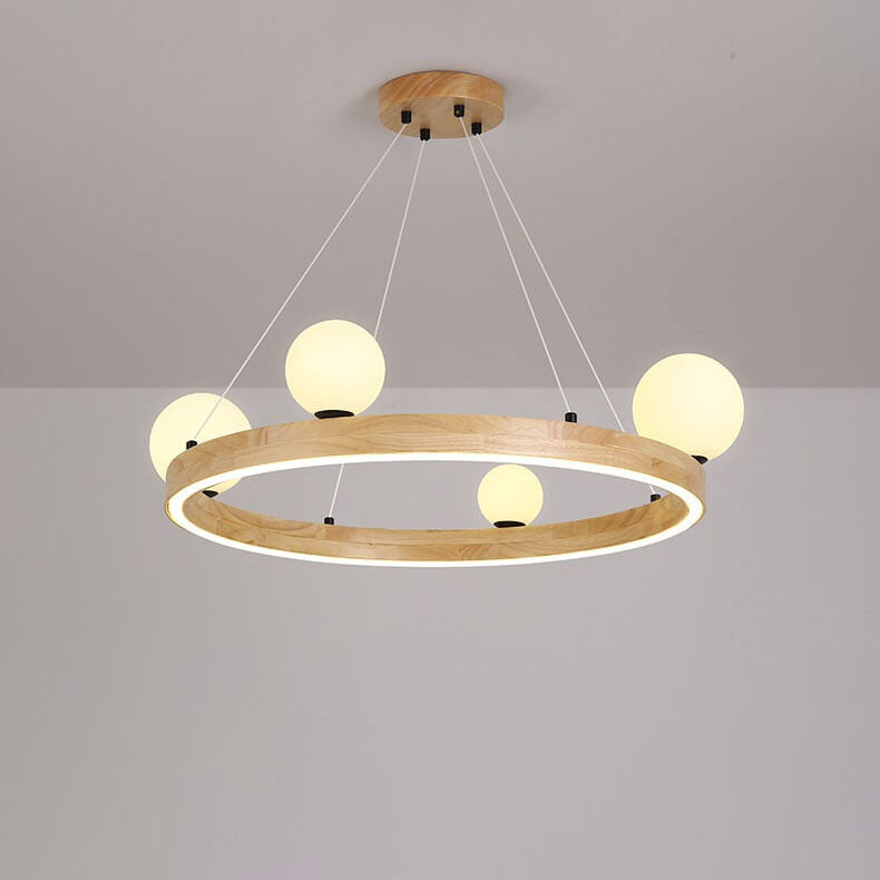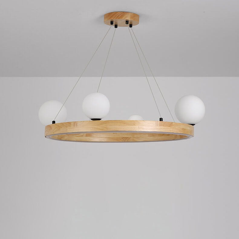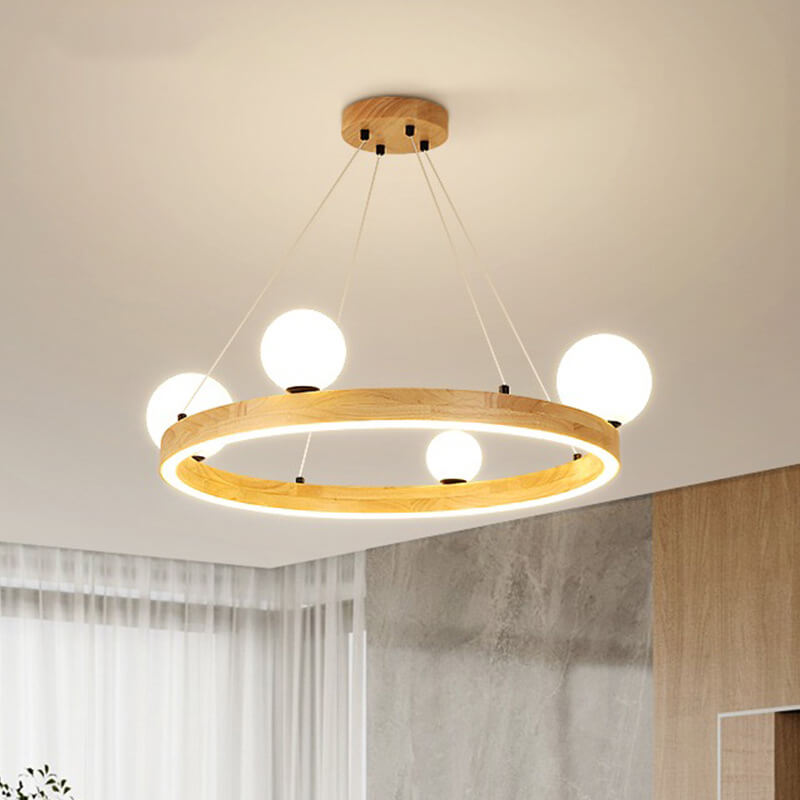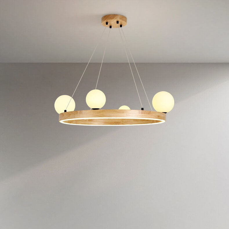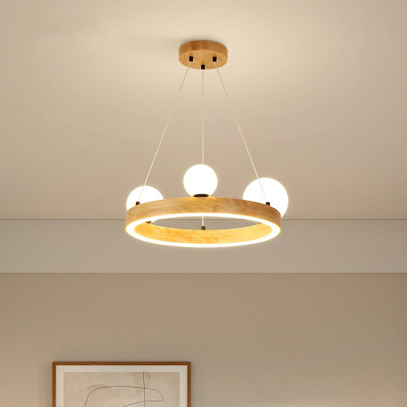 ثريا دائرية خشبية بتصميم بسيط على شكل كرة زجاجية، مزودة بثلاثة أرباع الضوء