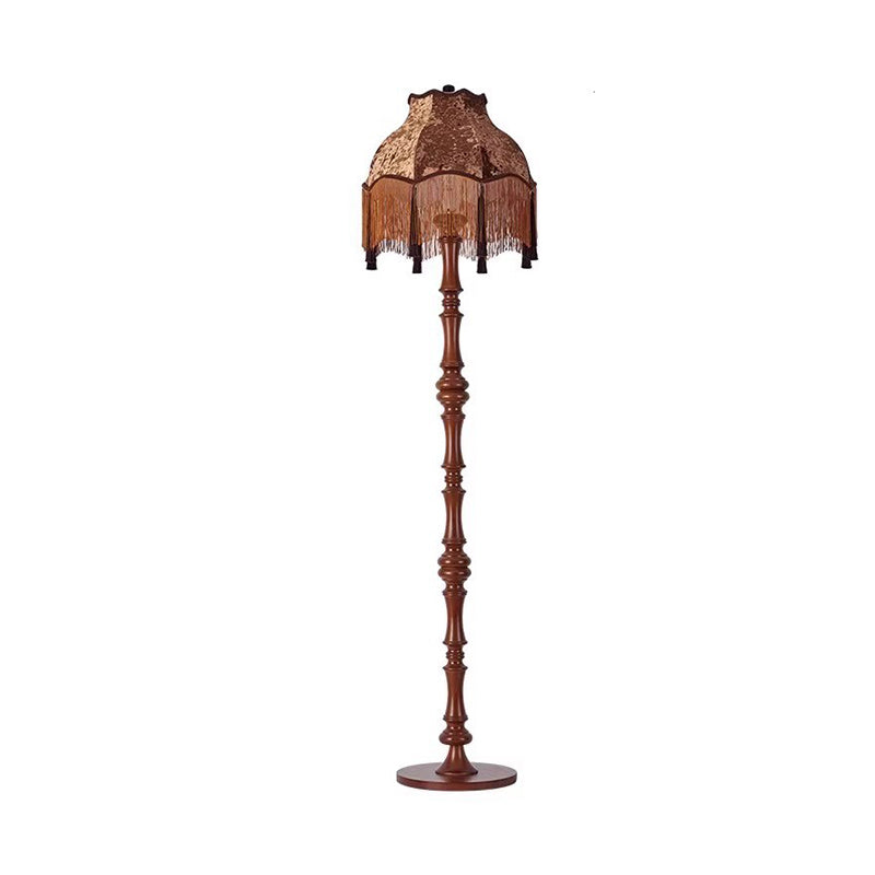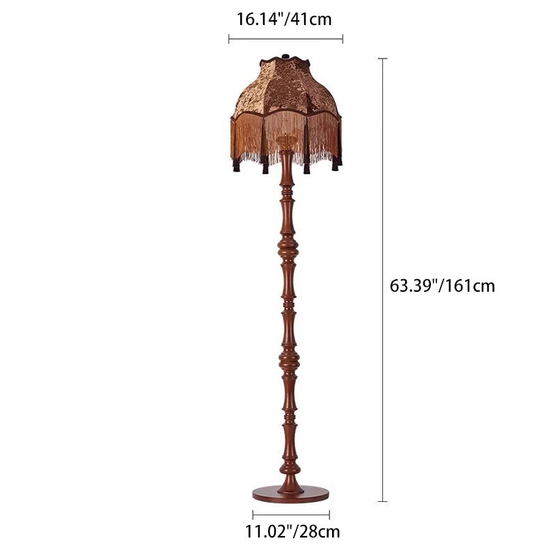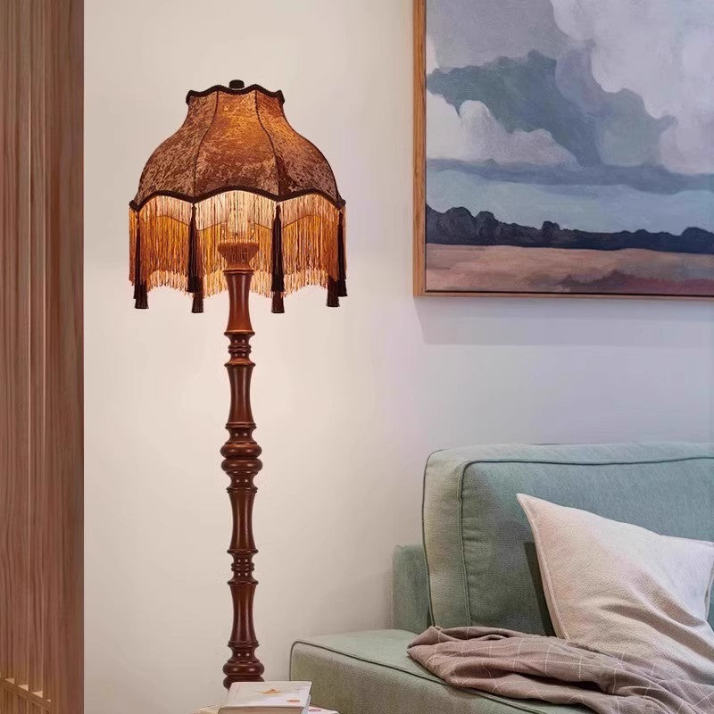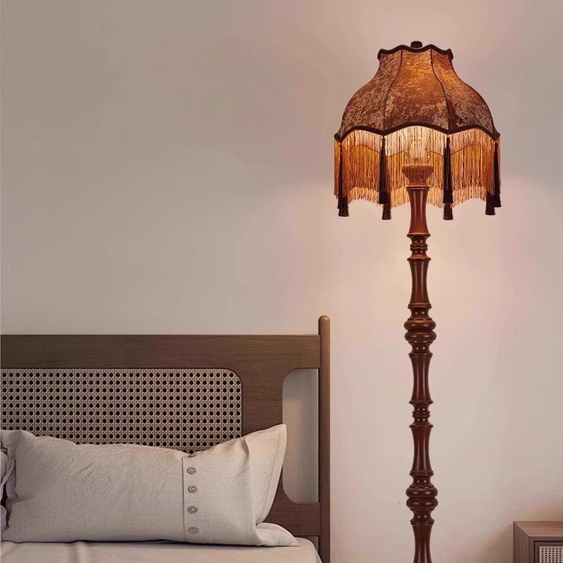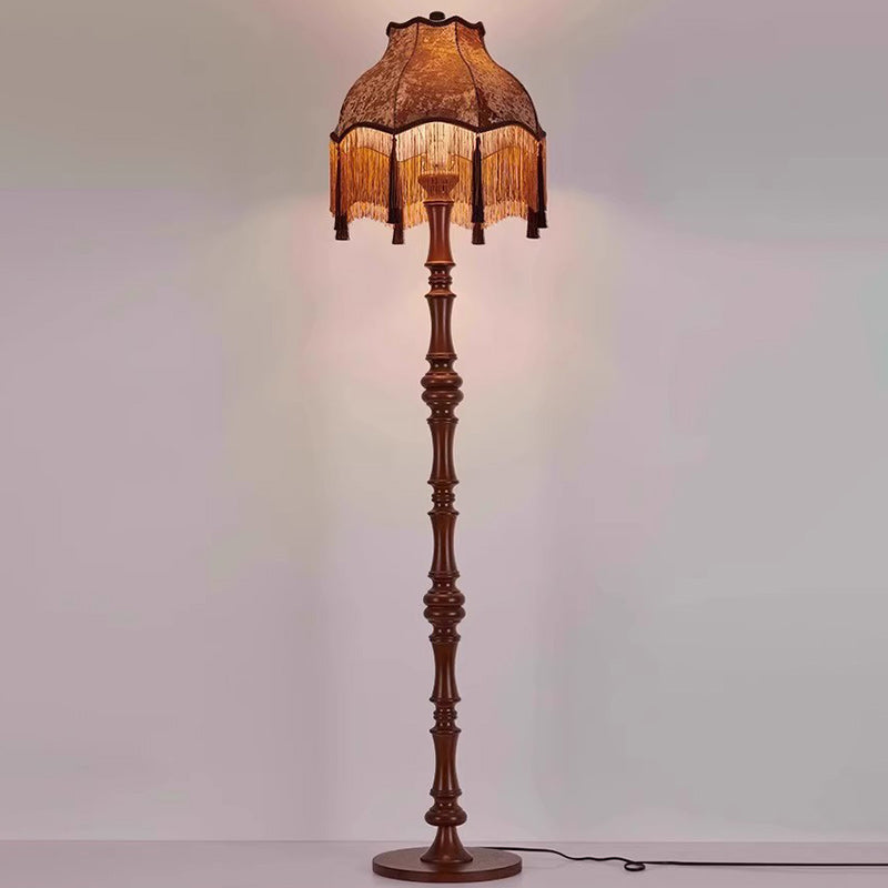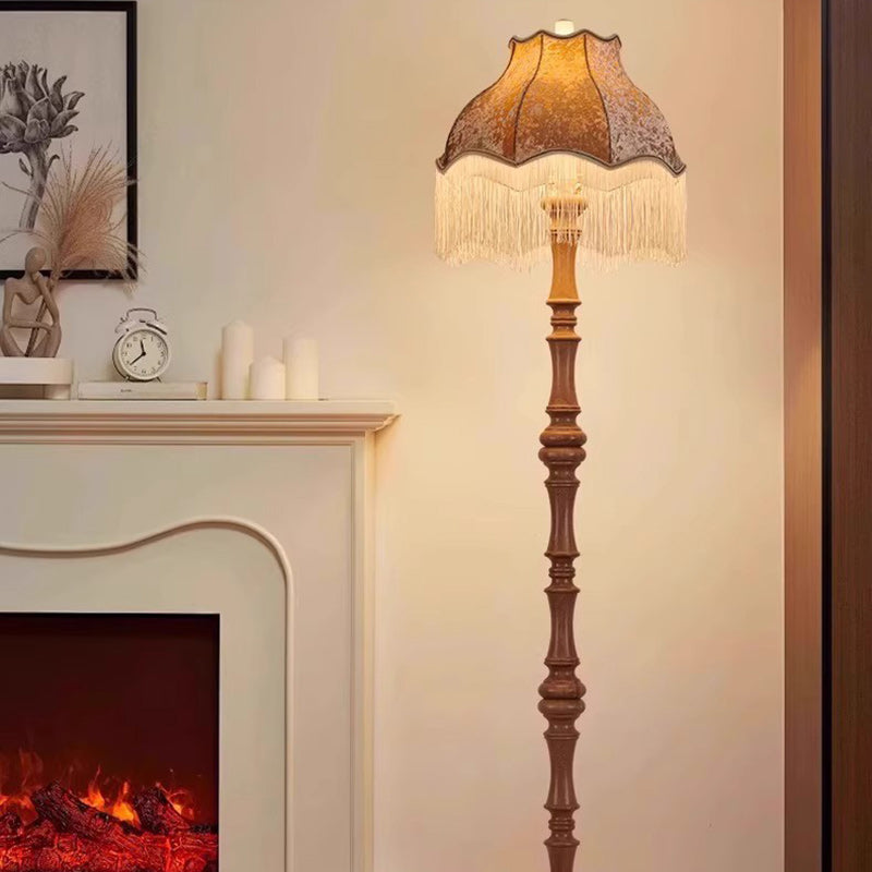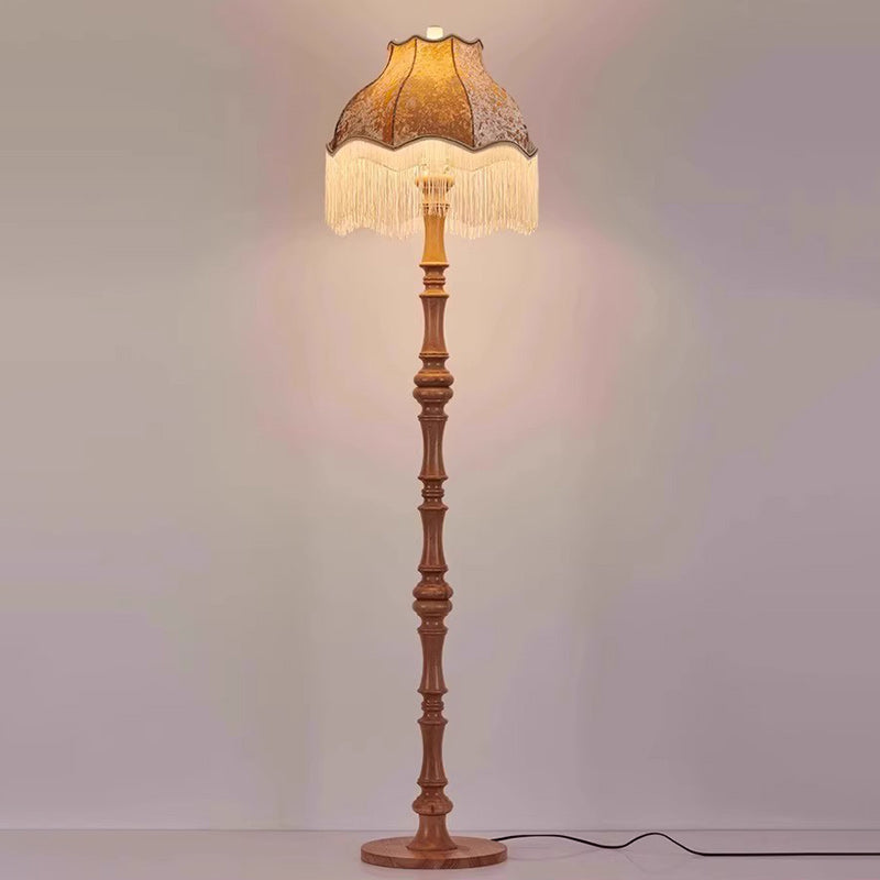 Traditional European Fabric Tassel Shade Solid Wood Rod 1-Light Standing Floor Lamp For Bedroom