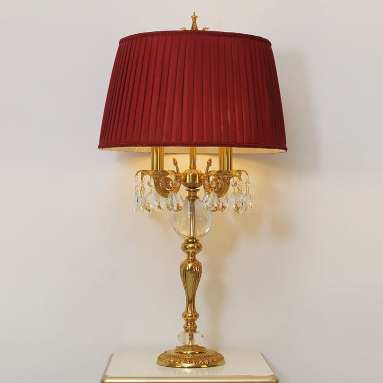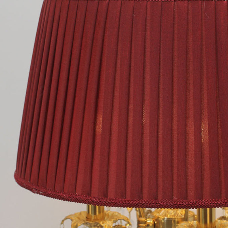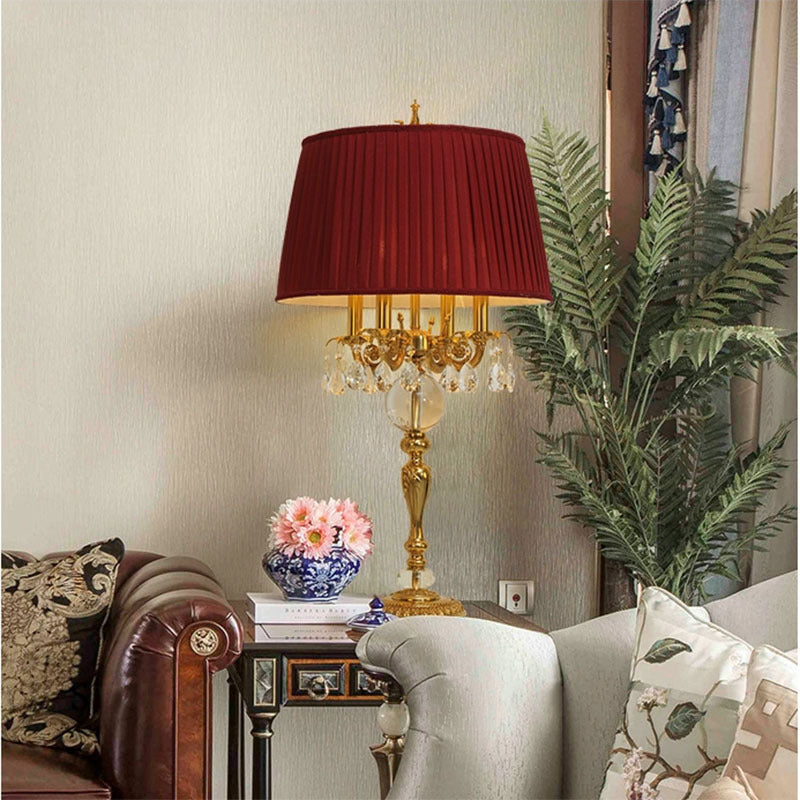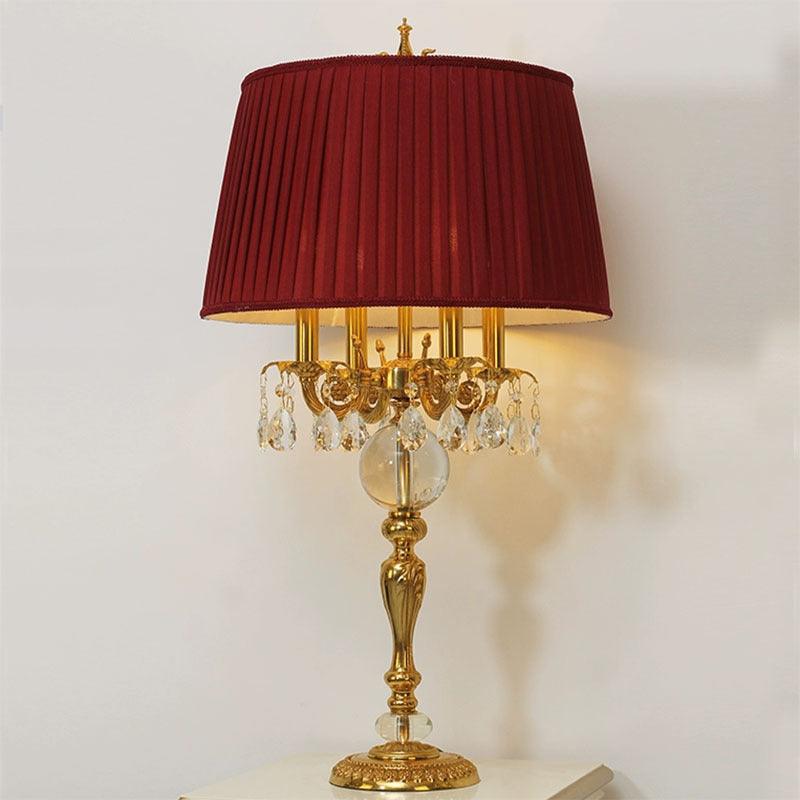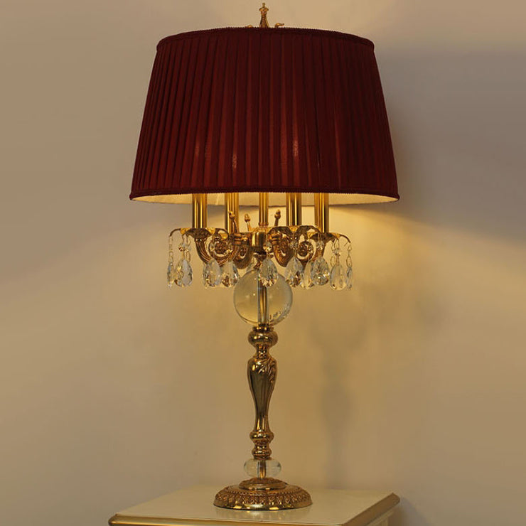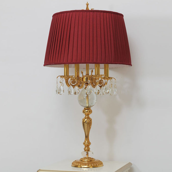 Traditional French Copper Crystal Fabric Cylinder Pleated 5-Light Table Lamp For Bedside