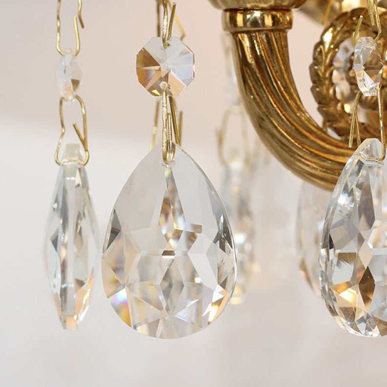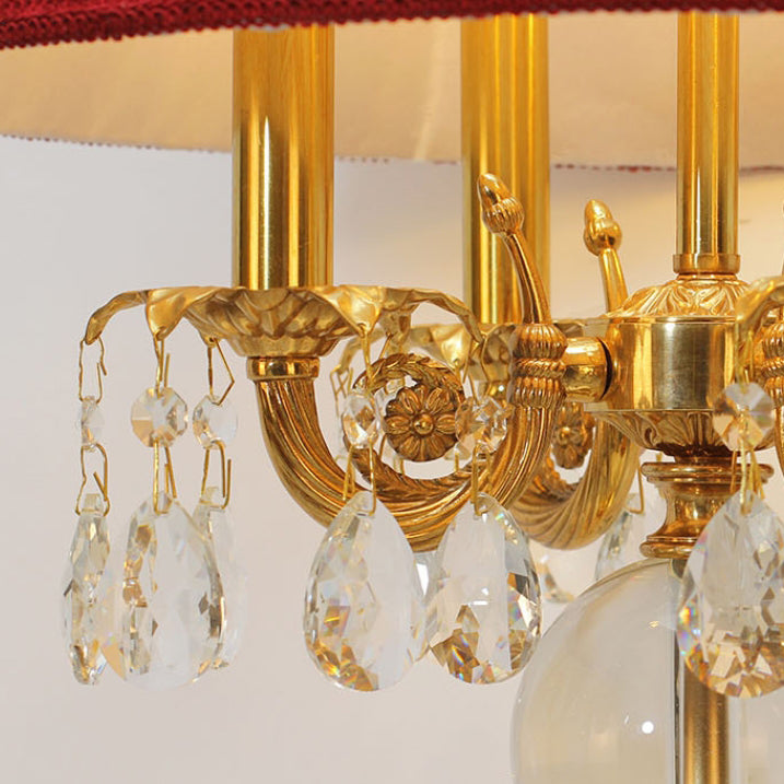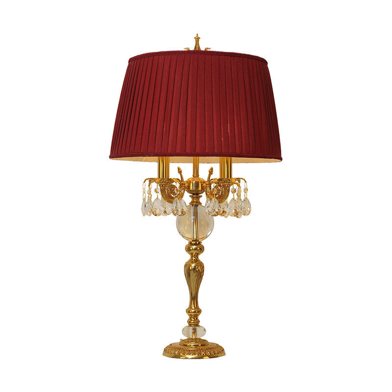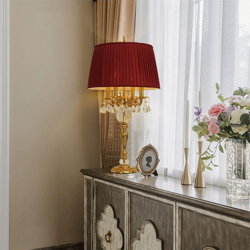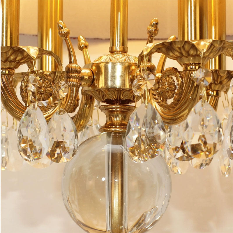 Traditional French Copper Crystal Fabric Cylinder Pleated 5-Light Table Lamp For Bedside