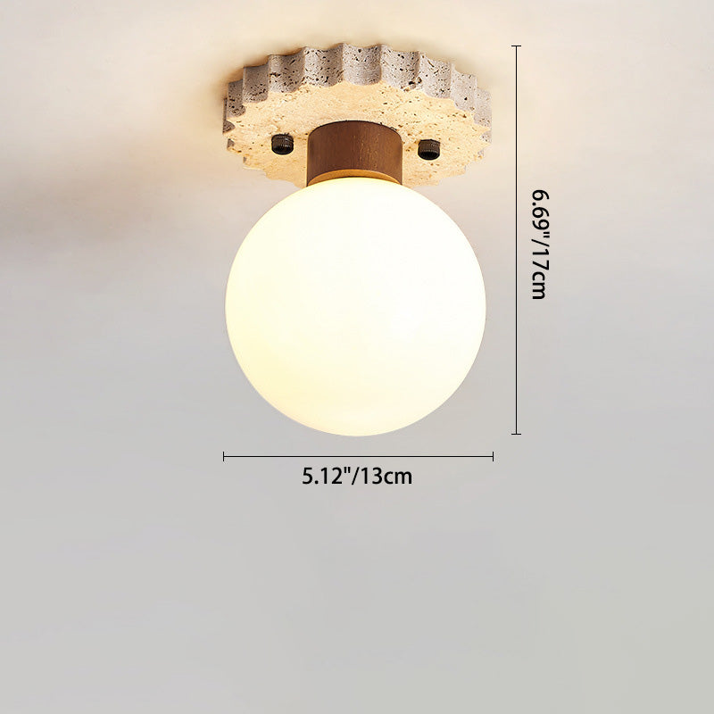 مصباح سقف ياباني تقليدي ذو قاعدة دائرية من خشب الترافرتين والزجاج مزود بمصباح واحد وتركيب شبه مسطح للممر