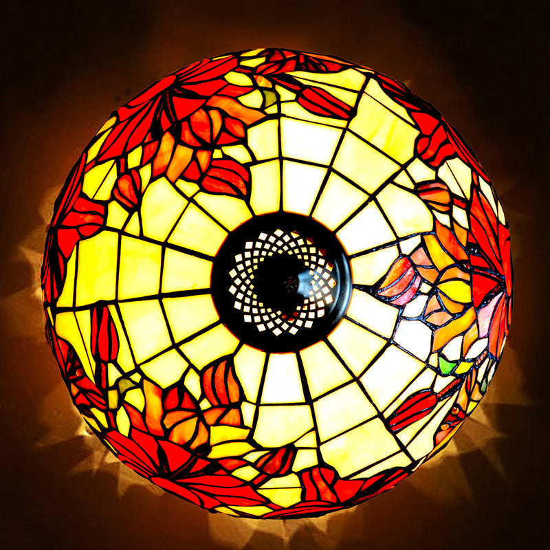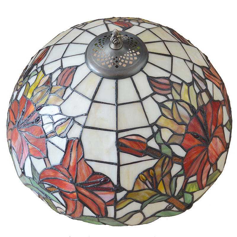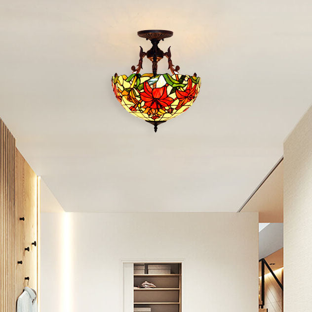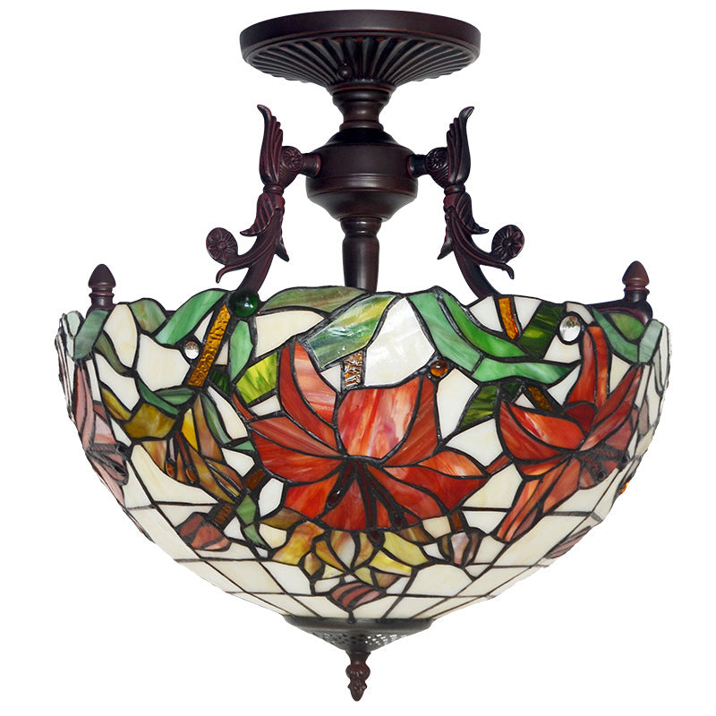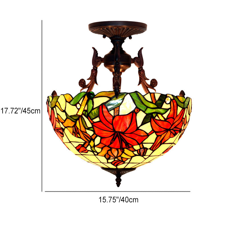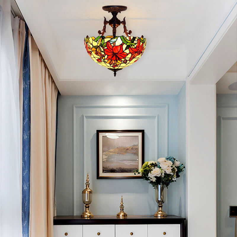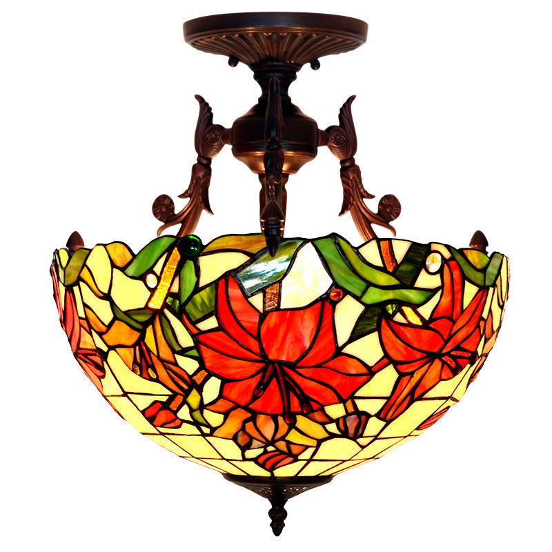 مصباح سقف تقليدي من تيفاني، مصنوع من الزجاج الملون، على شكل قبة زهرة زنبق، بثلاثة مصابيح، مثبت بشكل نصف مسطح، لغرفة المعيشة