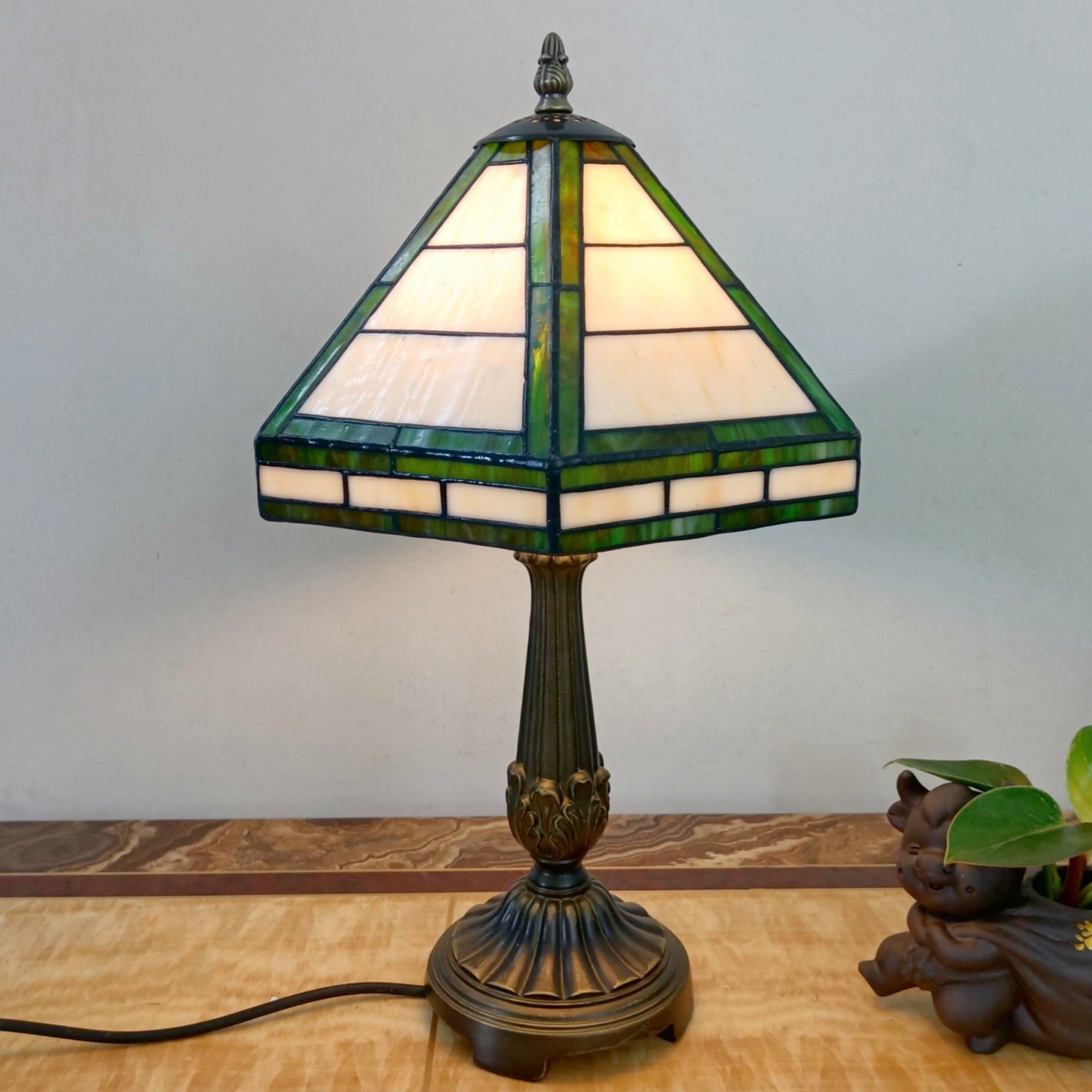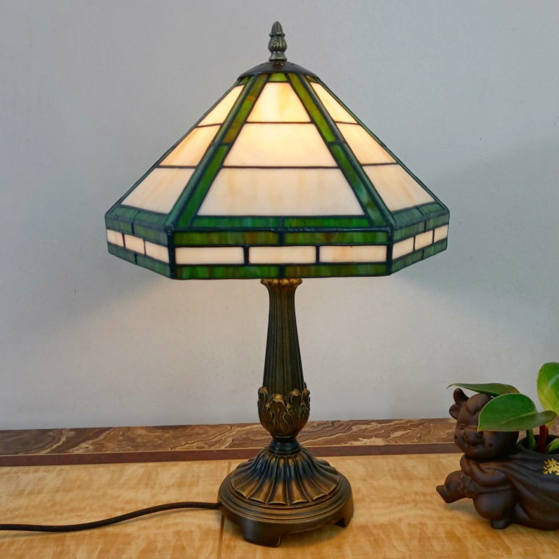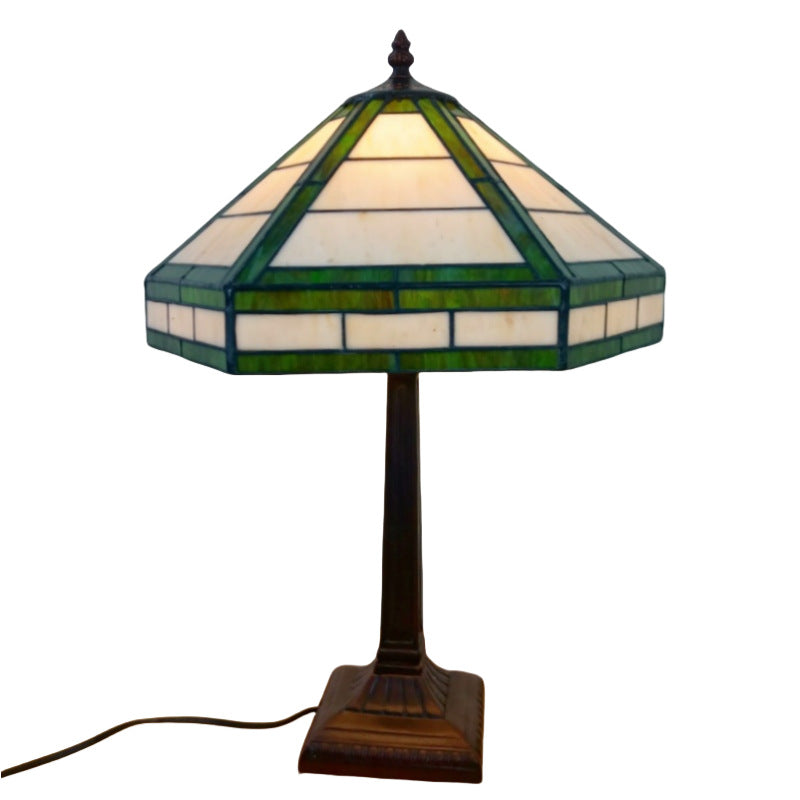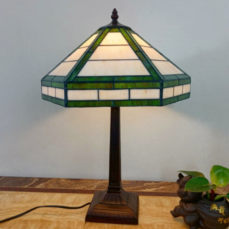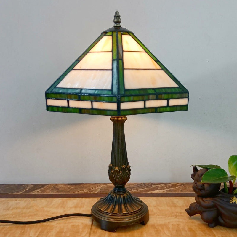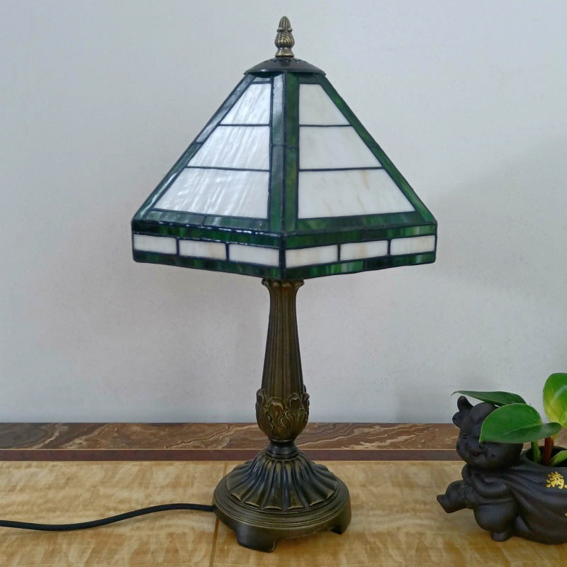 Traditional Vintage Resin Base Conical Glass Lampshade Grid 1 - Light Table Lamp For Living Room
