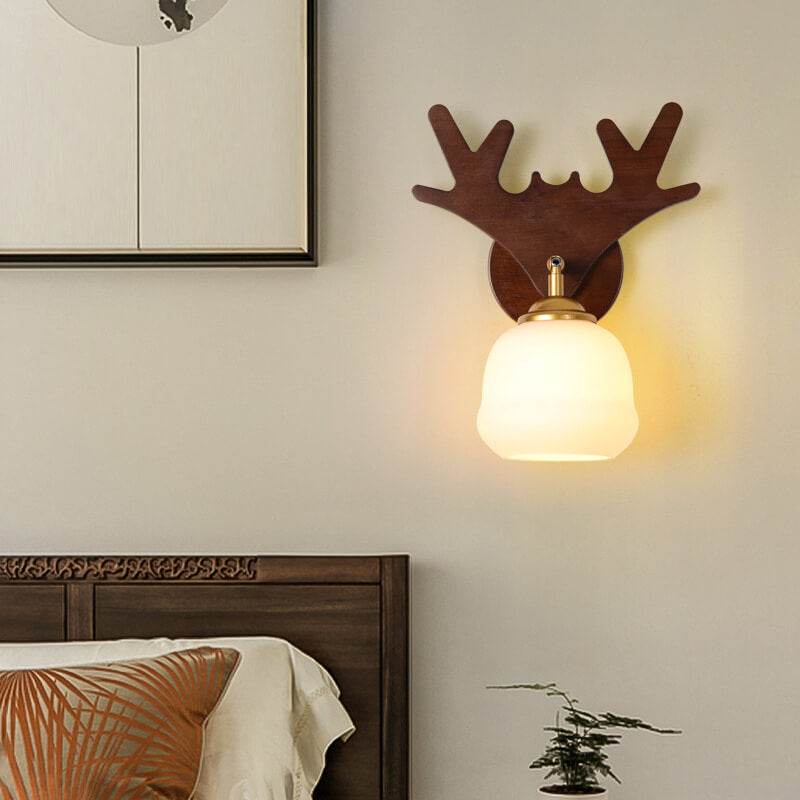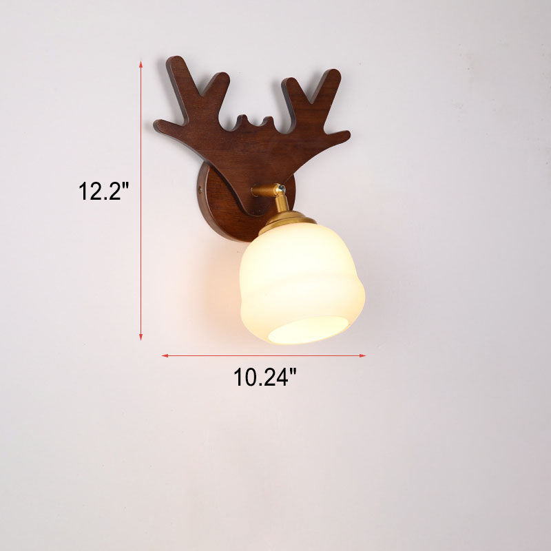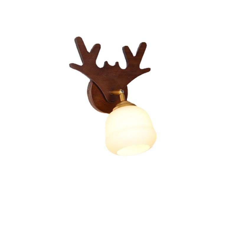 مصباح حائطي عتيق من خشب الجوز الصيني على شكل رأس غزال، مزود بغطاء زجاجي وإضاءة واحدة