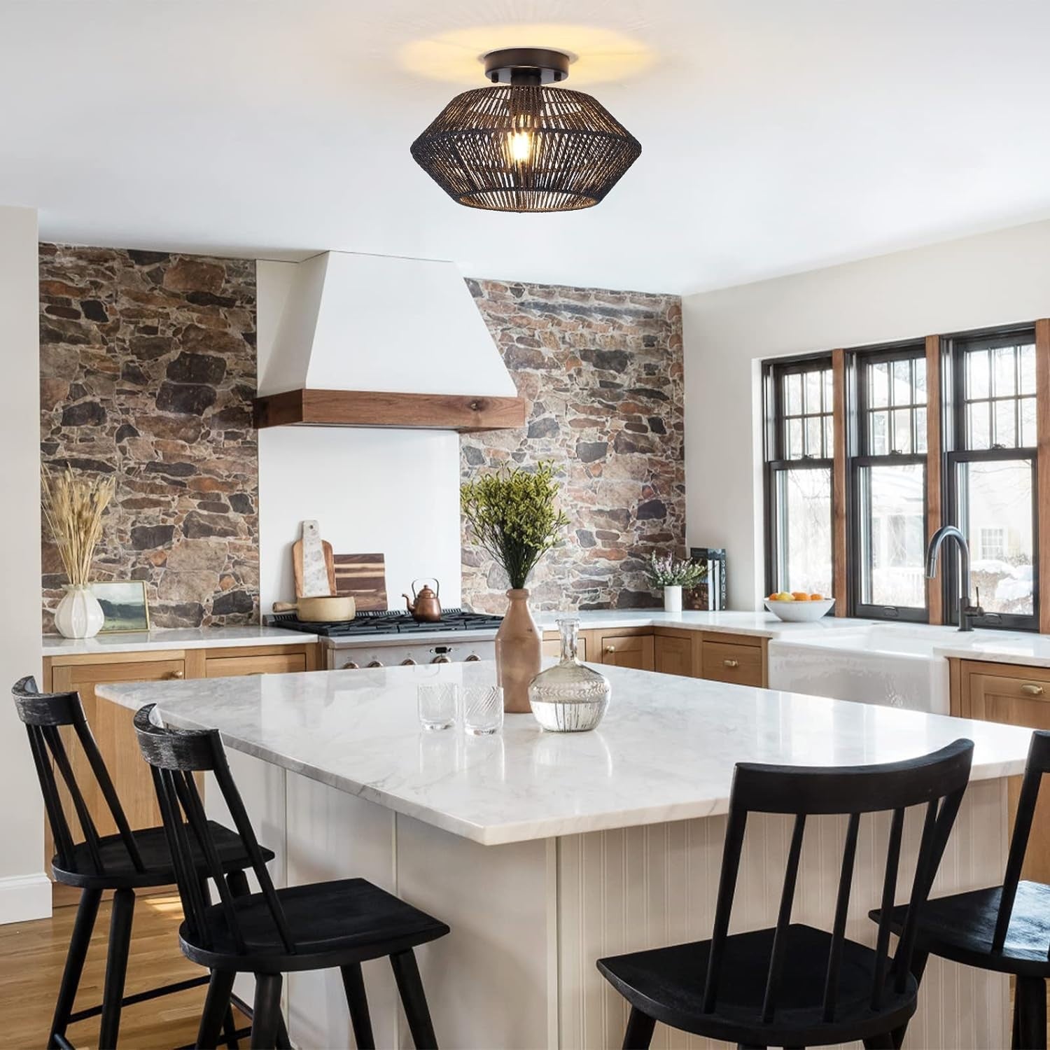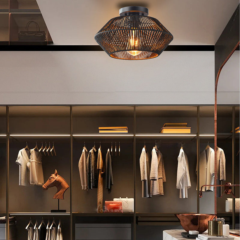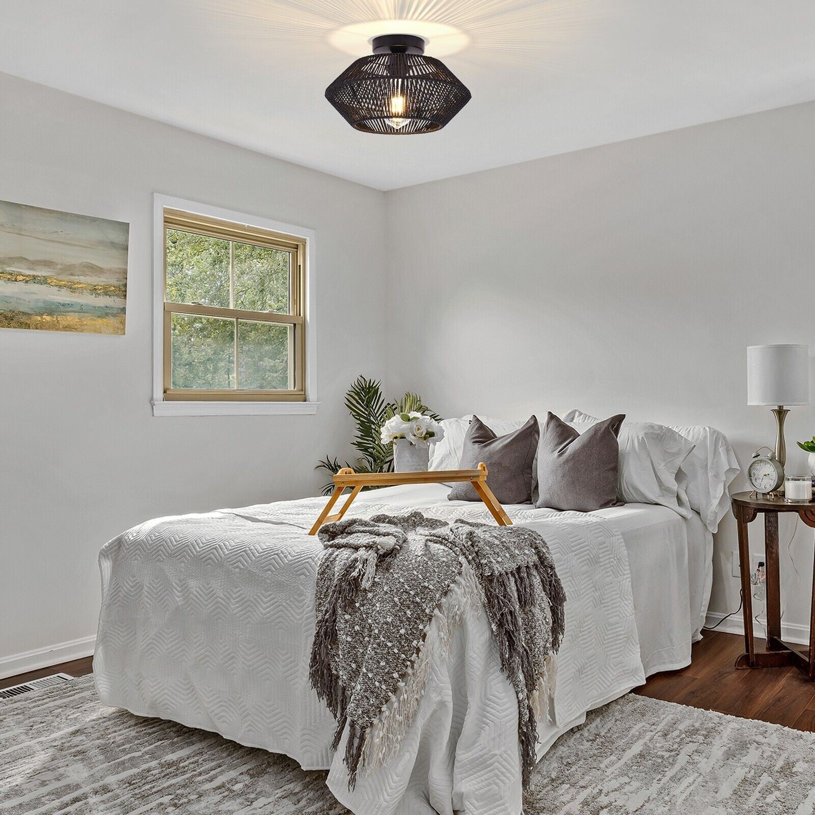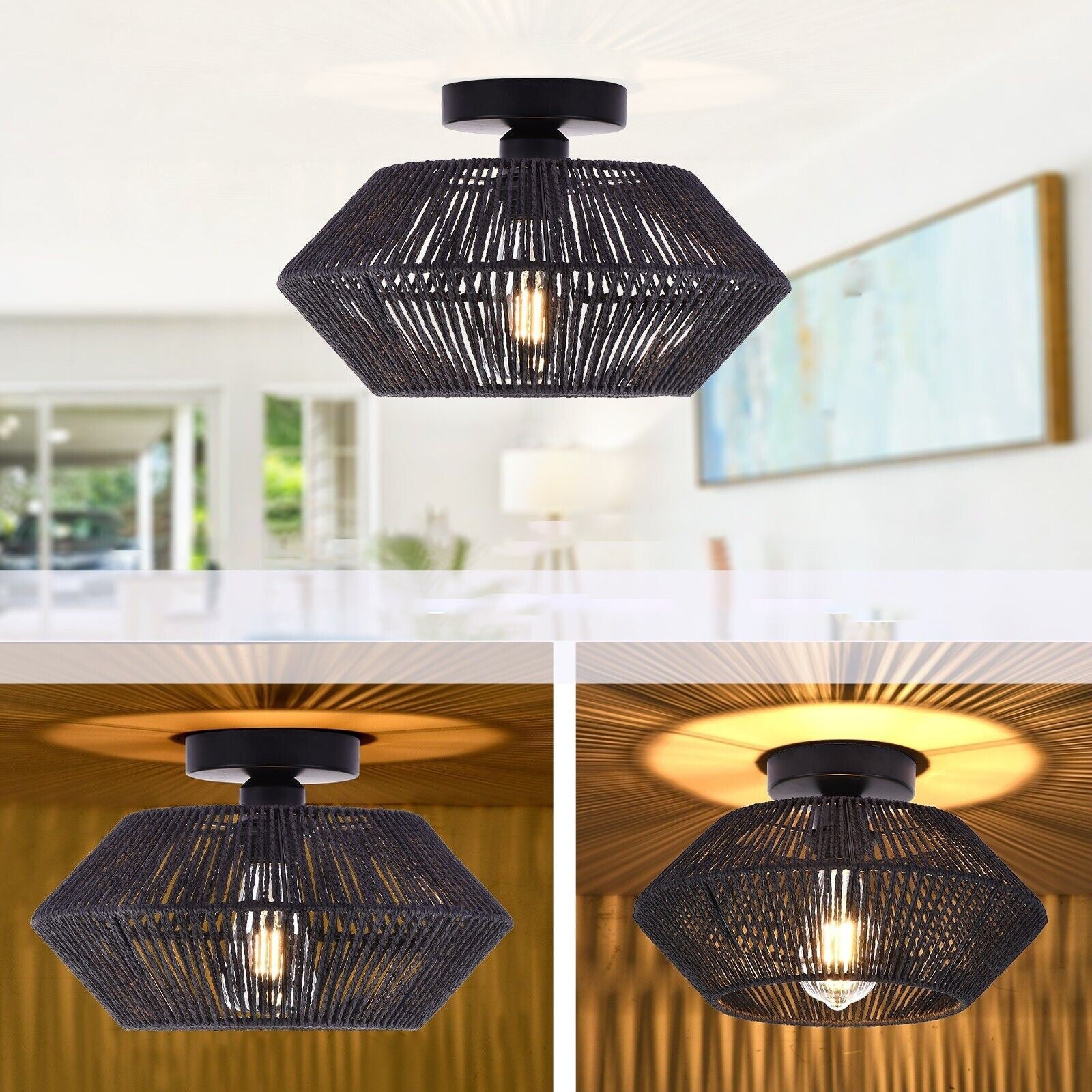 مصباح سقف دائري معاصر من الخيزران بتصميم بوهو، مزود بمصباح واحد، وتركيب شبه مسطح، لغرفة المعيشة