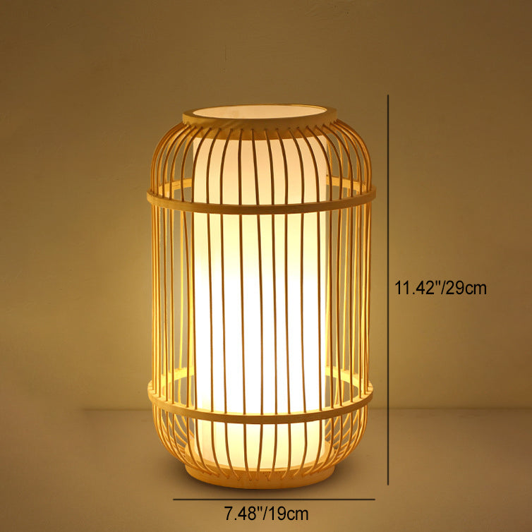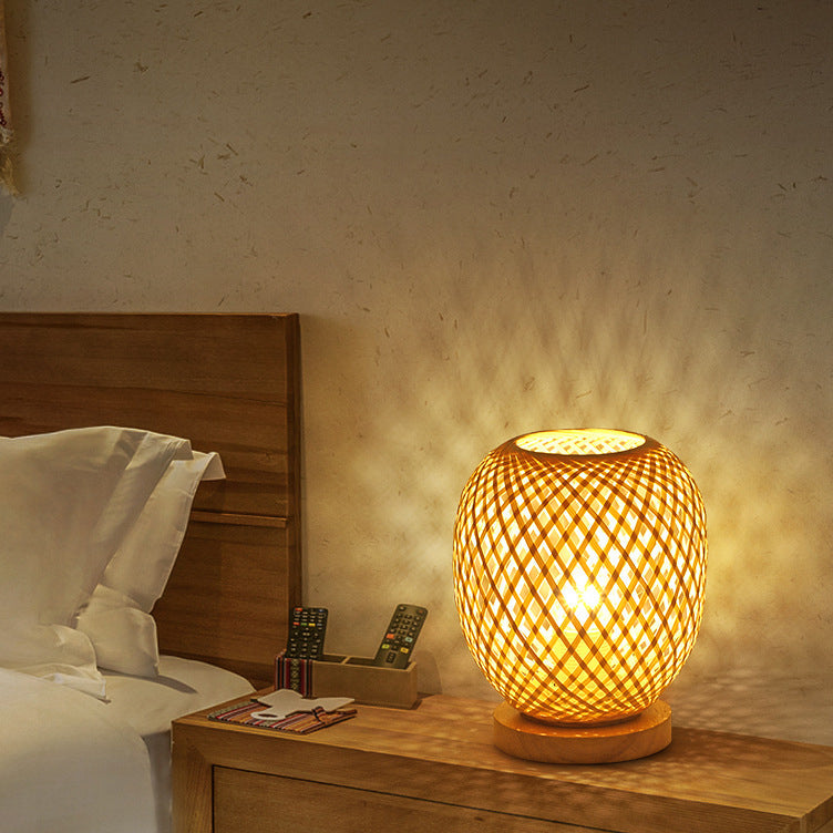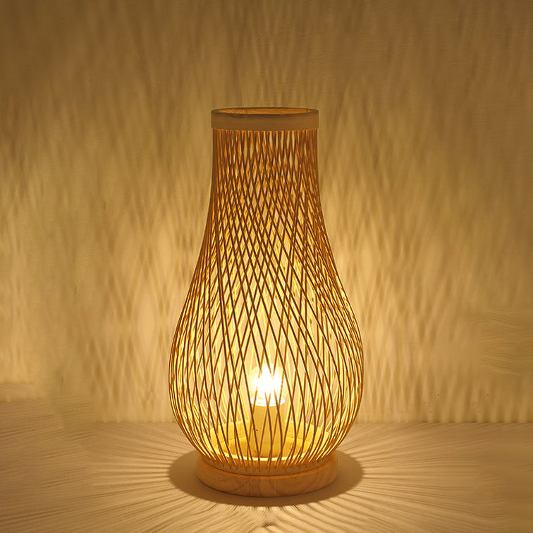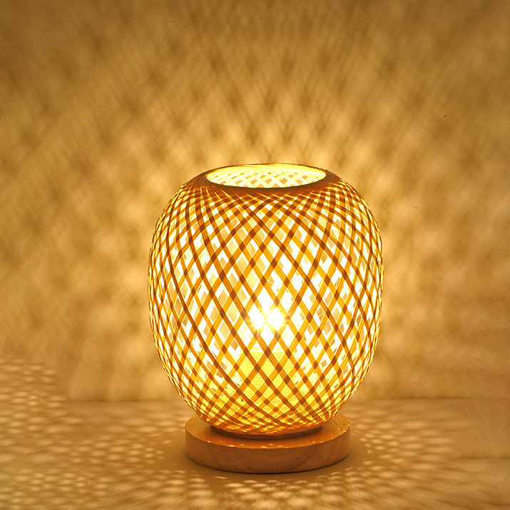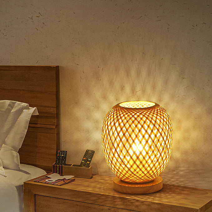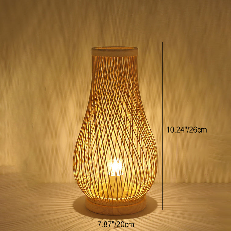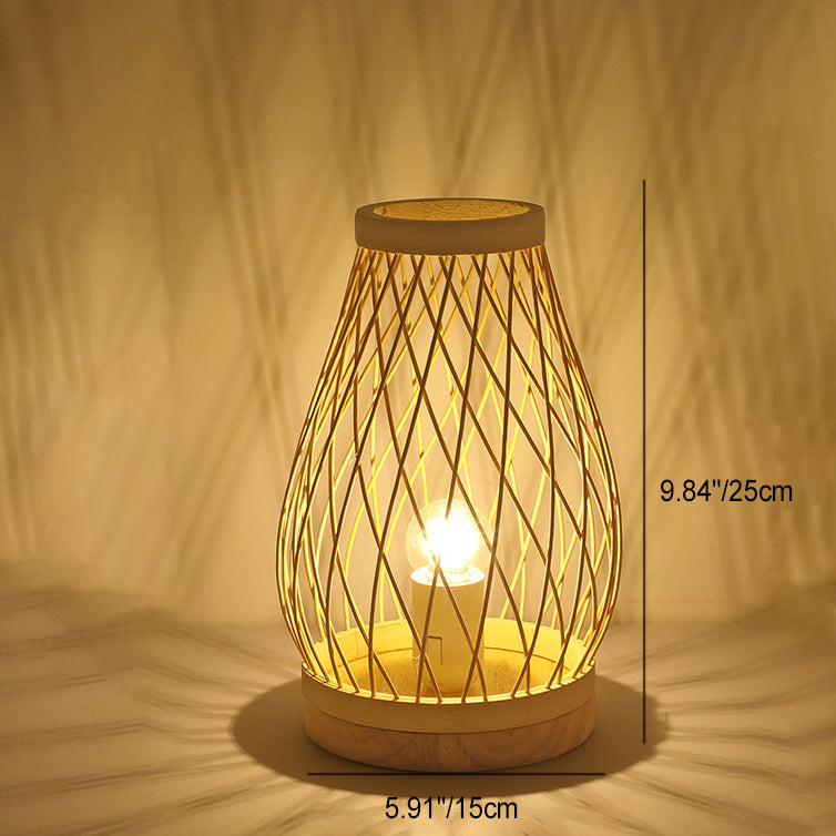 Contemporary Boho Wood Bamboo Weaving Lantern Shape 1-Light Table Lamp For Bedroom