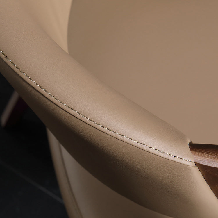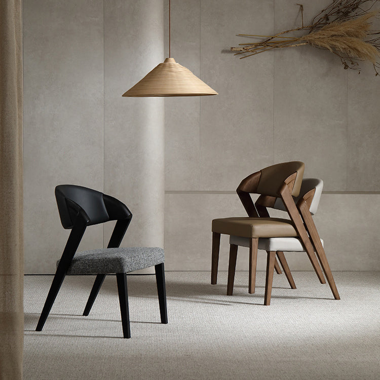 Designed with a scientific backrest to reduce lumbar pressure, this contemporary dining chair combines microfiber leather, linen, and ash wood for a stylish and ergonomic seating experience. Available in khaki, light gray, and black, it features a square seat with a semi-round silhouette and elegant wood grain detail—perfect for both dining and living spaces.