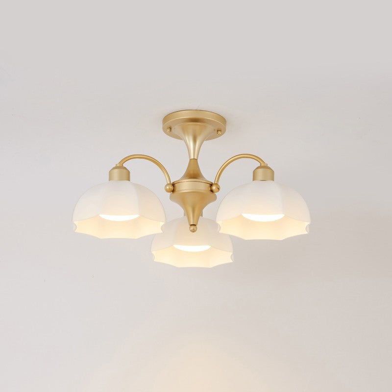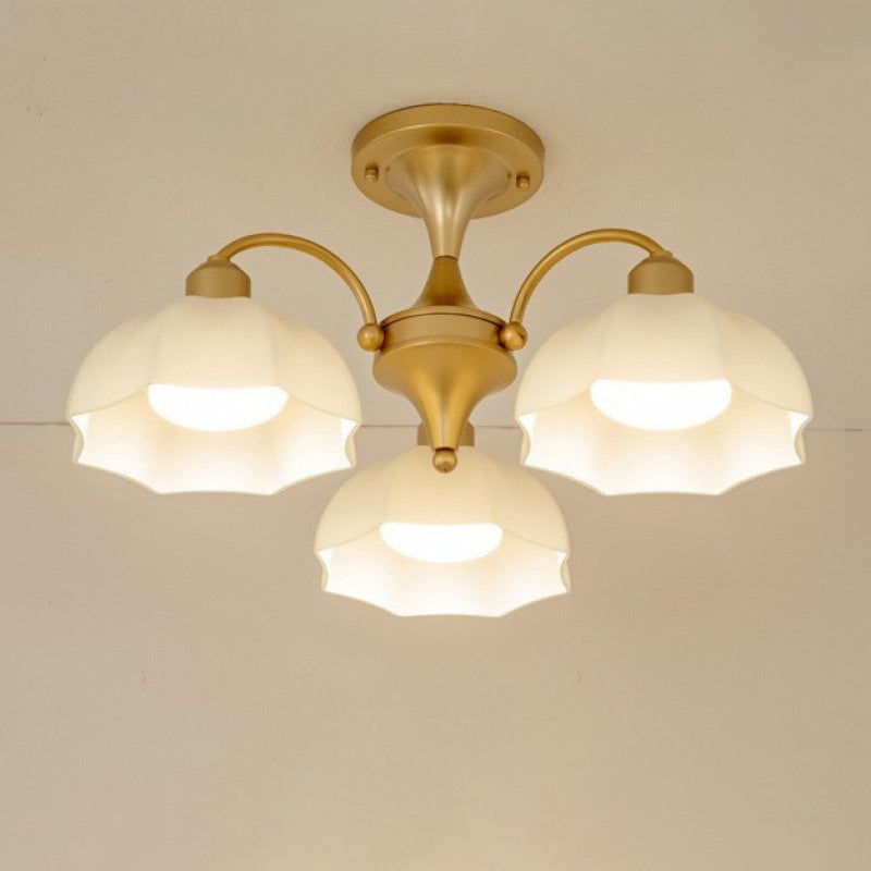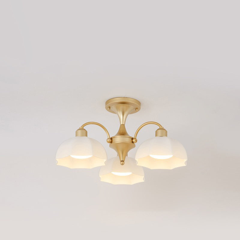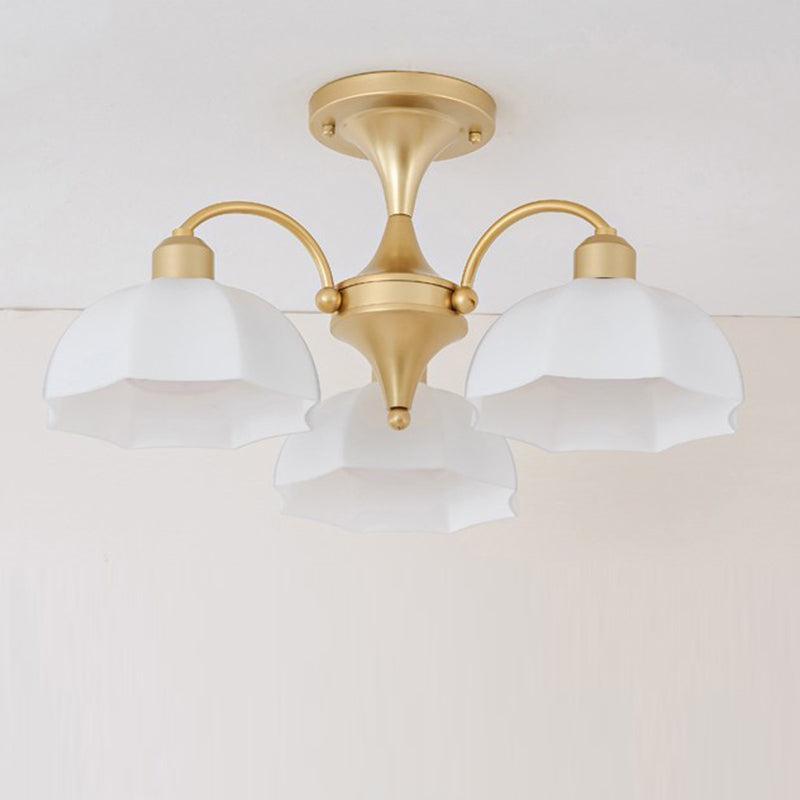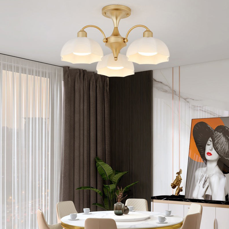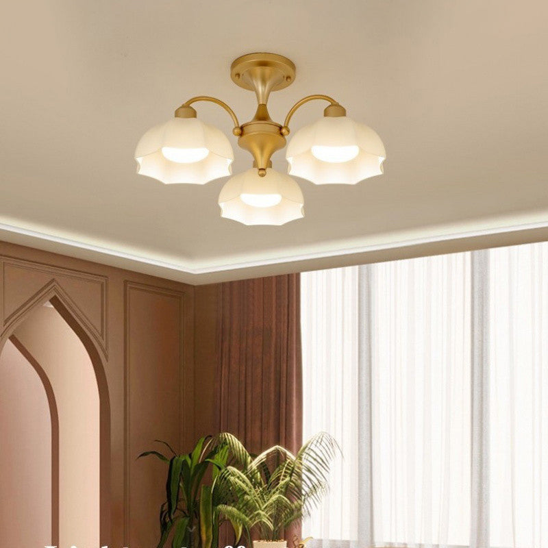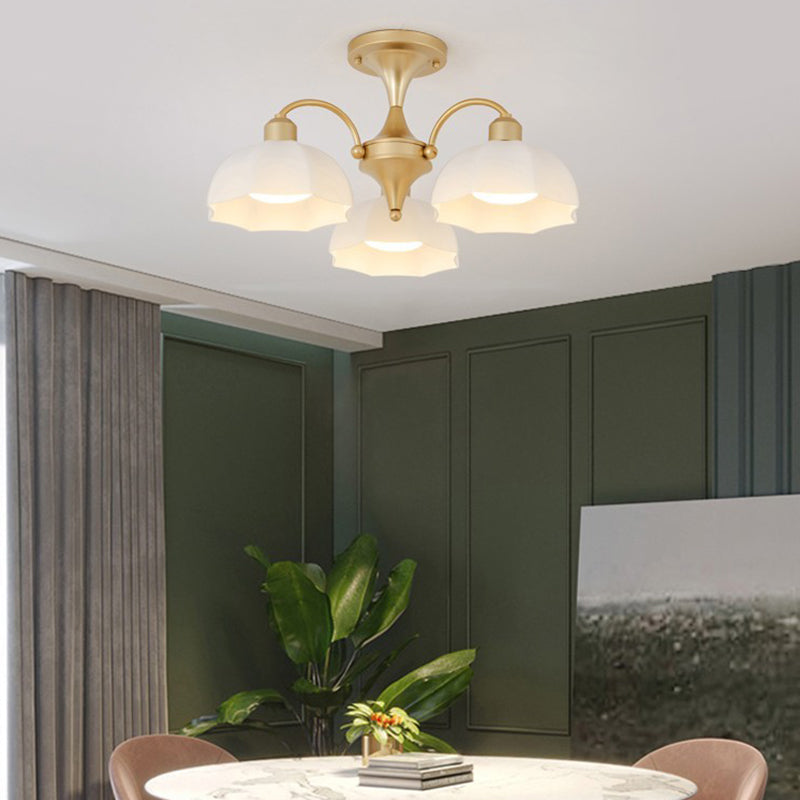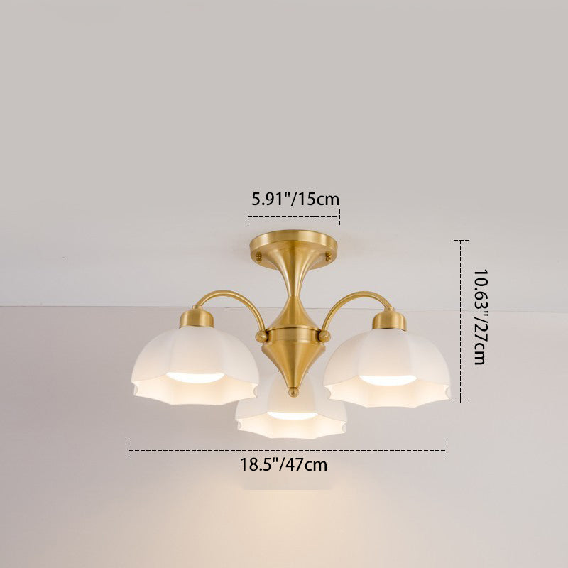 مصباح سقف معاصر على شكل فرع نورديك منحني على شكل قضيب مزهر وعاء من النحاس والزجاج بثلاثة مصابيح مثبت بشكل نصف مسطح لغرفة المعيشة