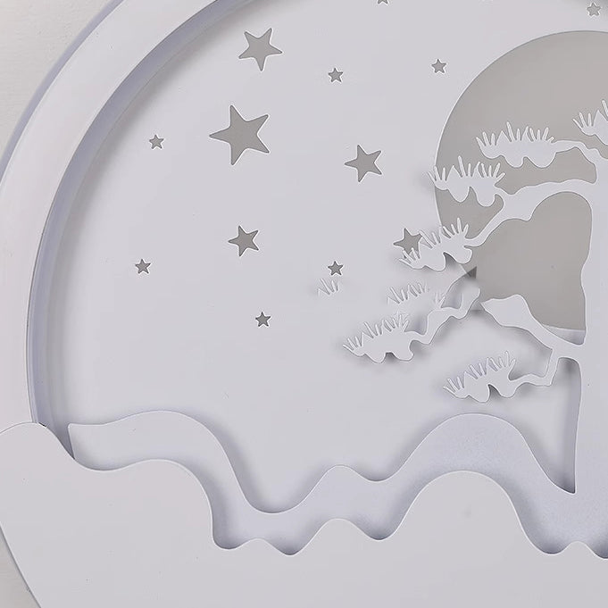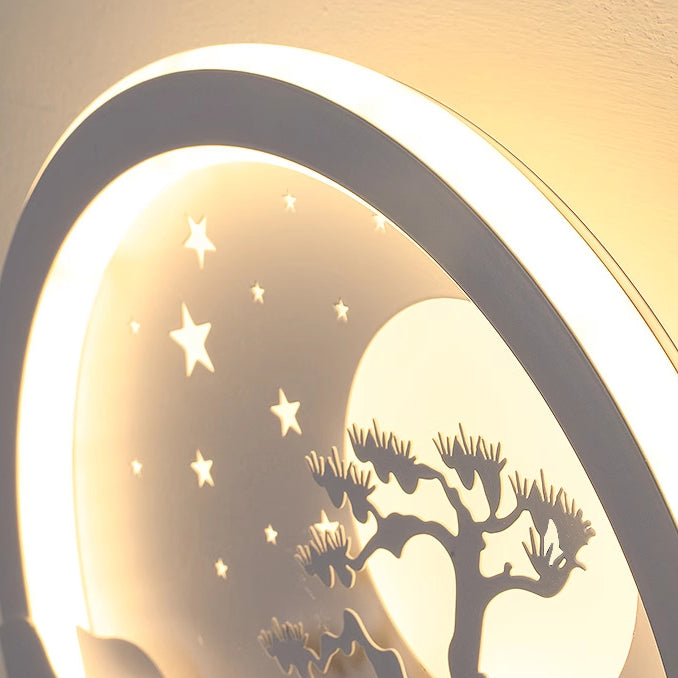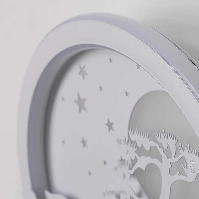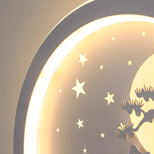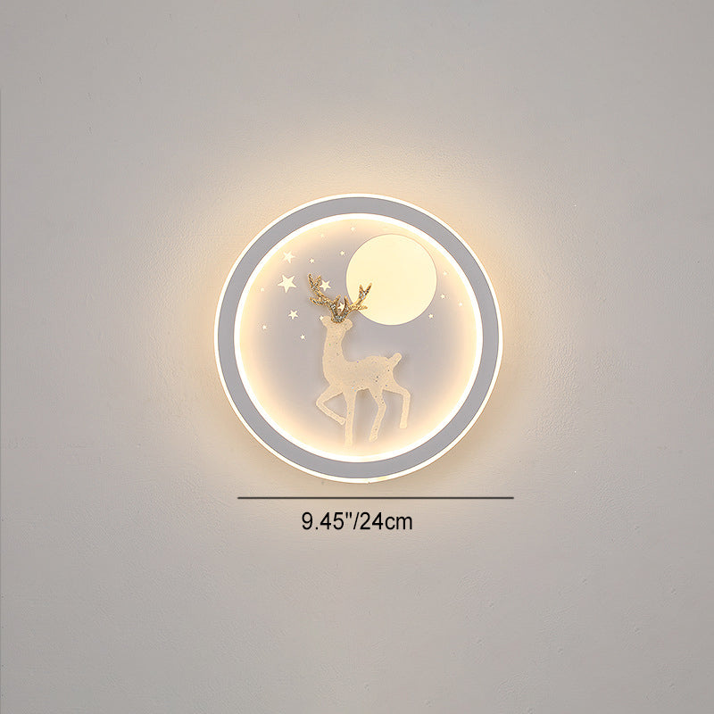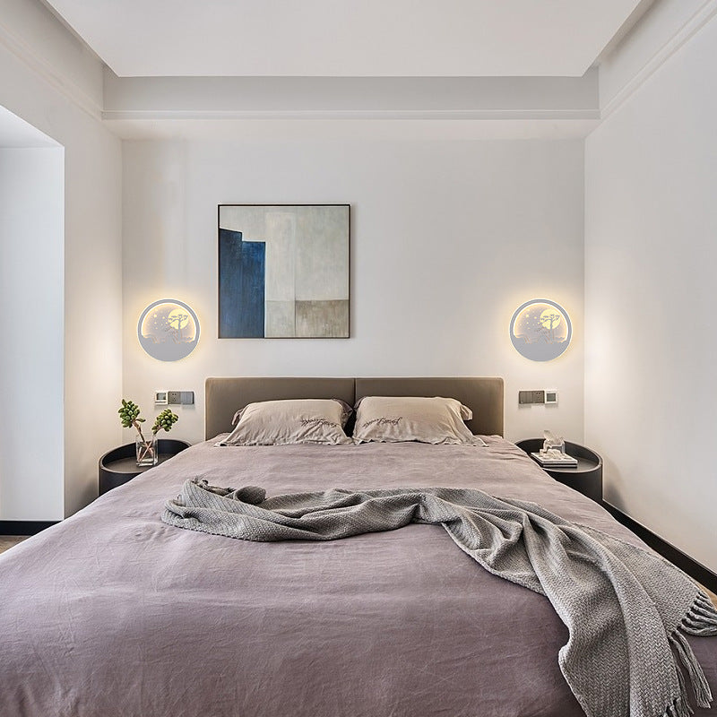مصباح حائط LED بتصميم دائري على شكل قمر وشجرة صنوبر وغزال مصنوع من الحديد الأكريليكي والسيليكون بتصميم نورديك المعاصر لوضعه بجانب السرير