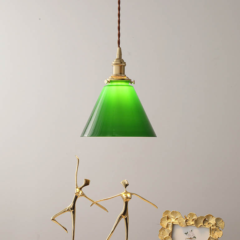 مصباح معلق معاصر بتصميم مخروطي أخضر من الزجاج والنحاس، مزود بمصباح واحد لغرفة المعيشة