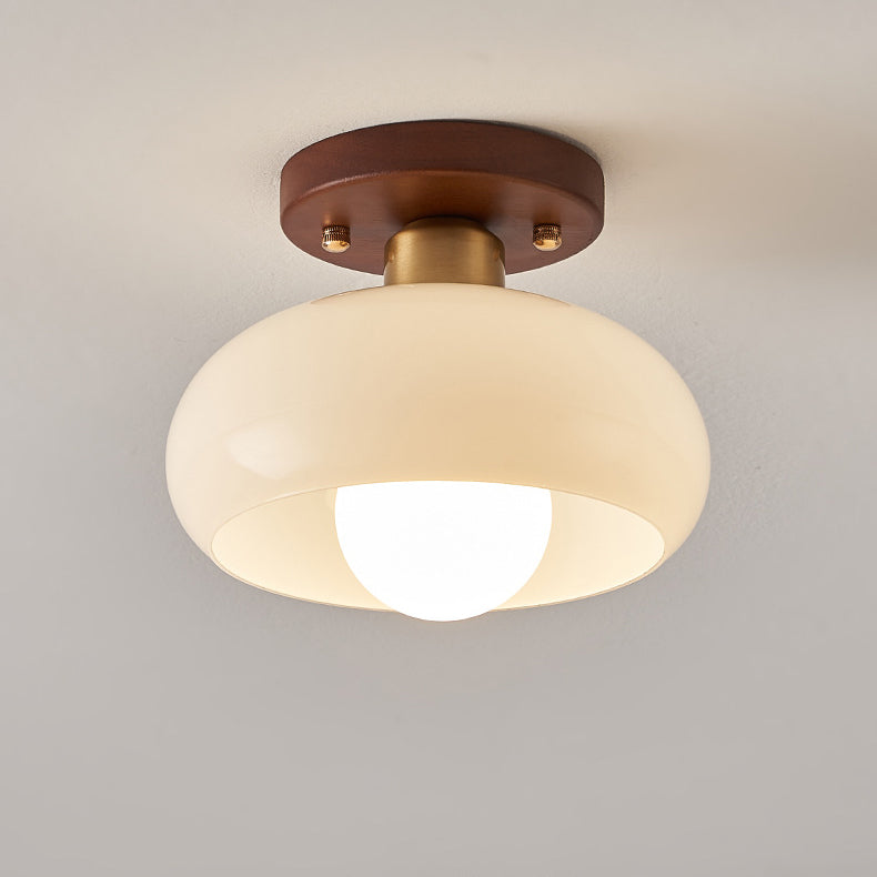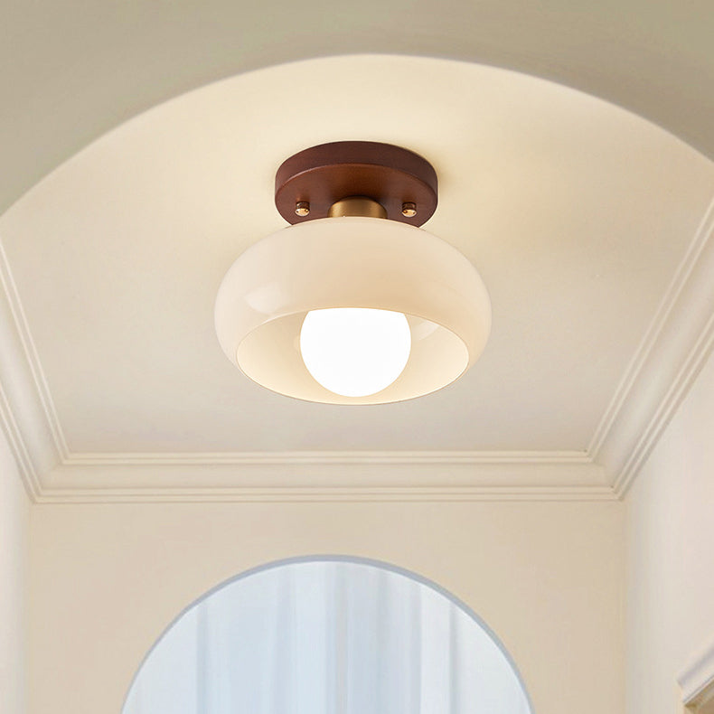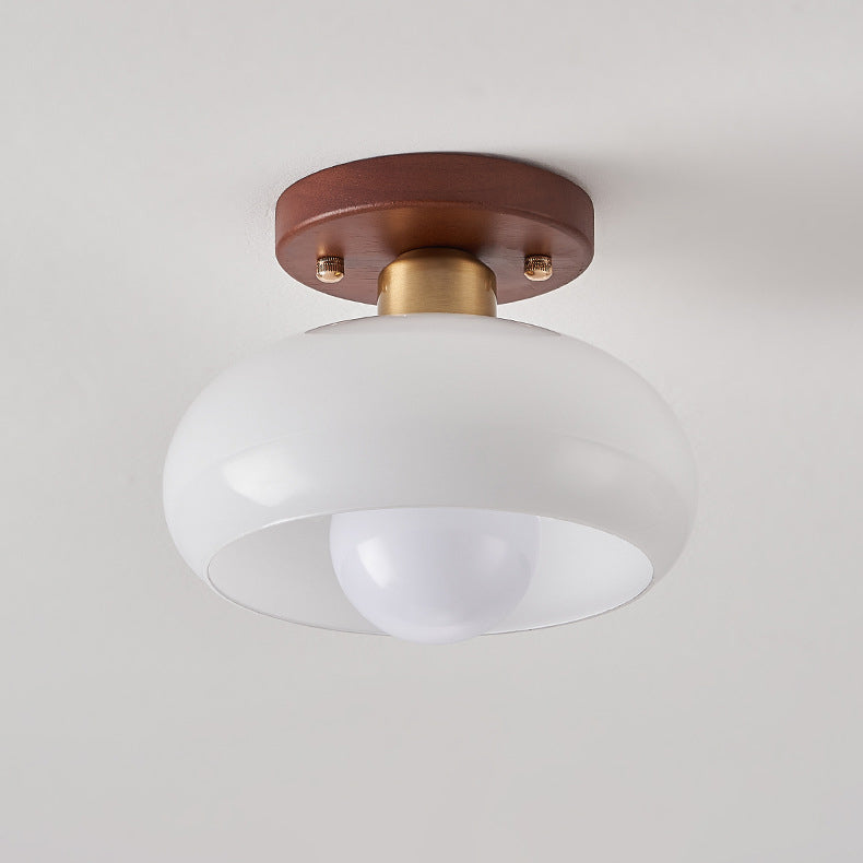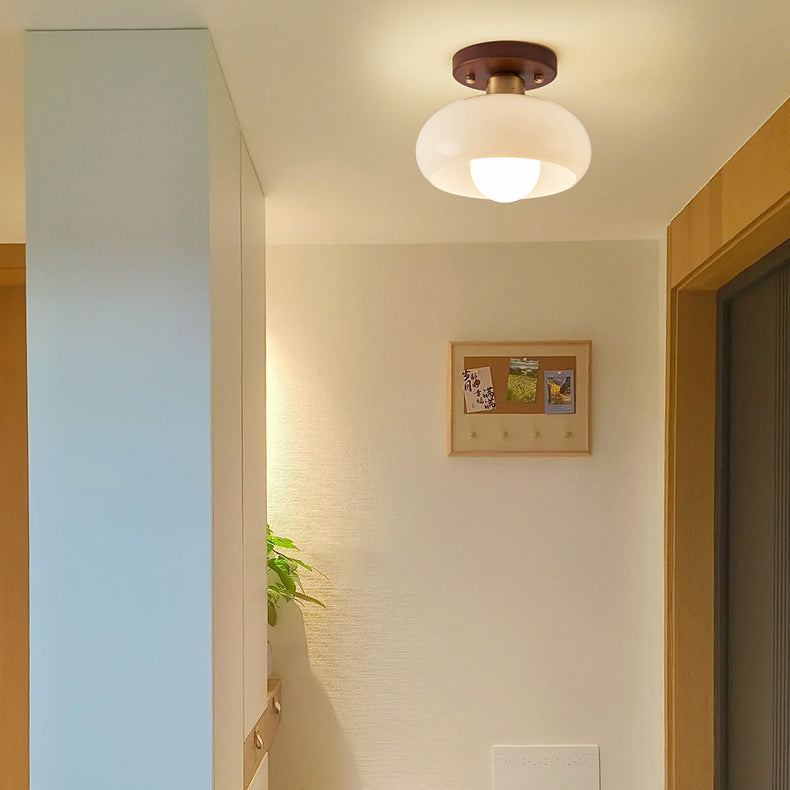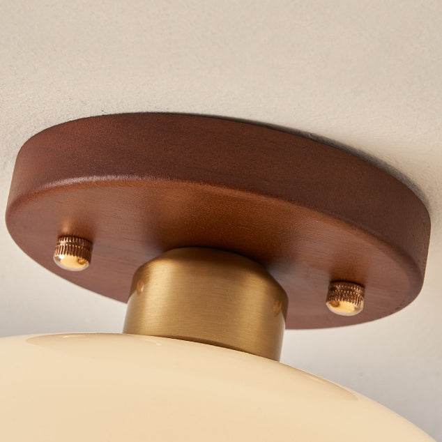مصباح سقف عصري بتصميم عتيق على شكل كرة بيضاوية دائرية بإطار خشبي وغطاء زجاجي مزود بضوء واحد وتركيب شبه مسطح لغرفة المعيشة