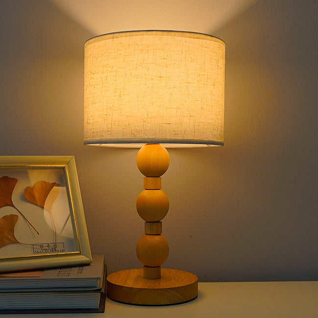 Contemporary Retro USB Cylinder Fabric Shade Wood Bead Base LED Table Lamp For Bedroom