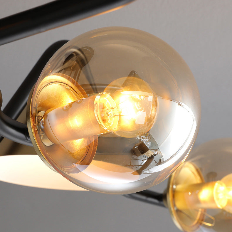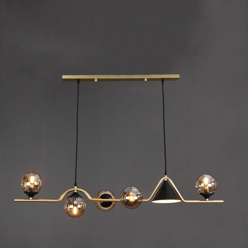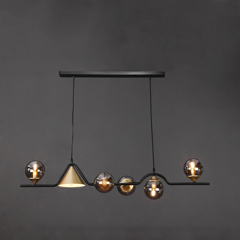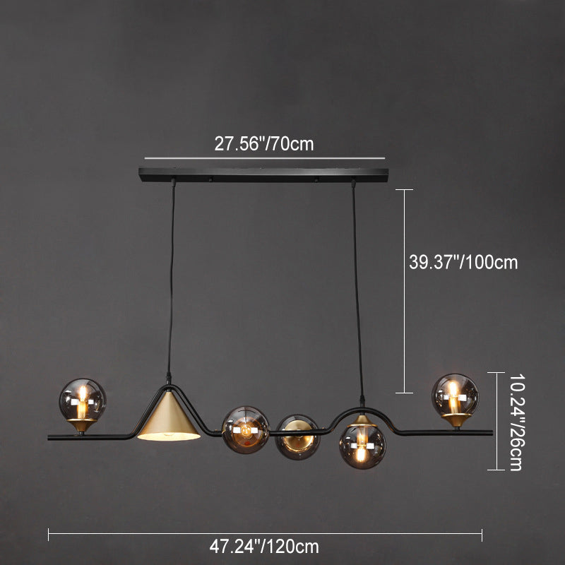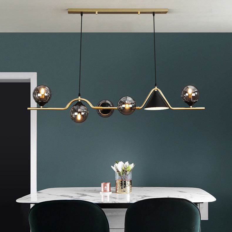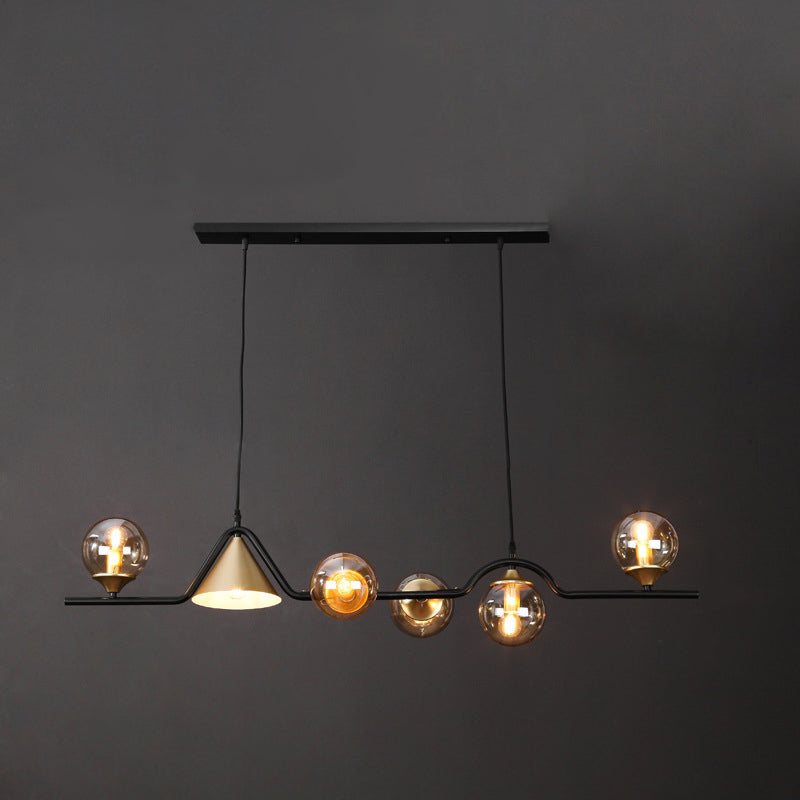 ثريا جزيرة من الحديد والزجاج بتصميم مخروطي طويل مستدير على الطراز الاسكندنافي لغرفة الطعام، مزودة بستة مصابيح