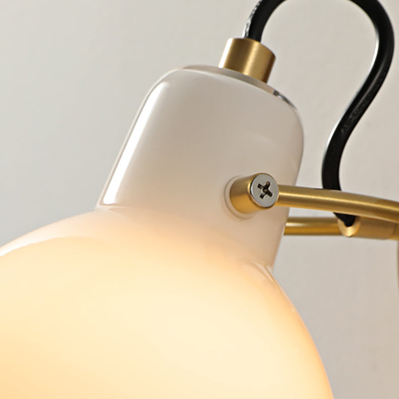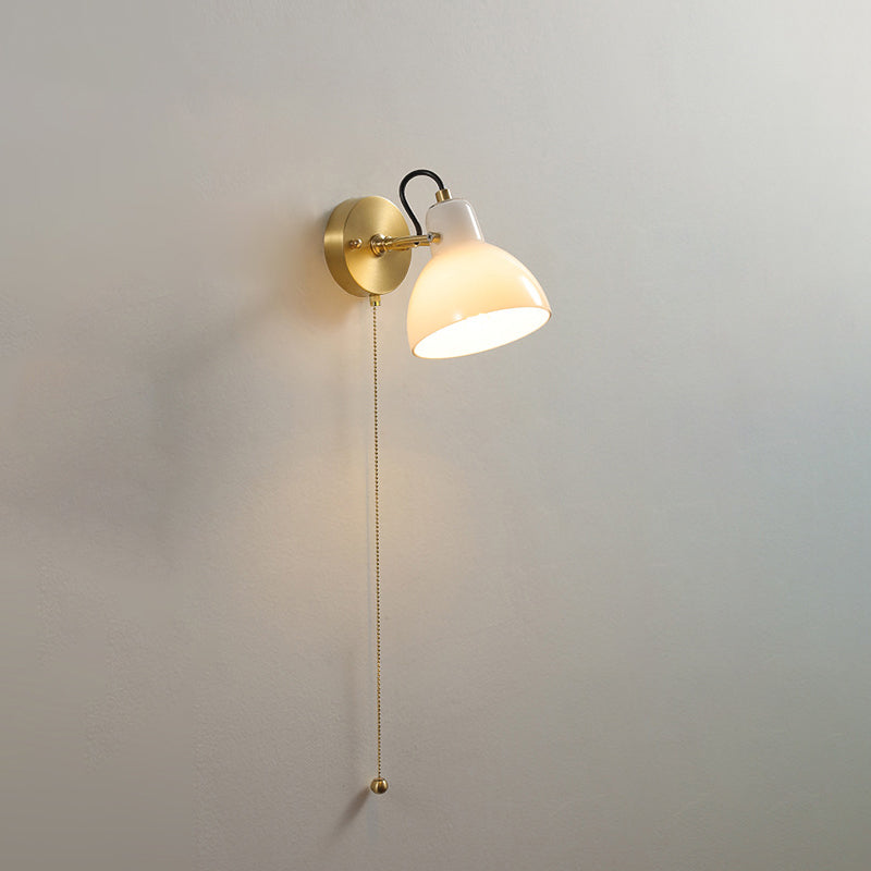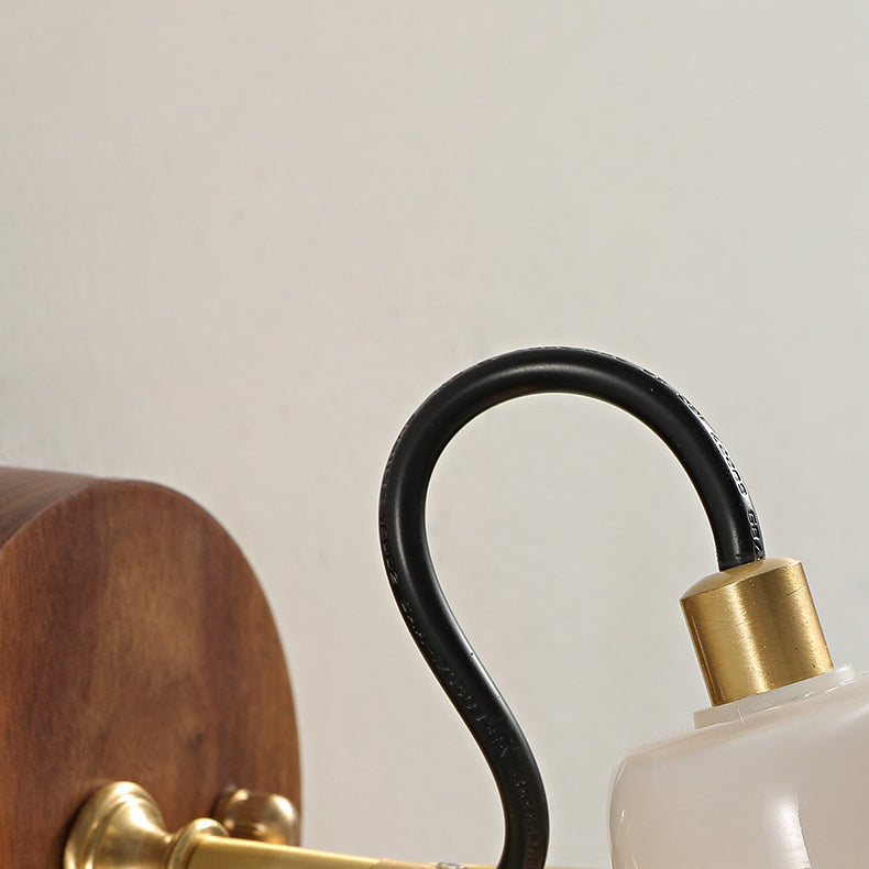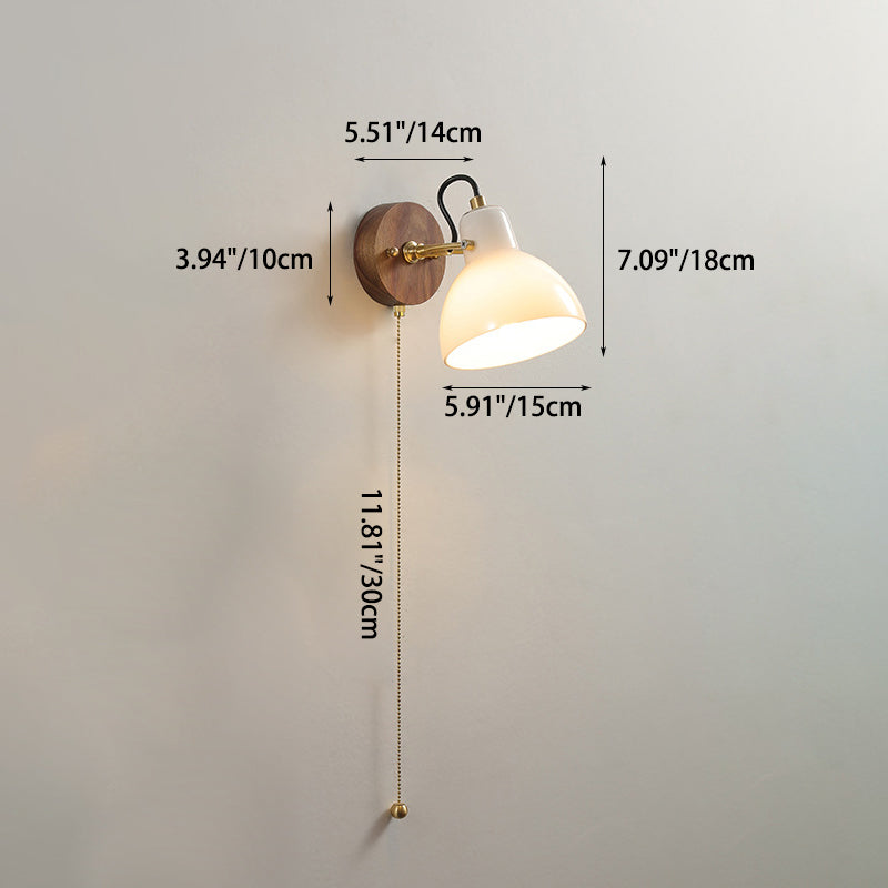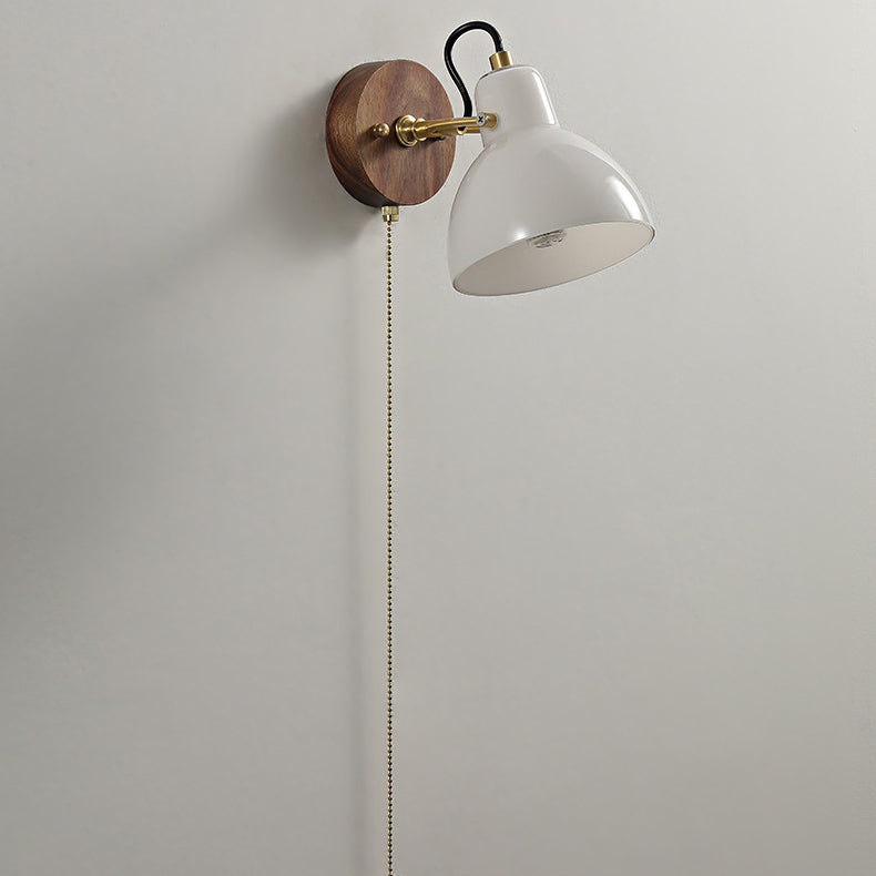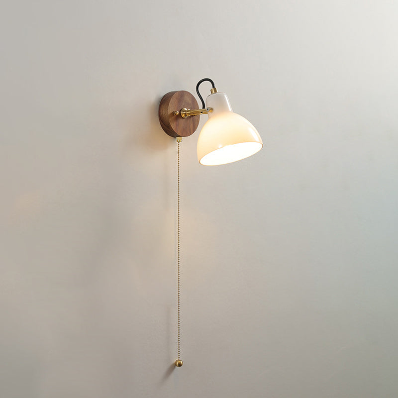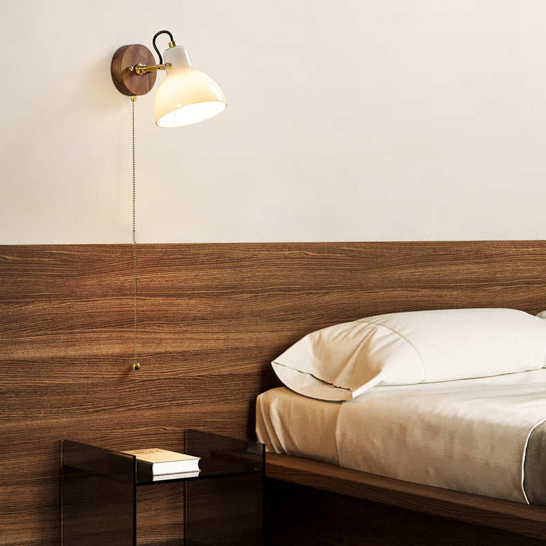 مصباح حائطي بتصميم بسيط معاصر مصنوع من النحاس والخشب والزجاج، بتصميم مخروطي دائري، مزود بإضاءة واحدة، مناسب لجانب السرير