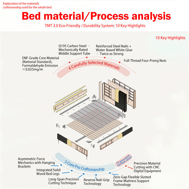 Constructed with ENF-certified solid wood multi-layer panels for strong stability and moisture resistance. Paint-free finish ensures an odorless, eco-friendly design, perfect for upholstered beds. -