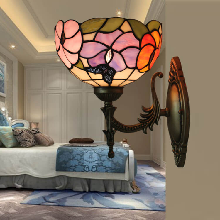 مصباح حائطي أوروبي من تيفاني بتصميم وعاء فراشات مزهر، مزود بإضاءة واحدة