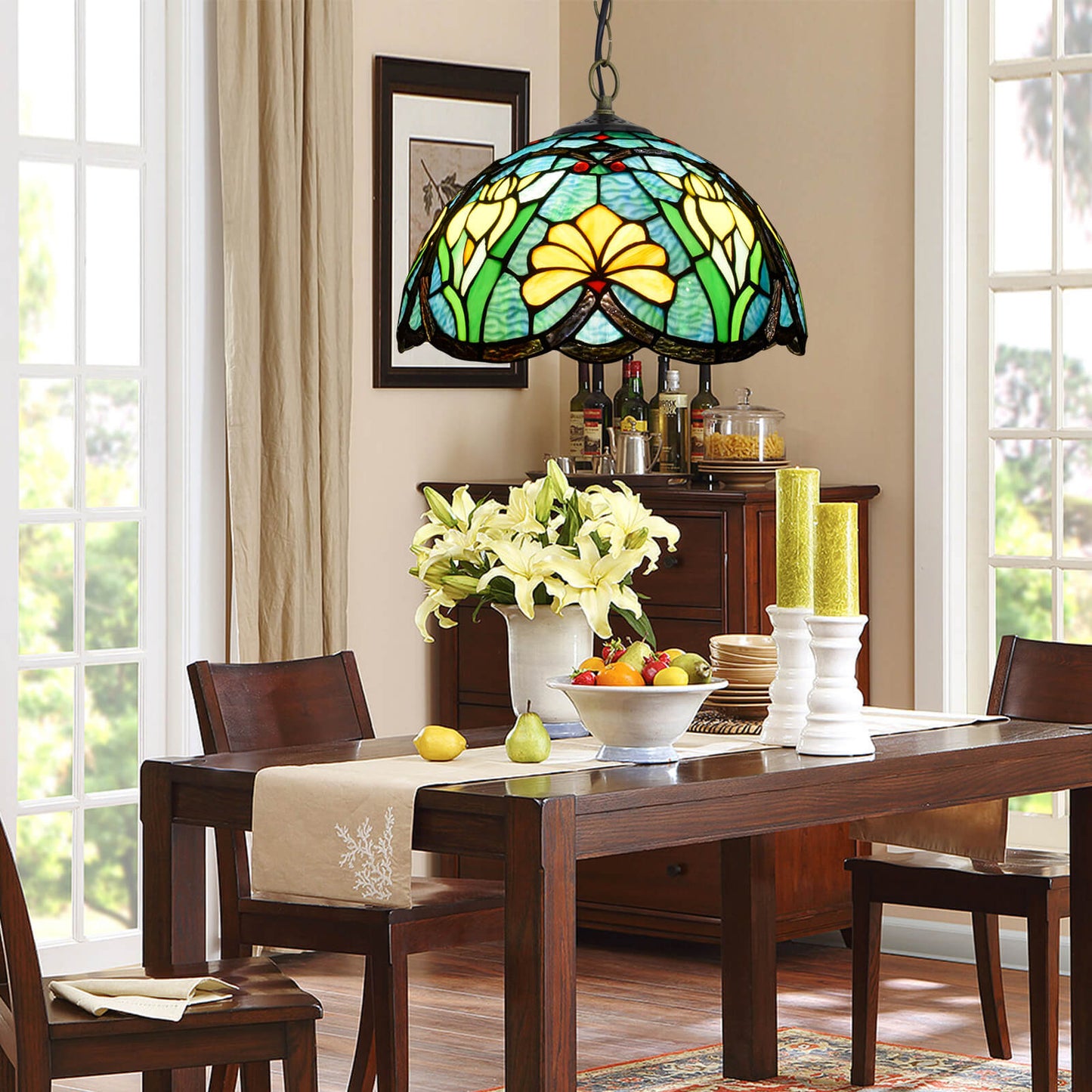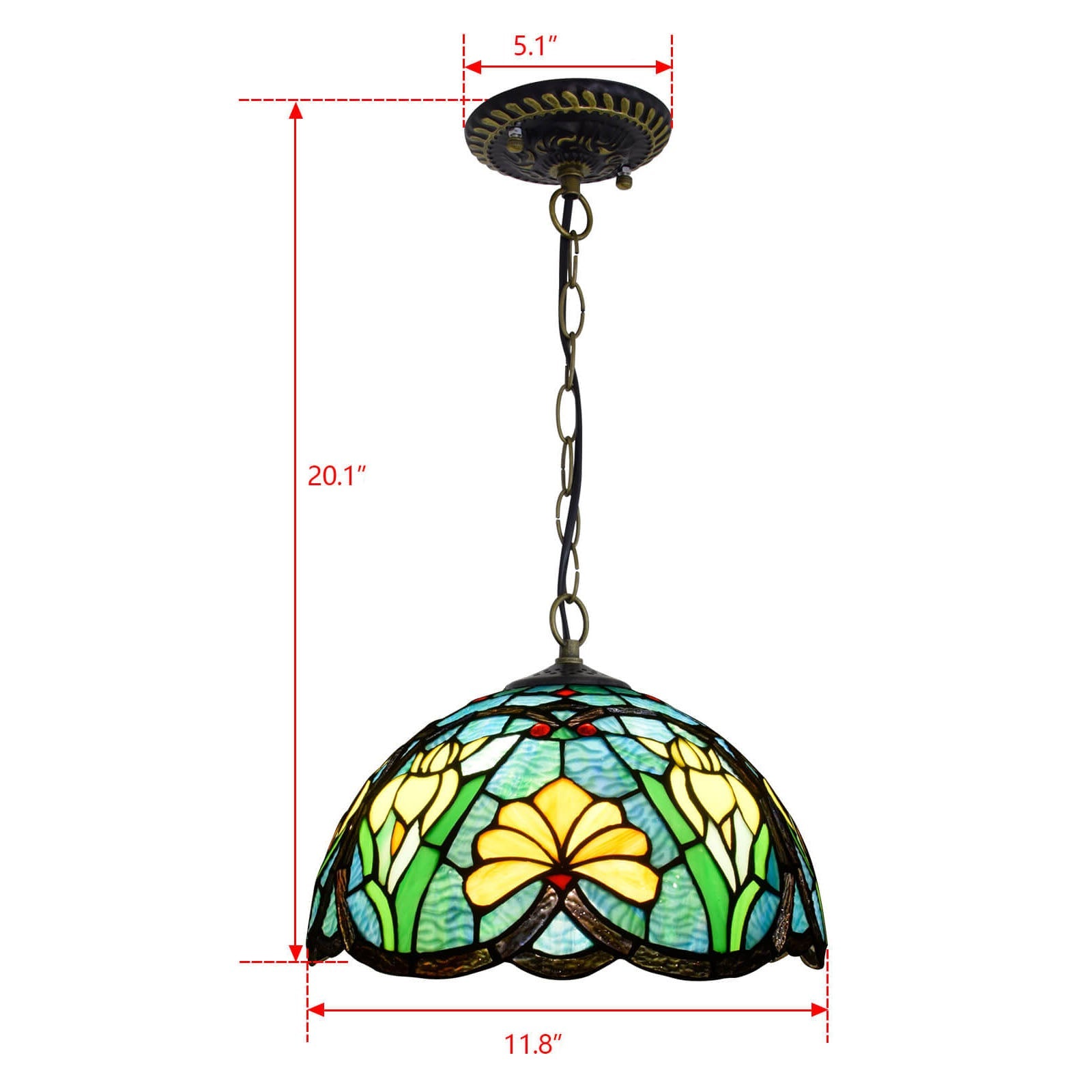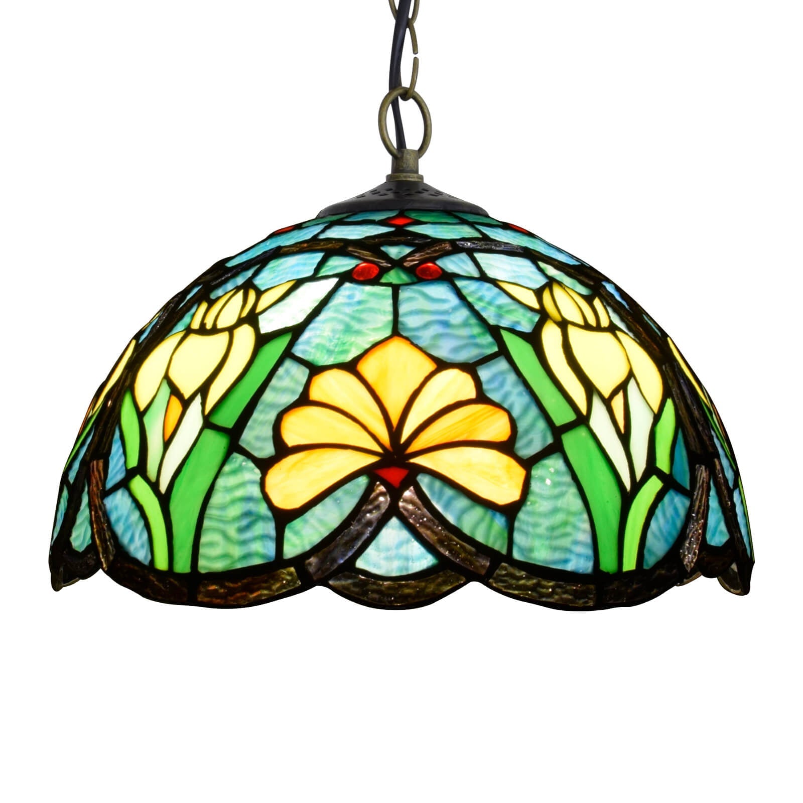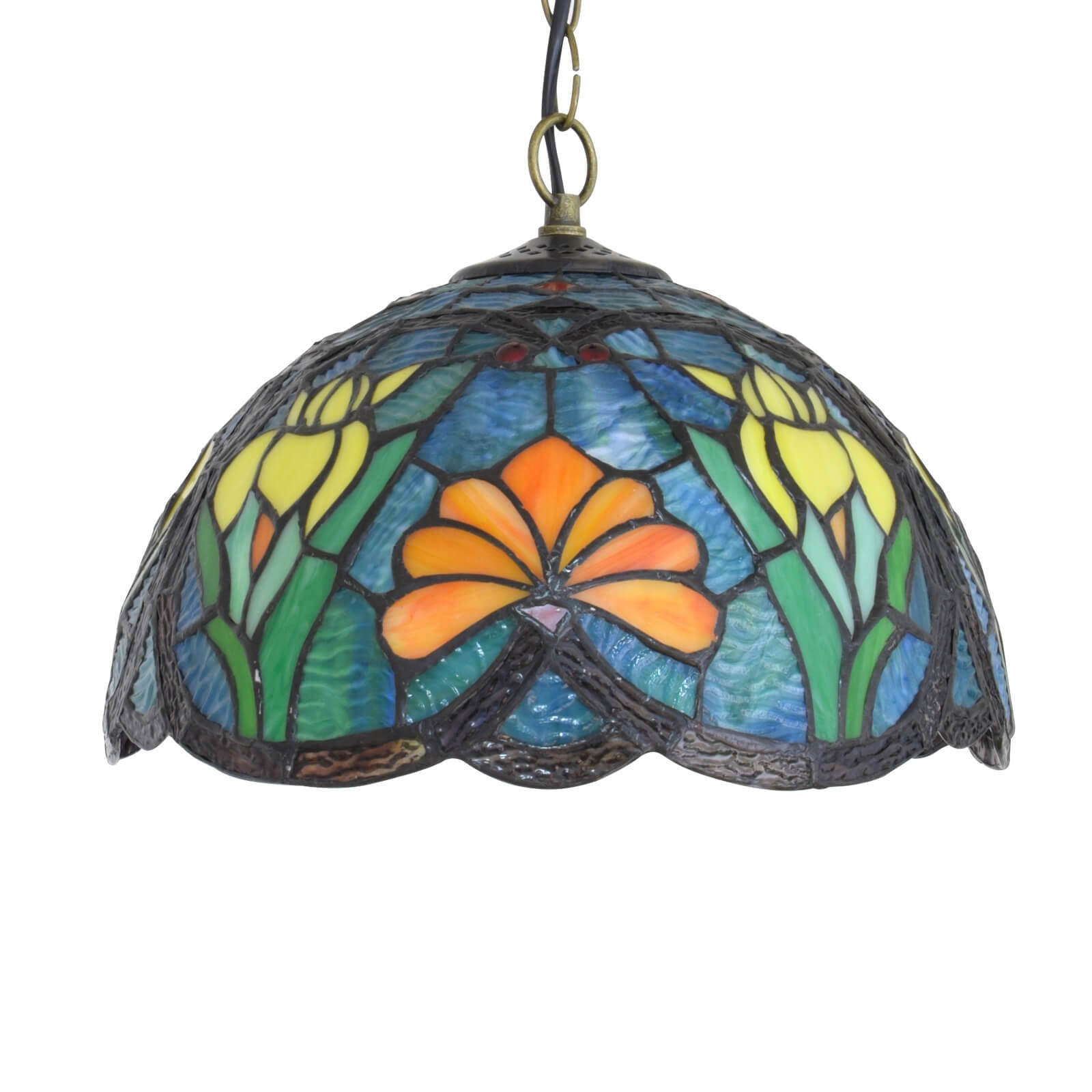 مصباح معلق أوروبي عتيق من الزجاج الملون على شكل زهور تيفاني وطيور، مزود بمصباح واحد