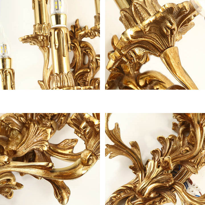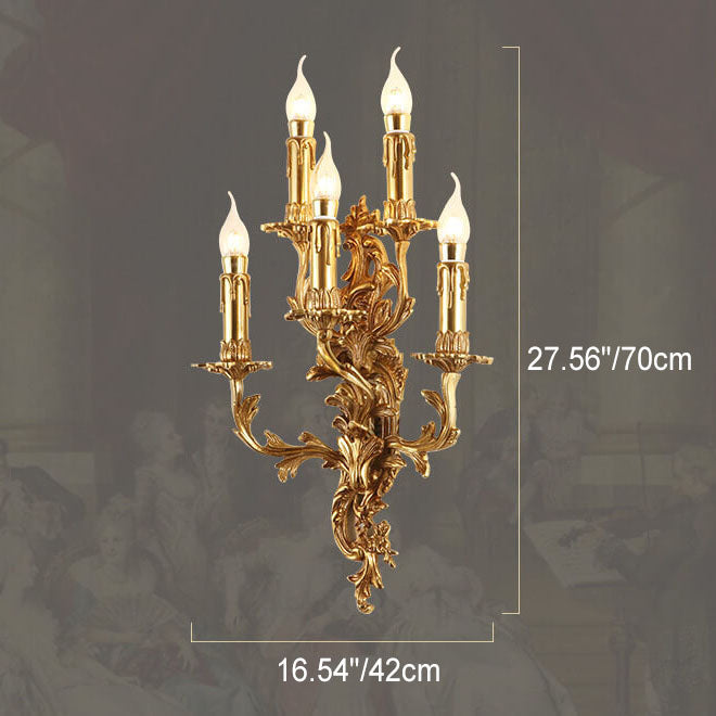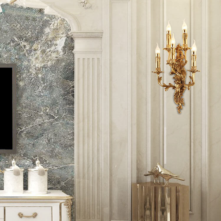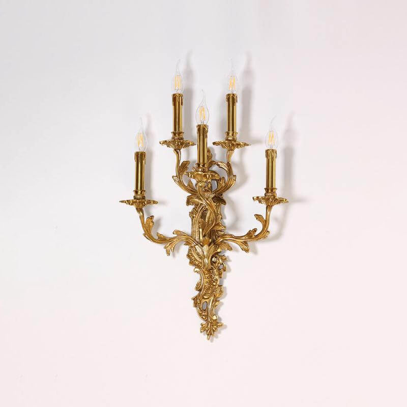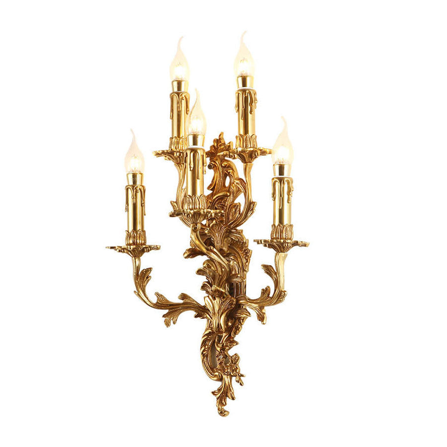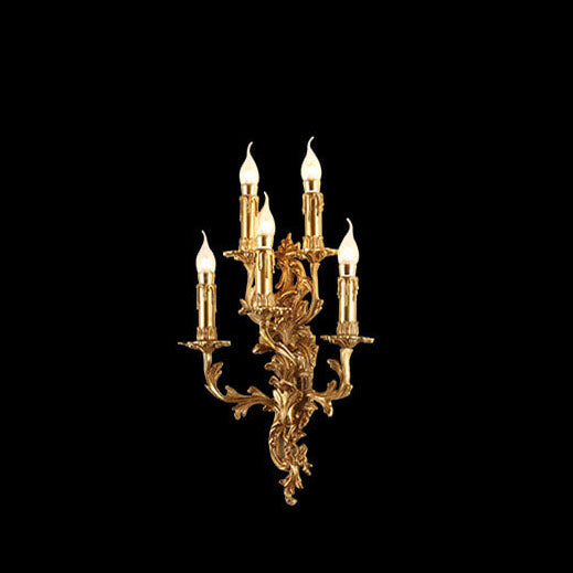 مصباح حائط فرنسي عتيق منحوت على شكل شمعة من النحاس الأصفر، مزود بخمسة مصابيح
