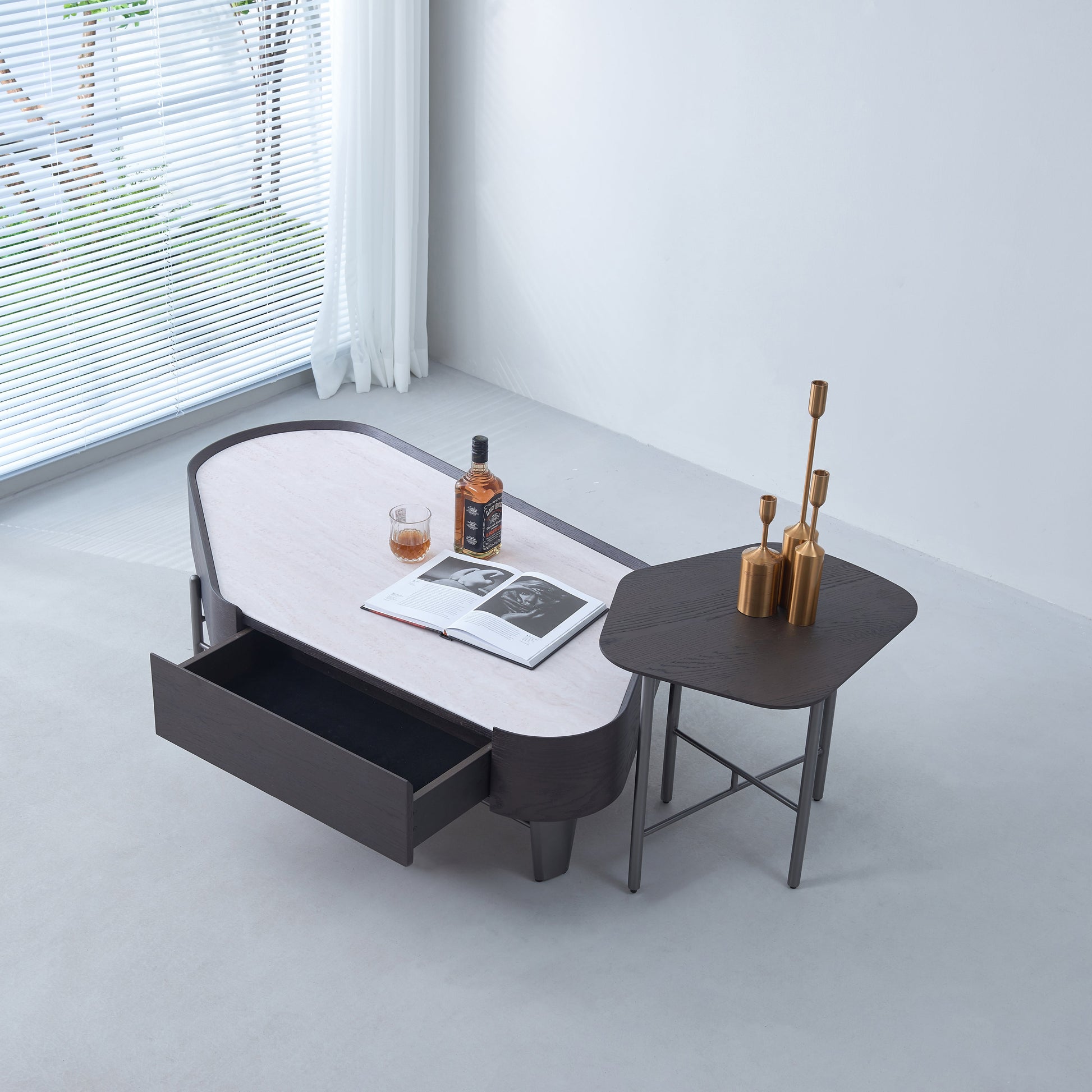 • Premium Surface: Natural wood veneer with rich grain and a genuine travertine inlay for elevated style.