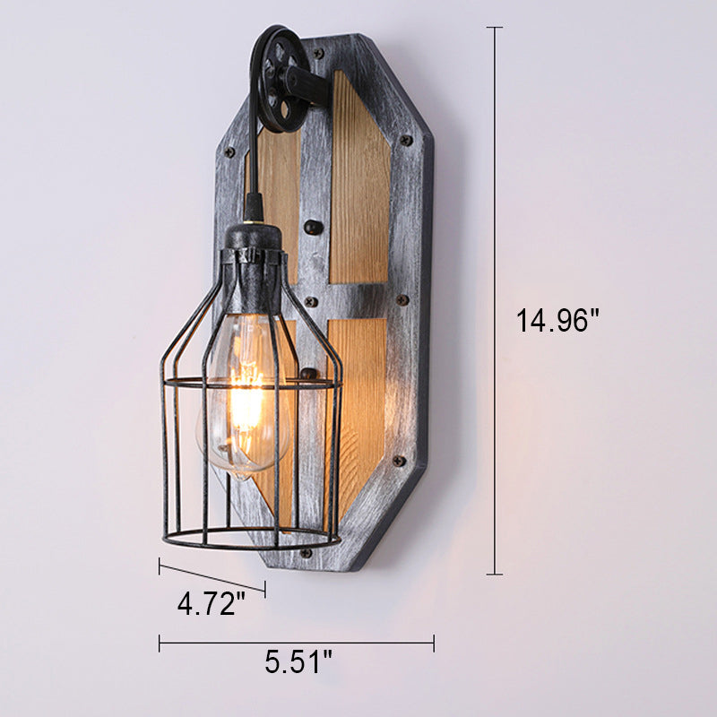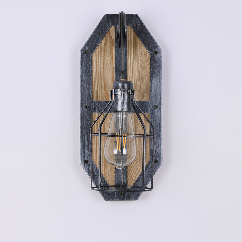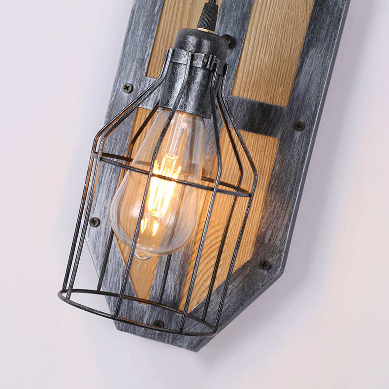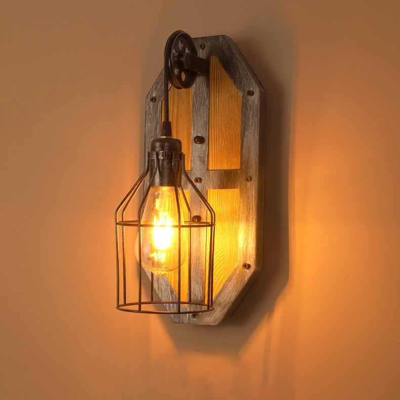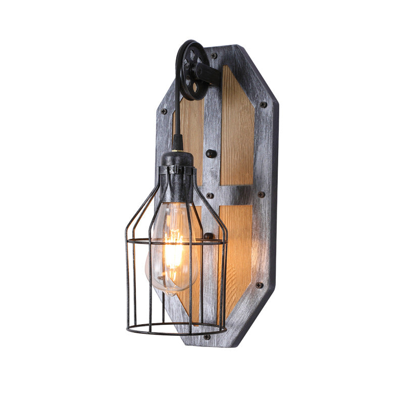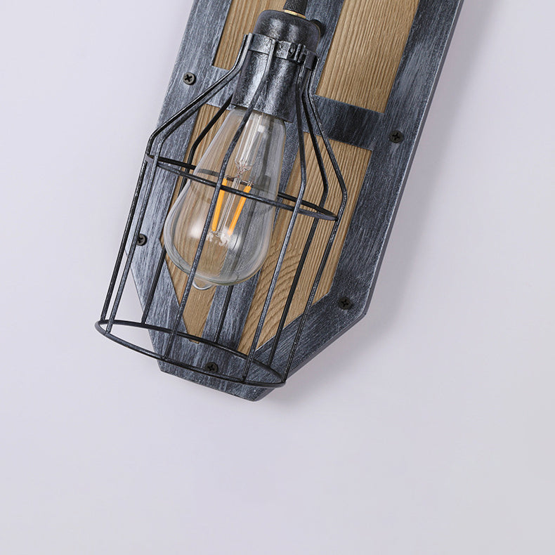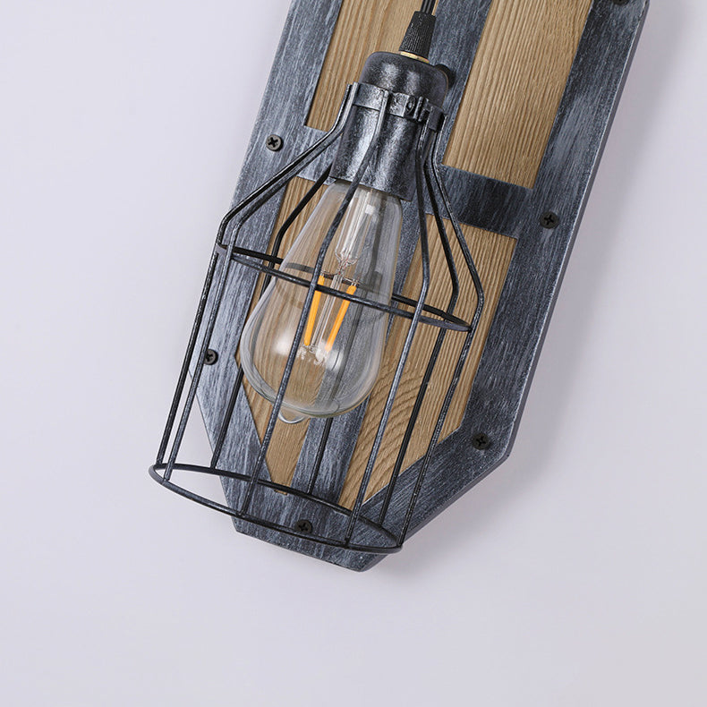 مصباح حائطي صناعي عتيق بقاعدة خشبية مع قفص ومصباح واحد