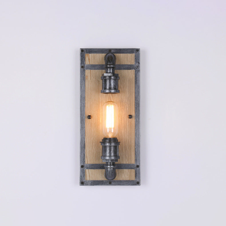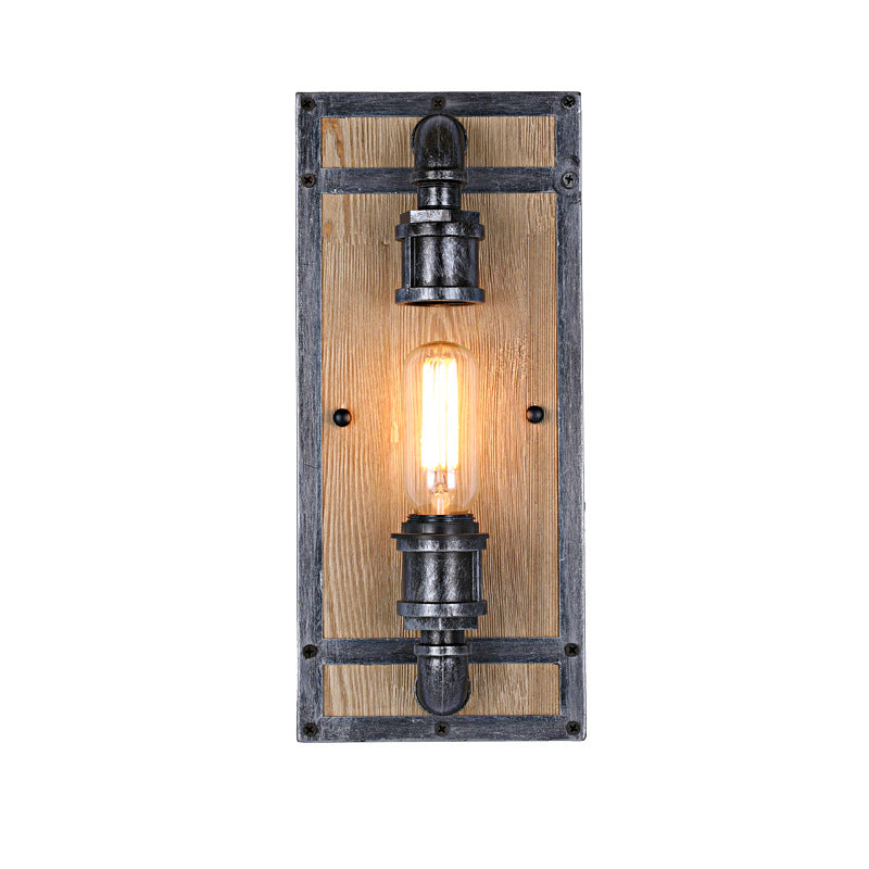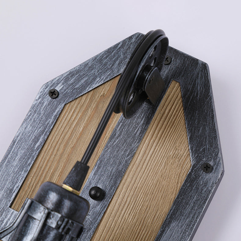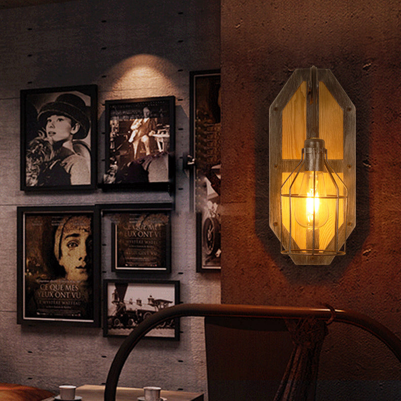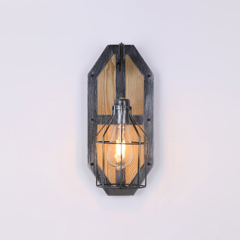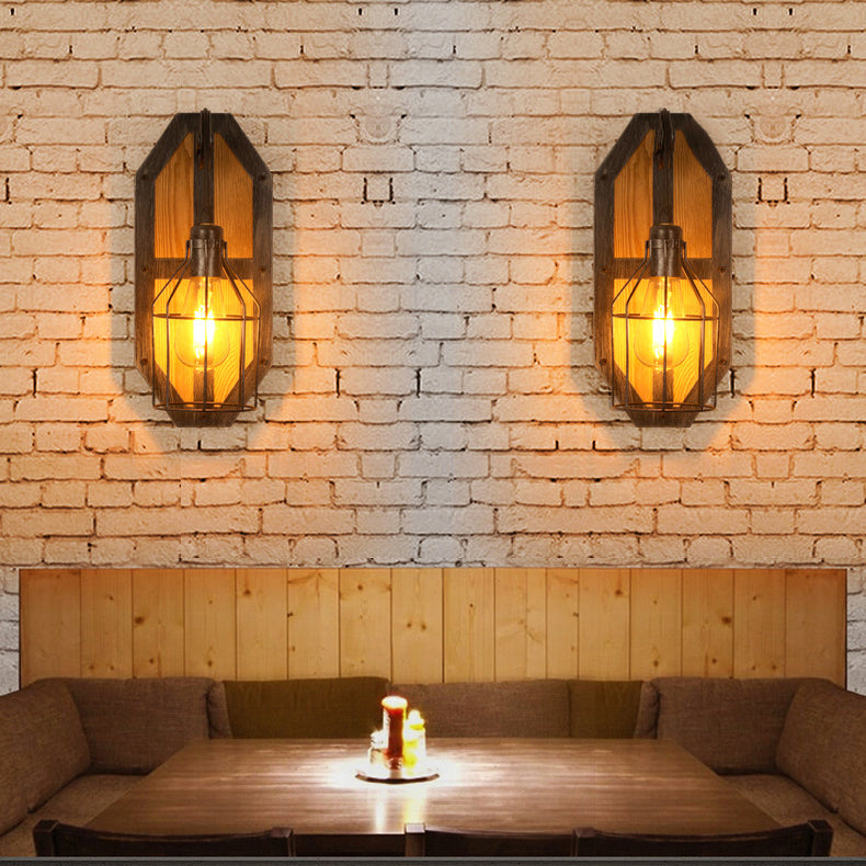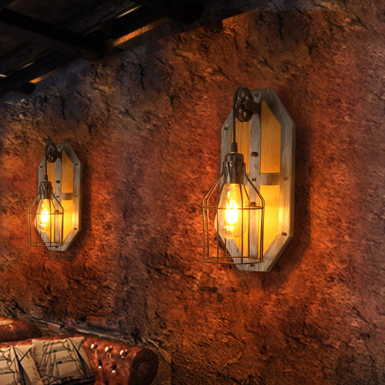 مصباح حائطي صناعي عتيق بقاعدة خشبية مع قفص ومصباح واحد