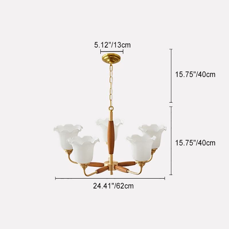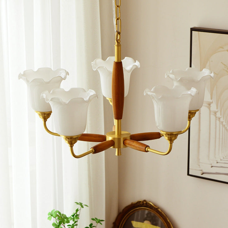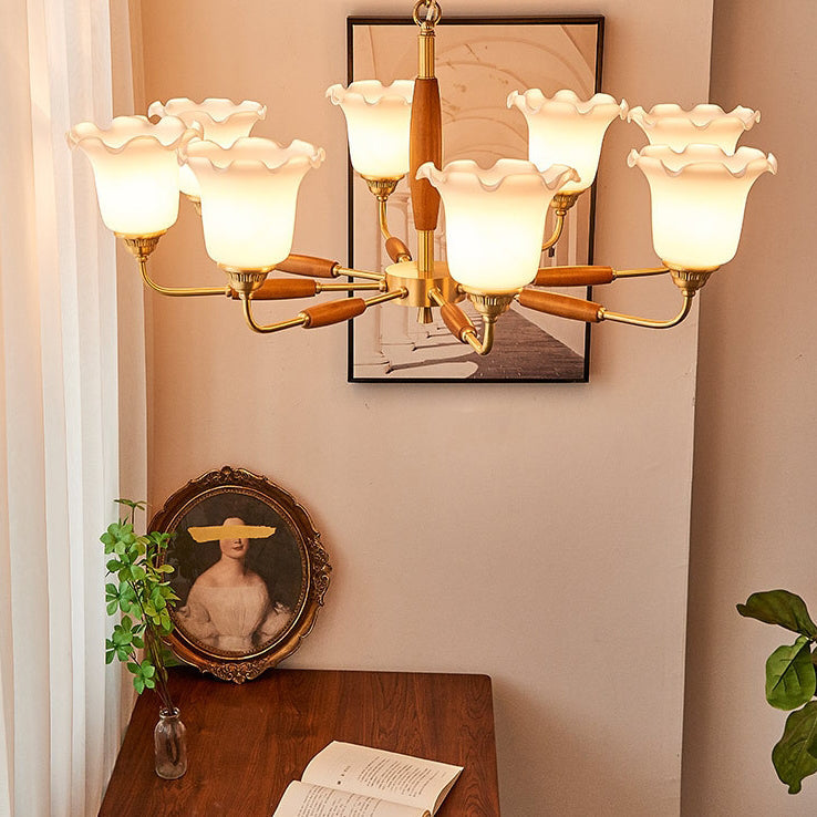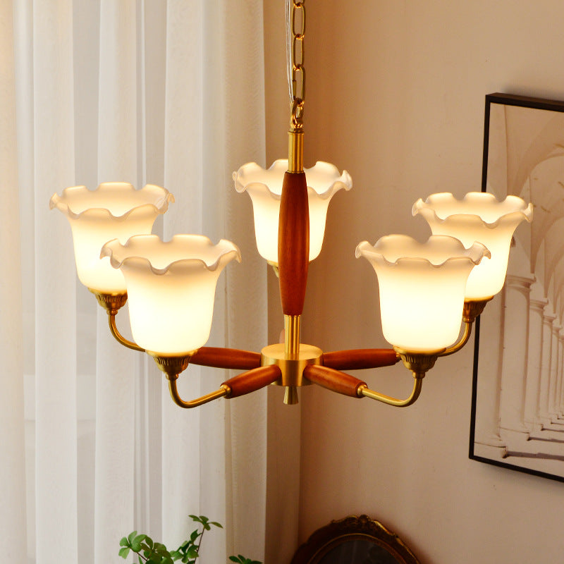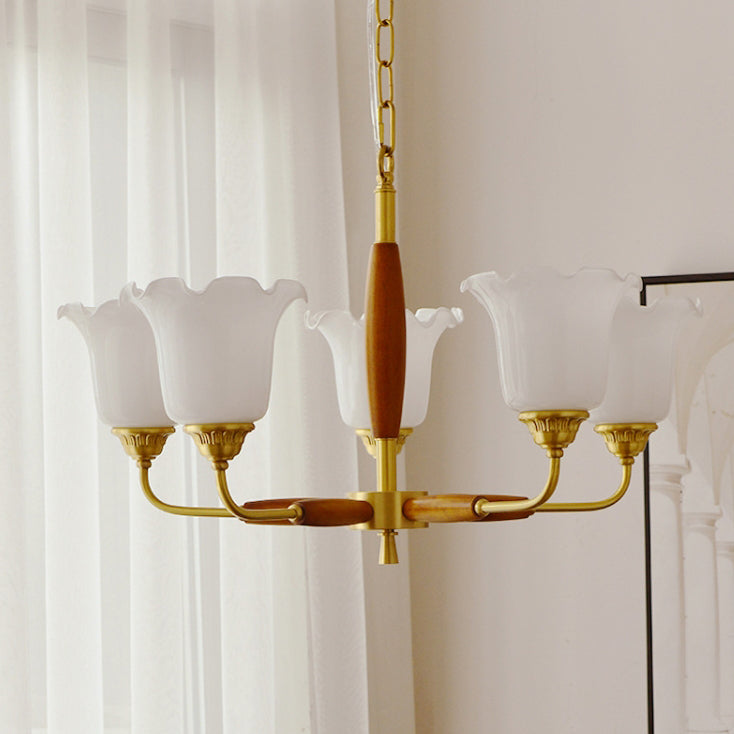 ثريا دائرية من النحاس والخشب والزجاج بتصميم فن الآرت ديكو الحديث، مكونة من 3/5/8 مصابيح لغرفة المعيشة