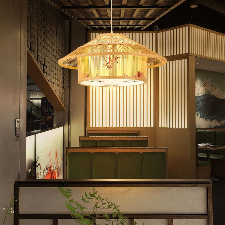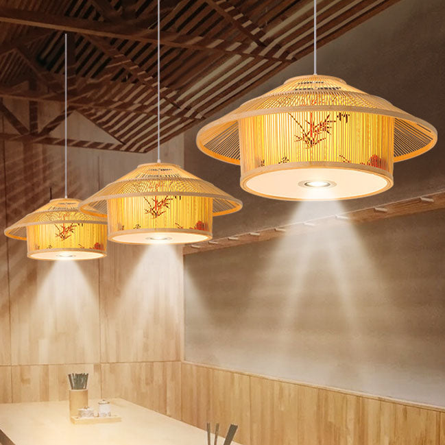 ثريا صينية حديثة مصنوعة من الخيزران على شكل قبعة فانوس مزودة بـ 2/6 مصابيح