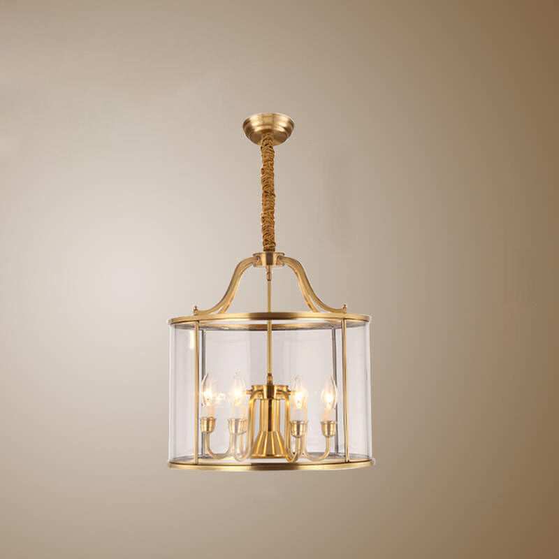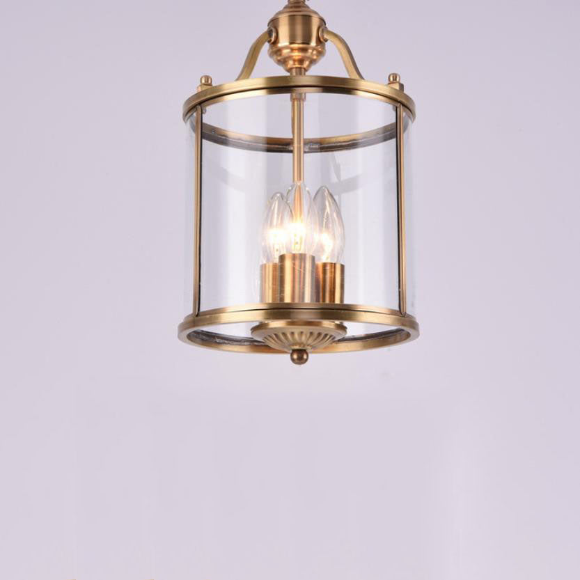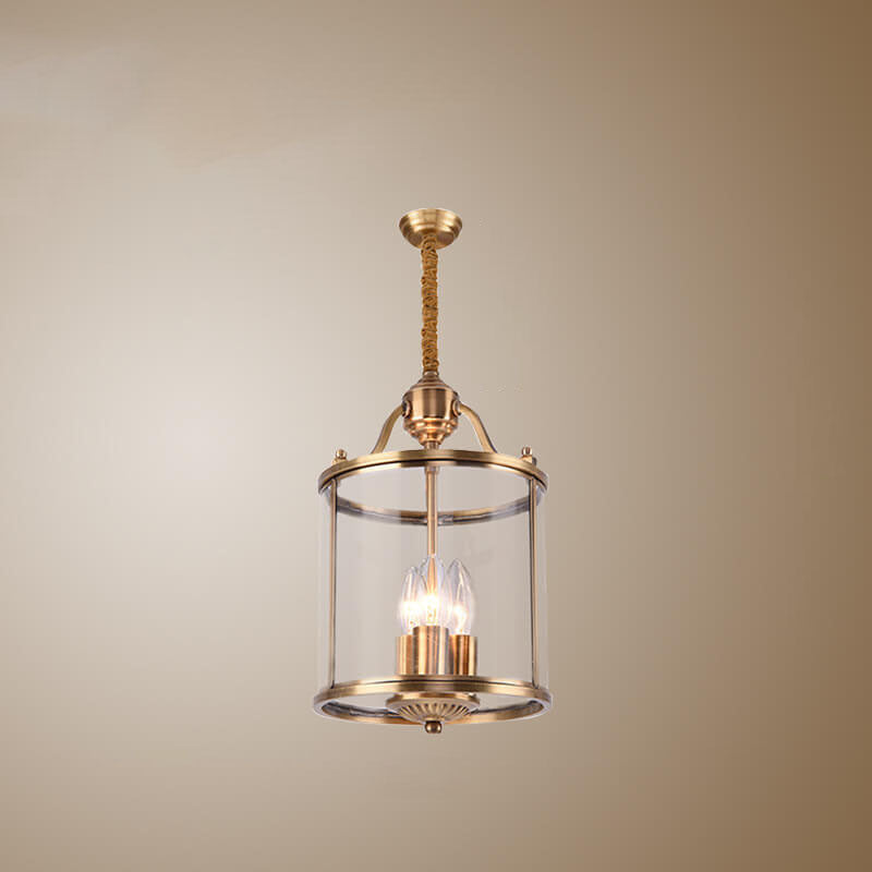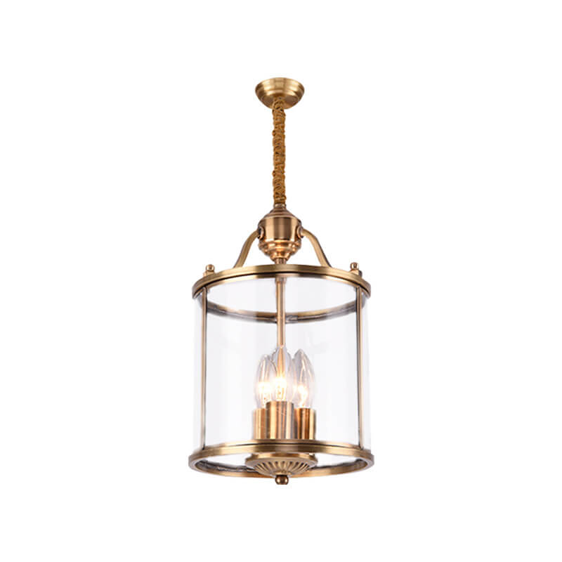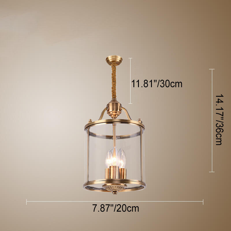 ثريا أسطوانية زجاجية نحاسية بالكامل بتصميم عصري جذاب، بثلاثة مصابيح وسبعة أضواء.