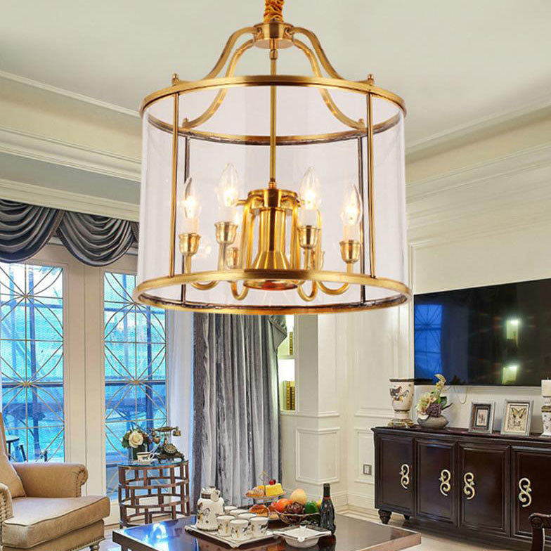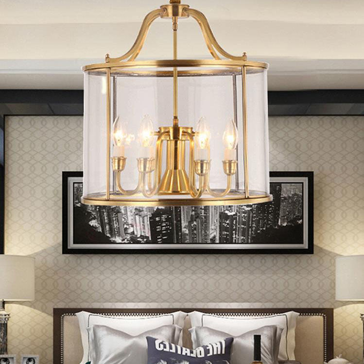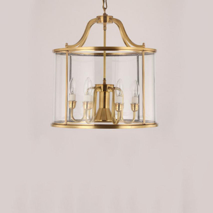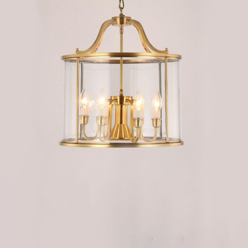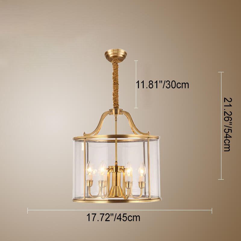 ثريا أسطوانية زجاجية نحاسية بالكامل بتصميم عصري جذاب، بثلاثة مصابيح وسبعة أضواء.