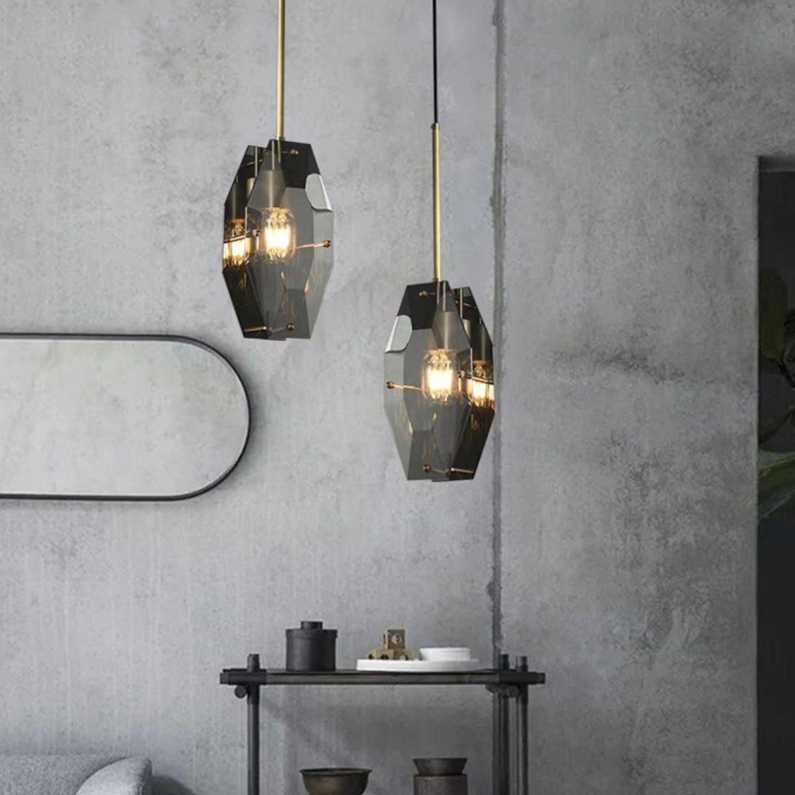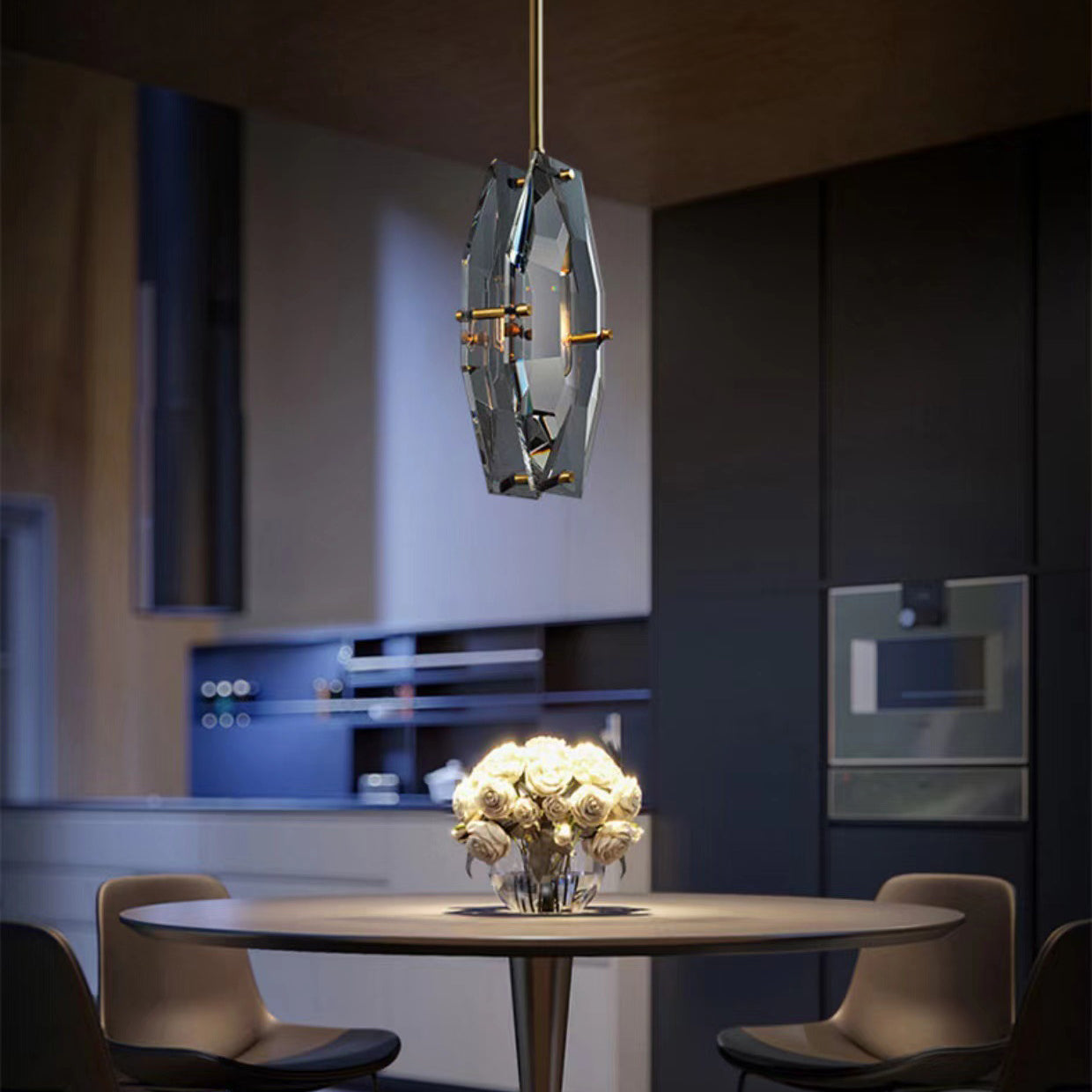 أضف لمسةً راقية إلى مساحتك مع هذا المصباح المعلق العصري الفاخر، بغطاء كريستالي هندسي رمادي دخاني ولمسة نهائية نحاسية دافئة. مصمم لتوزيع الضوء بالتساوي، وهو مثالي لغرف النوم، وغرف الطعام، أو ديكورات الفنادق الفاخرة.