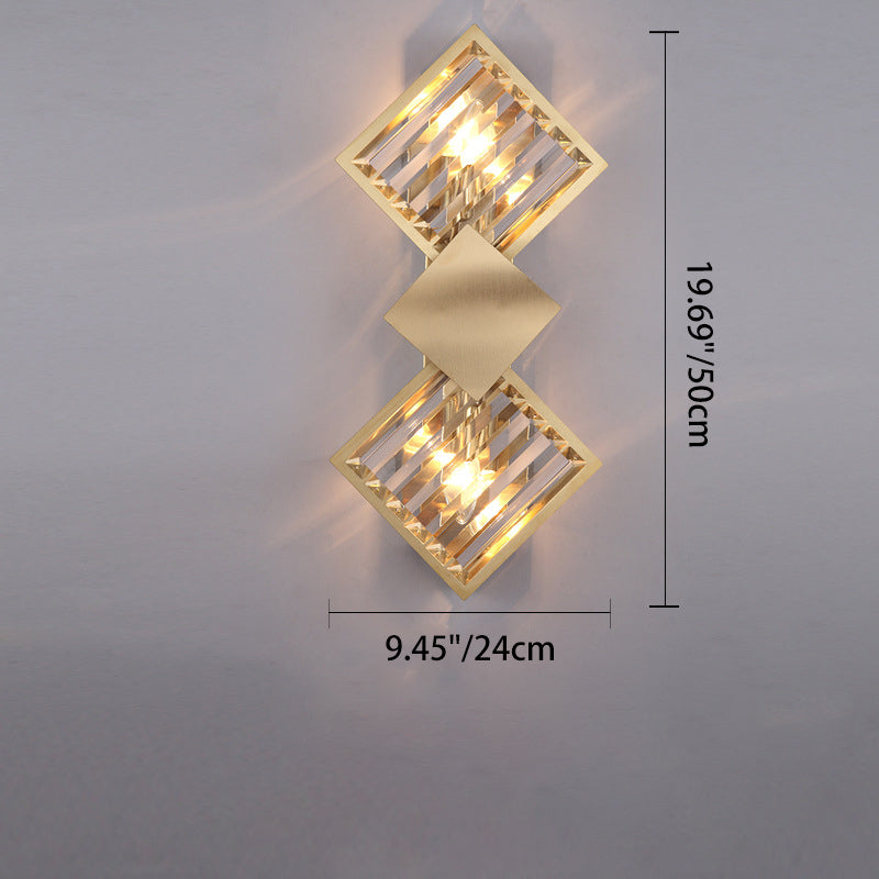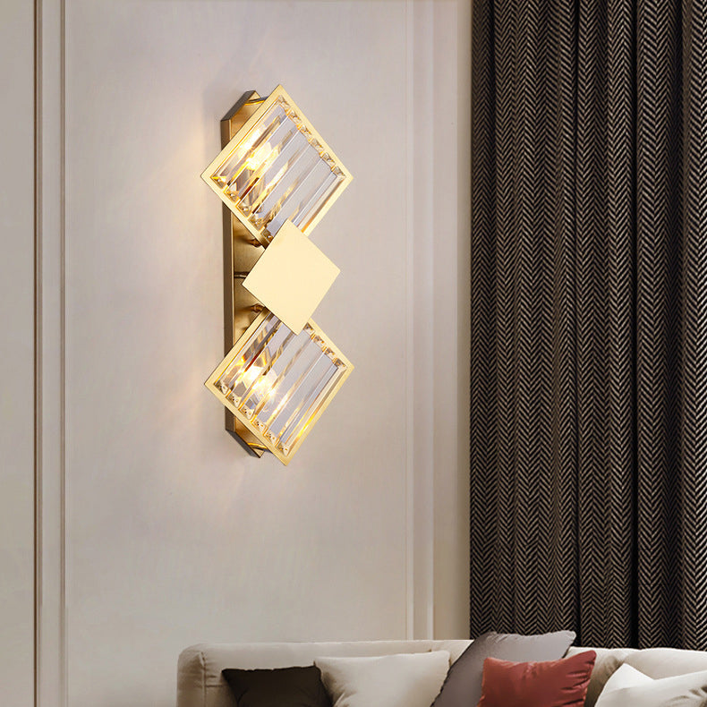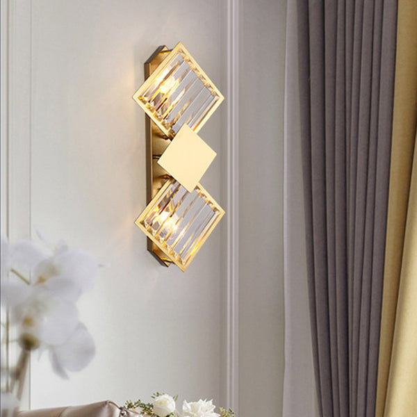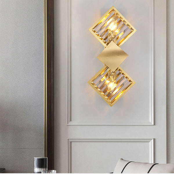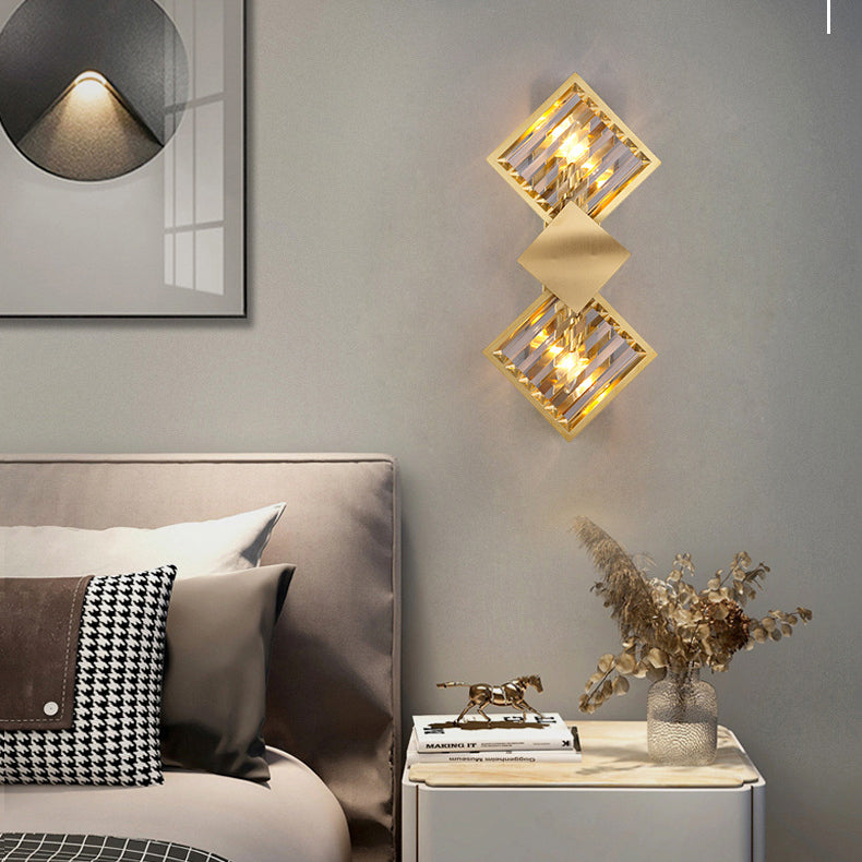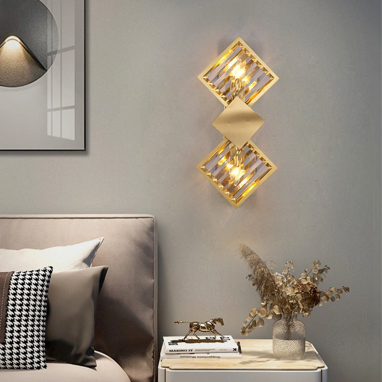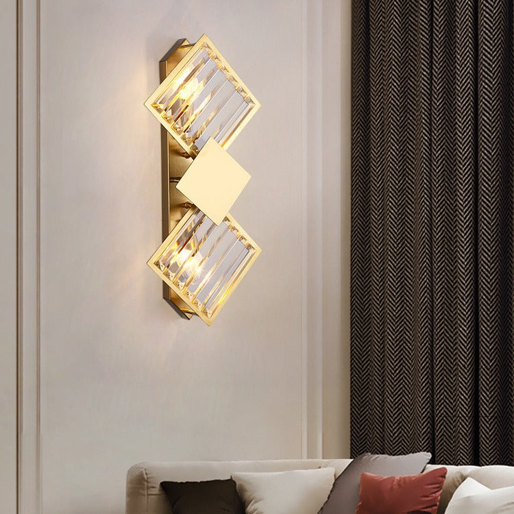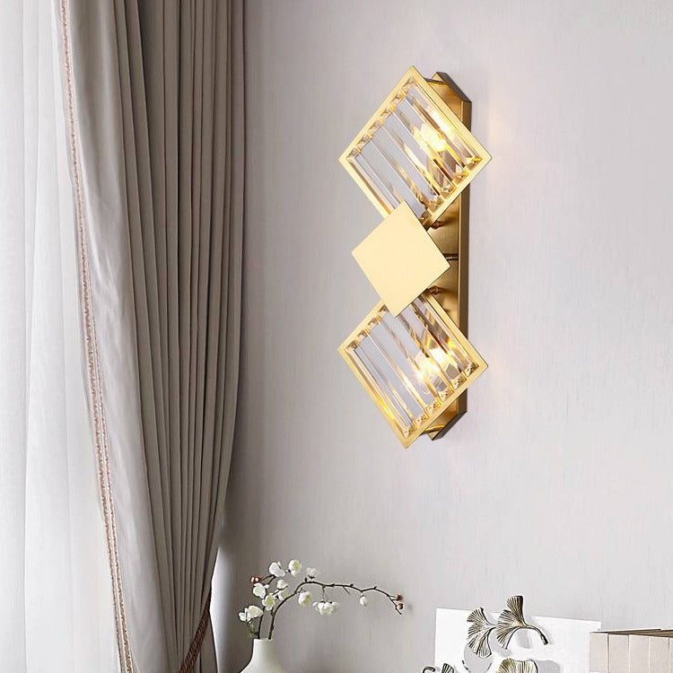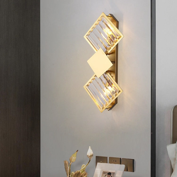 مصباح حائطي عصري فاخر مربع الشكل مصنوع من زجاج كريستالي وفولاذ مقاوم للصدأ ومكون من مصباحين لغرفة المعيشة
