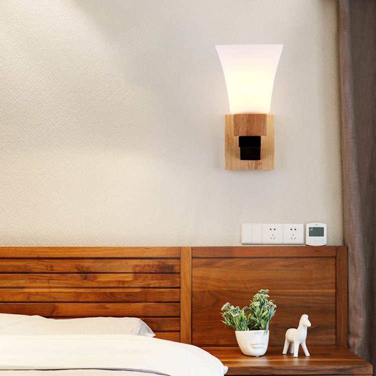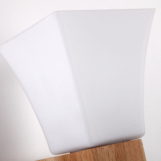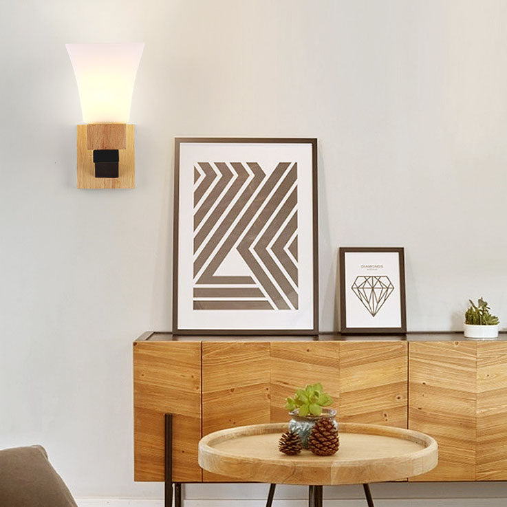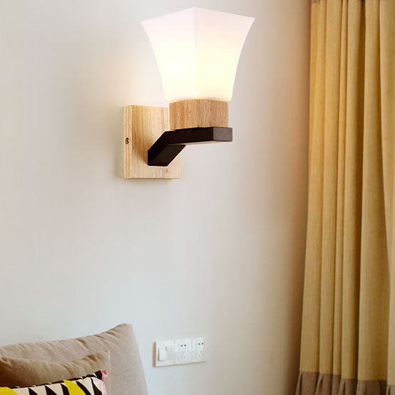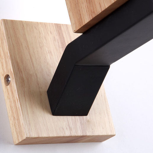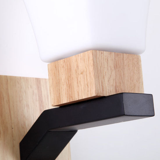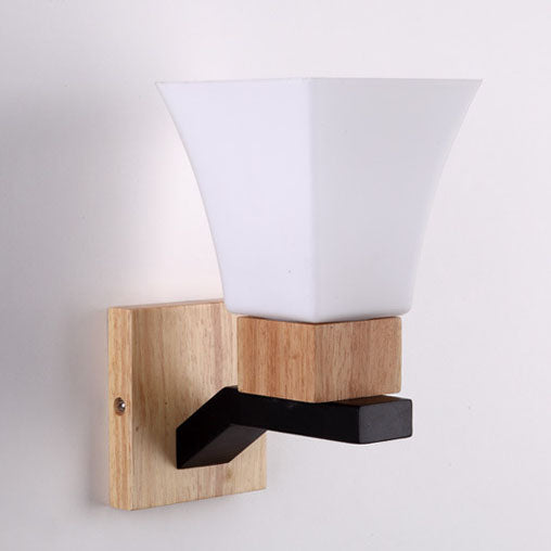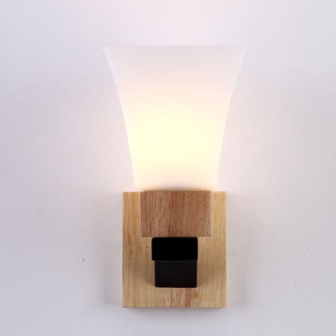 مصباح حائطي بتصميم عصري بسيط على شكل مربع من الخشب الصلب والزجاج والحديد، مزود بمصباح واحد