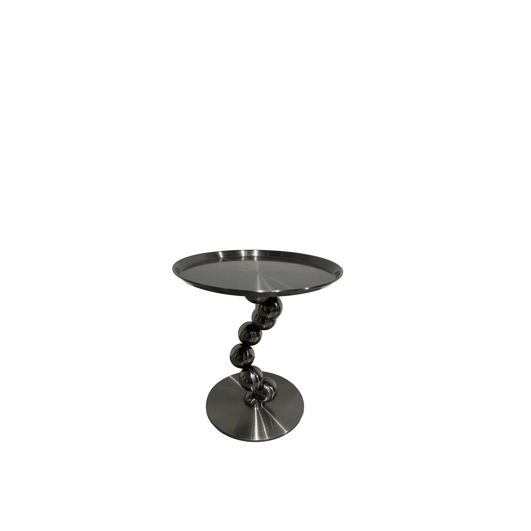 This stainless steel black titanium side table showcases a bold geometric design with stacked mirrored spheres, blending art and function. Its dynamic form catches light beautifully, creating a striking focal point.