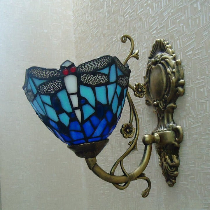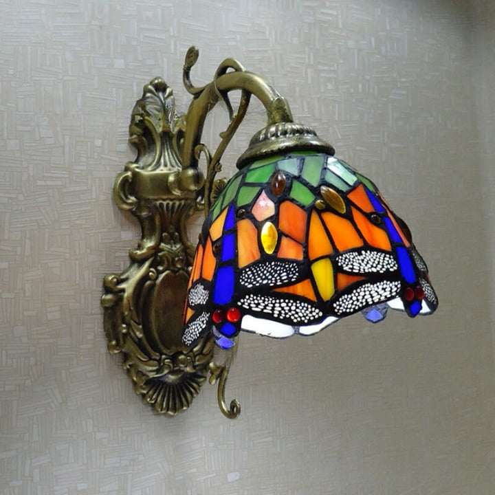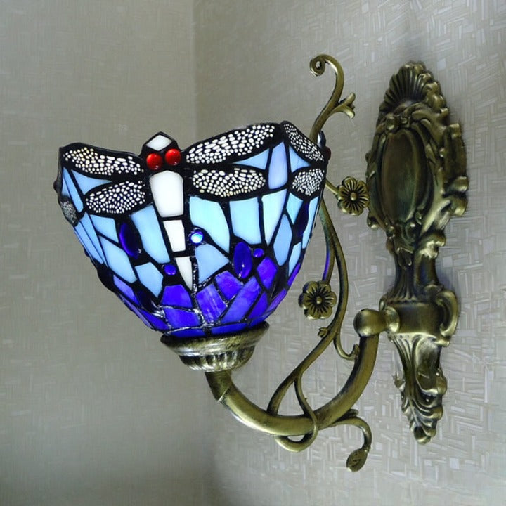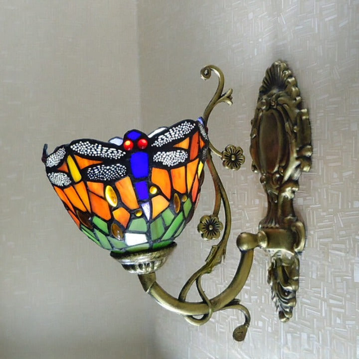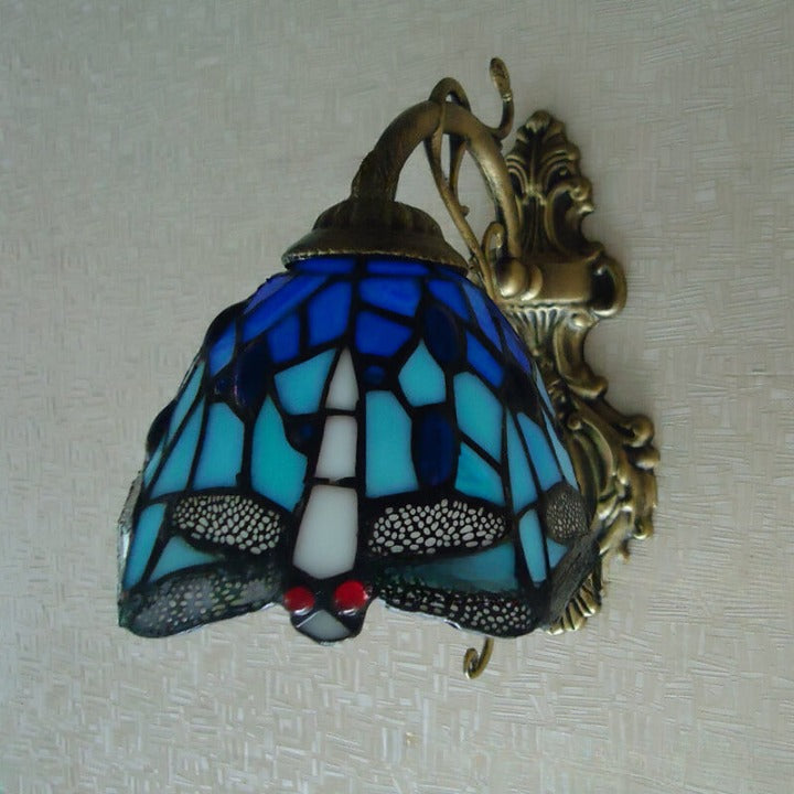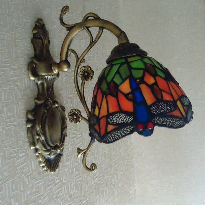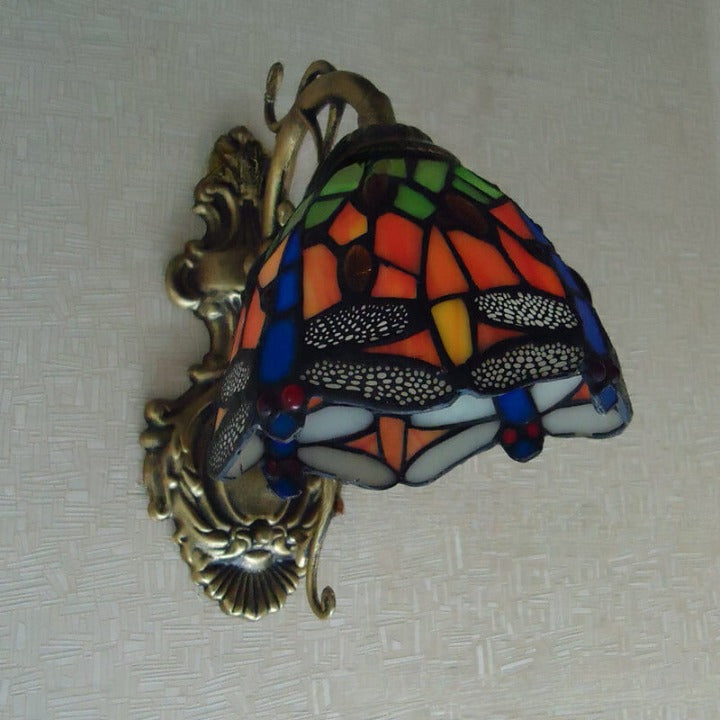مصباح حائط تيفاني المصنوع يدويًا من الزجاج الملون على شكل يعسوب، مزود بضوء واحد