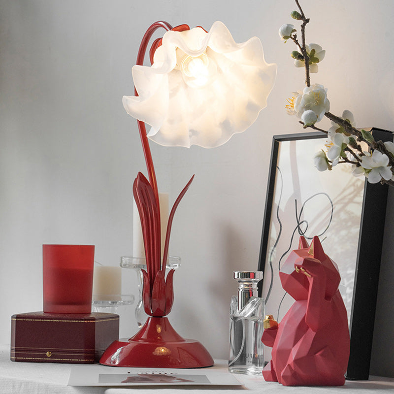Celebrate love and tradition with this red floral table lamp, featuring a single light source and an elegant iron and glass construction. Perfect as a wedding bedside lamp or bridal gift, it adds a warm romantic glow to any bedroom décor.