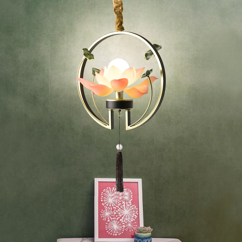 مصباح معلق دائري من الراتنج والسيراميك والحديد على شكل لوتس صيني تقليدي لغرفة النوم