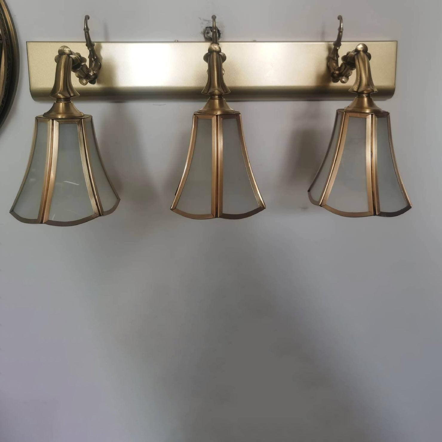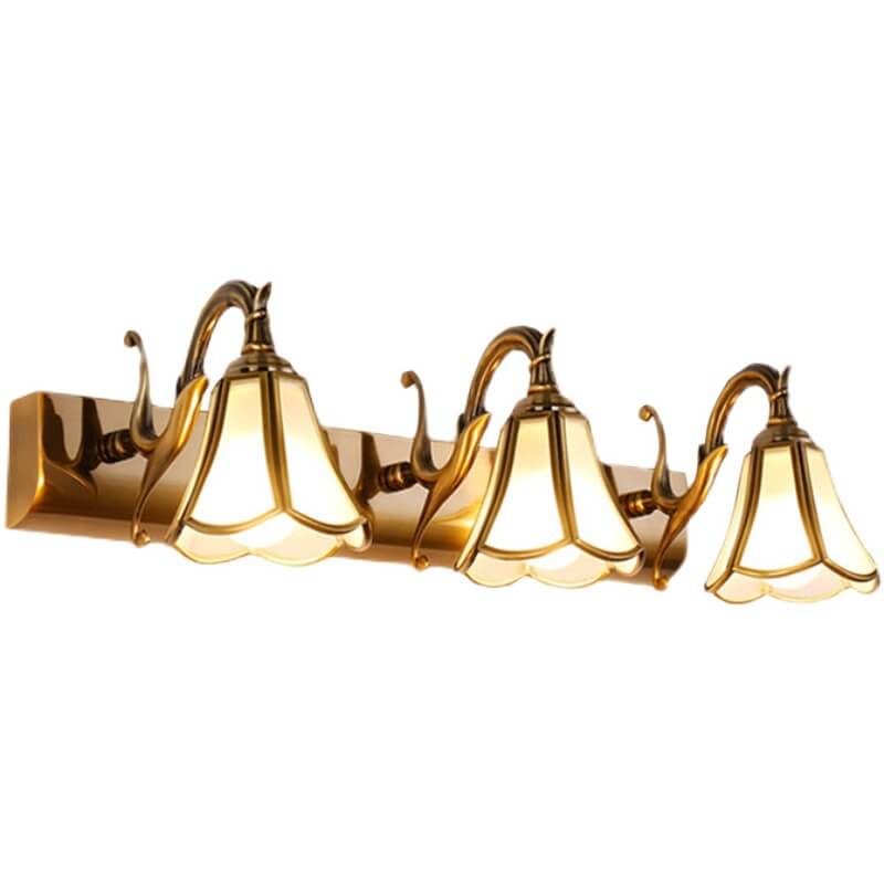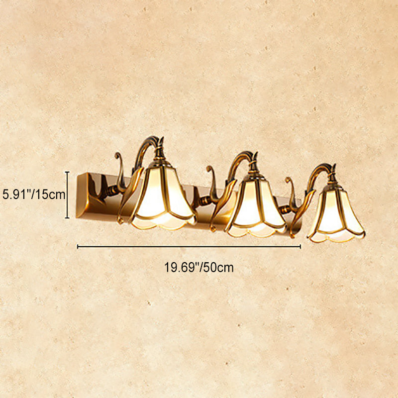 مرآة حمام بثلاثة مصابيح على شكل زهرة بإطار من النحاس الأوروبي التقليدي، مصباح جداري أمامي للحمام