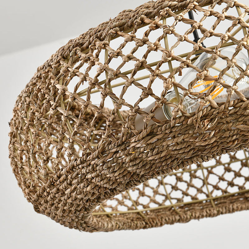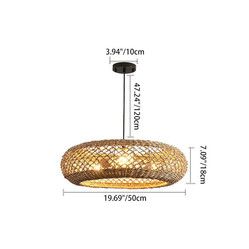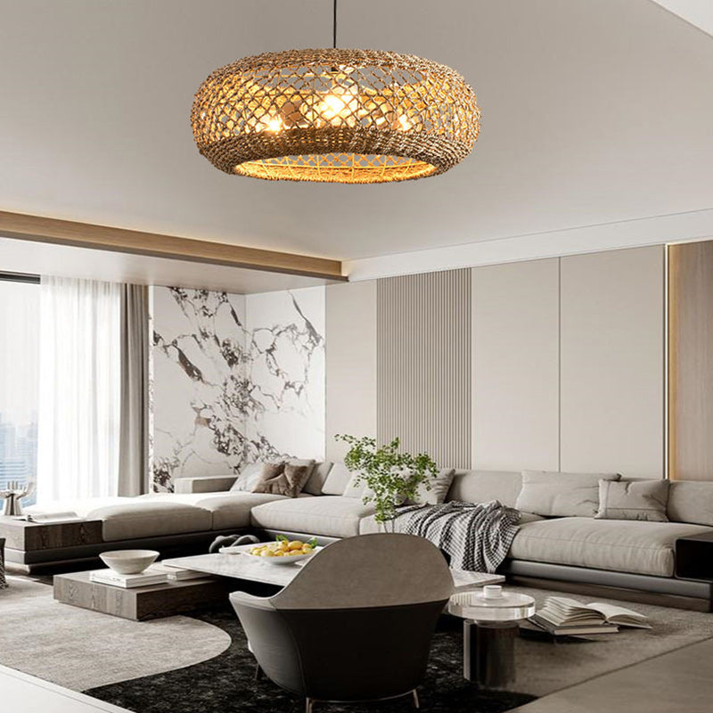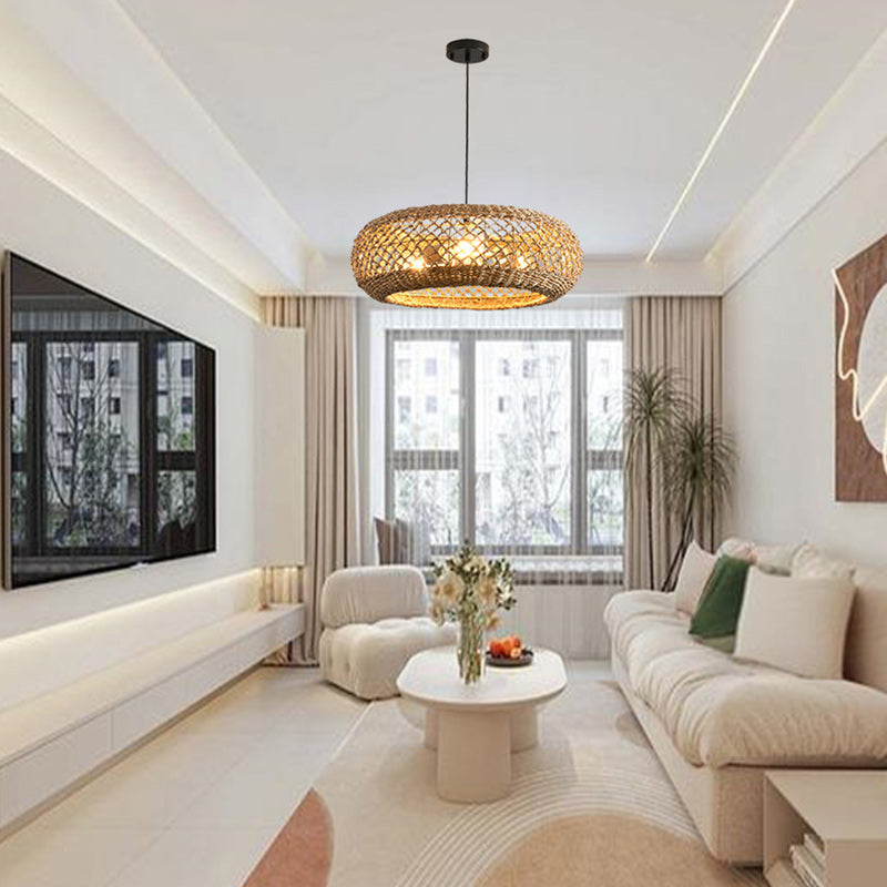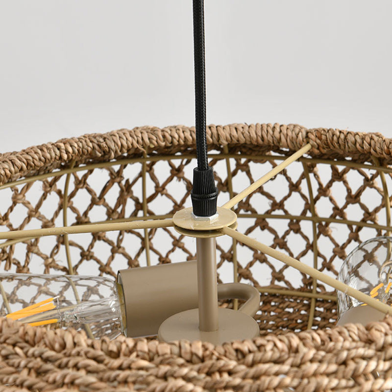 مصباح معلق دائري من الحديد بثلاثة مصابيح لغرفة المعيشة مصنوع من نسيج الروطان الريفي التقليدي