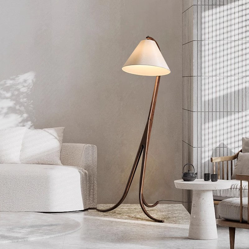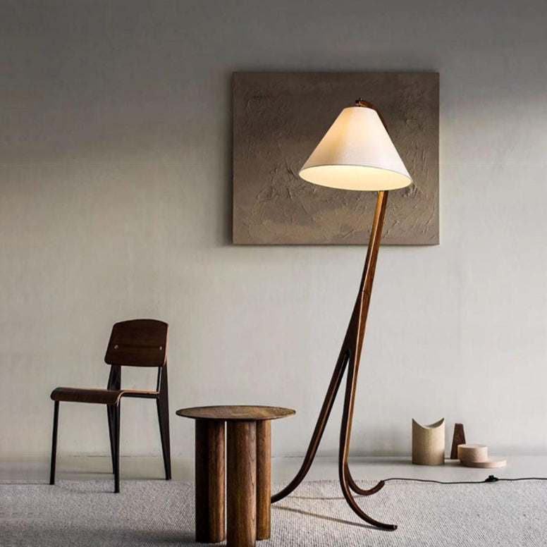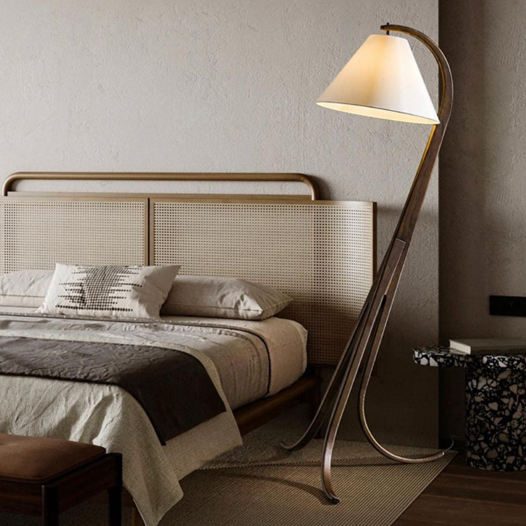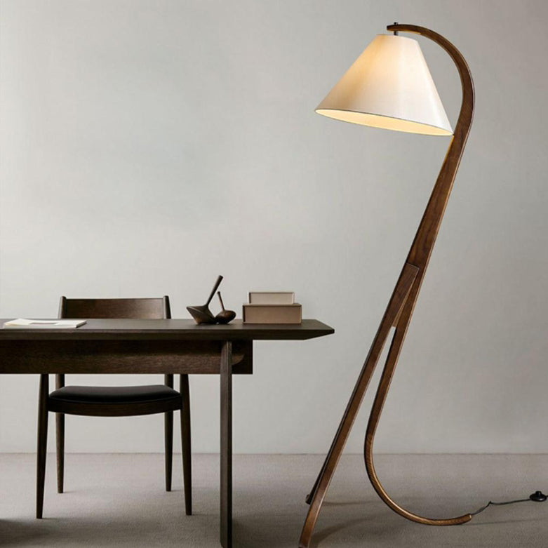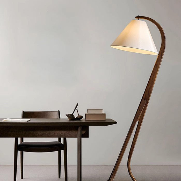 Traditional Japanese Conical Fabric Shade Arc Solid Wood 1-Light Standing Floor Lamp For Living Room